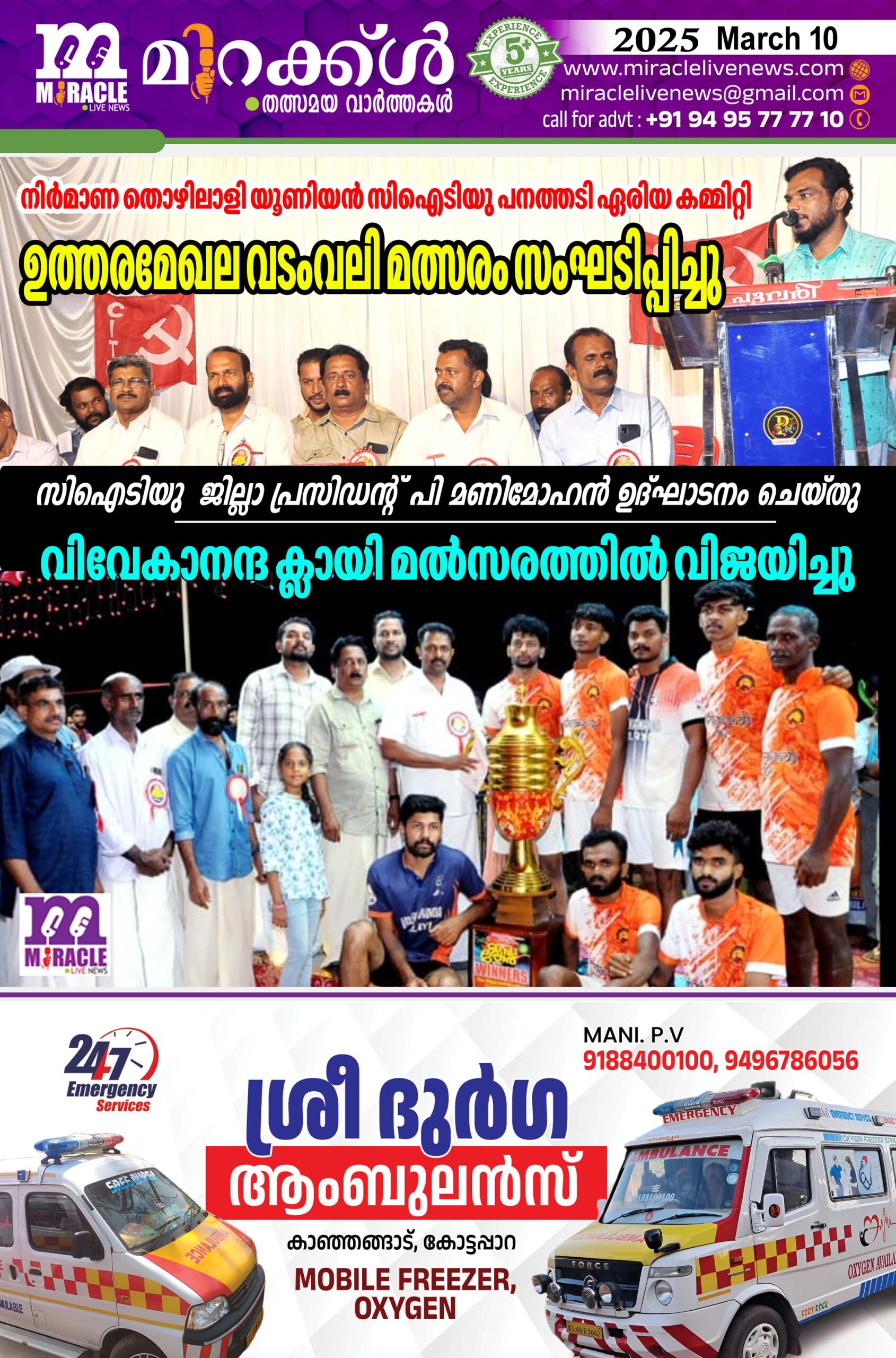 വിവേകാനന്ദ ക്ലായി മല്സരത്തില് വിജയിച്ചു.കൊസാംബി ബേത്തൂര്പ്പാറ രണ്ടാംസ്ഥാനം നേടി.
