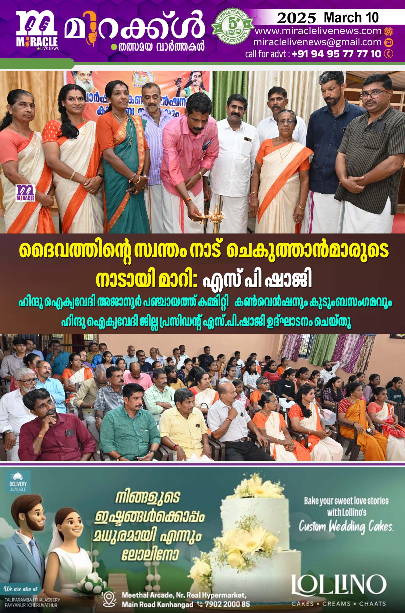 മാവുങ്കാല്:ഹിന്ദുവിന്റെ ആചാര അനുഷ്ടാനങ്ങളെ അവഹേളിക്കുകയും, അടിച്ചമര്ത്തുകയും ചെയ്യുന്ന ഒരു ഭരണകൂടമാണ് കേരളം ഭരിക്കുന്നത്,പ്രയാഗ് രാജില് നടന്ന 66 കോടി ഭക്തജനങ്ങള് പങ്കടുത്ത മഹാകുംഭമേളയെ അടക്കം അവഹേളിക്കുന്ന നിലപാടാണ് ഇവിടെത്തെ രാഷ്ട്രീയ പാര്ട്ടികള് സ്വീകരിക്കുന്നത് ഹിന്ദുസമൂഹം അത് തിരിച്ചറിയണമെന്നും ഹിന്ദു ഐക്യവേദി അജാനൂര് പഞ്ചായത്ത് കമ്മിറ്റി സംഘടിപ്പിച്ച കണ്വെന്ഷനും കുടുംബസംഗമവും ഉദ്ഘാടനം ചെയ്തു ഹിന്ദു ഐക്യവേദി ജില്ല പ്രസിഡന്റ് എസ്.പി.ഷാജി പറഞ്ഞു.ലഹരിയുടെ ഉപയോഗം മൂലം ഇന്ന് നടക്കുന്ന അതിക്രൂരമായ പിഡനങ്ങള് മുതല് കൊല്ലപാതകം വരെയുള്ള കാര്യങ്ങള്ക്ക് ദിനം പ്രതി കേള്ക്കുമ്പോള് ദൈവത്തിന്റെ സ്വന്തം നാട് ചെകുത്താന്മാരുടെ നാടായി എന്ന് പറഞ്ഞാല് അത് അതിശയോക്തി ഒന്നും തന്നെ ഇല്ല എന്നും അദ്ദേഹം കൂട്ടിച്ചേര്ത്തു. മാവുങ്കാല് വ്യാപാര ഭവനില് നടന്ന യോഗത്തില് ഹിന്ദു ഐക്യവേദി പഞ്ചായത്ത് പ്രസിഡന്റ് നീലകണ്ഠന് അദ്ധ്യക്ഷം വഹിച്ചു. ഹിന്ദു ഐക്യവേദി സംഘടന ജില്ല സെക്രട്ടറി വി.സുധാകരന് മുഖ്യപ്രഭാഷണം നടത്തി. ഹിന്ദു ഐക്യവേദി ജില്ല വര്ക്കിംങ്ങ് പ്രസിഡന്റ് തച്ചങ്ങാട് ഗോപാലകൃഷ്ണന്,സക്ഷമ ജില്ല വൈസ് പ്രസിഡന്റ് ഗീത ബാബുരാജ് എന്നിവര് സംസാരിച്ചു. വിവിധ മേഖലകളില് പ്രാഗല്ഭ്യം തെളിയിച്ച കലാ-കായിക പ്രതിഭകളെ ഹിന്ദു ഐക്യവേദി ജില്ല സെക്രട്ടറി അഡ്വ എ. മണികണ്ഠന് ഉപഹാരം നല്കി ആദരിച്ചു. ഹിന്ദു ഐക്യവേദി പഞ്ചായത്ത് സെക്രട്ടറി മഞ്ജുഷ സ്വാഗതവും ജോ: സെക്രട്ടറി ശശി തായങ്കട നന്ദിയും പറഞ്ഞു. തുടര്ന്ന് വിവിധ കലാപരിപാടികളും അരങ്ങേറി.