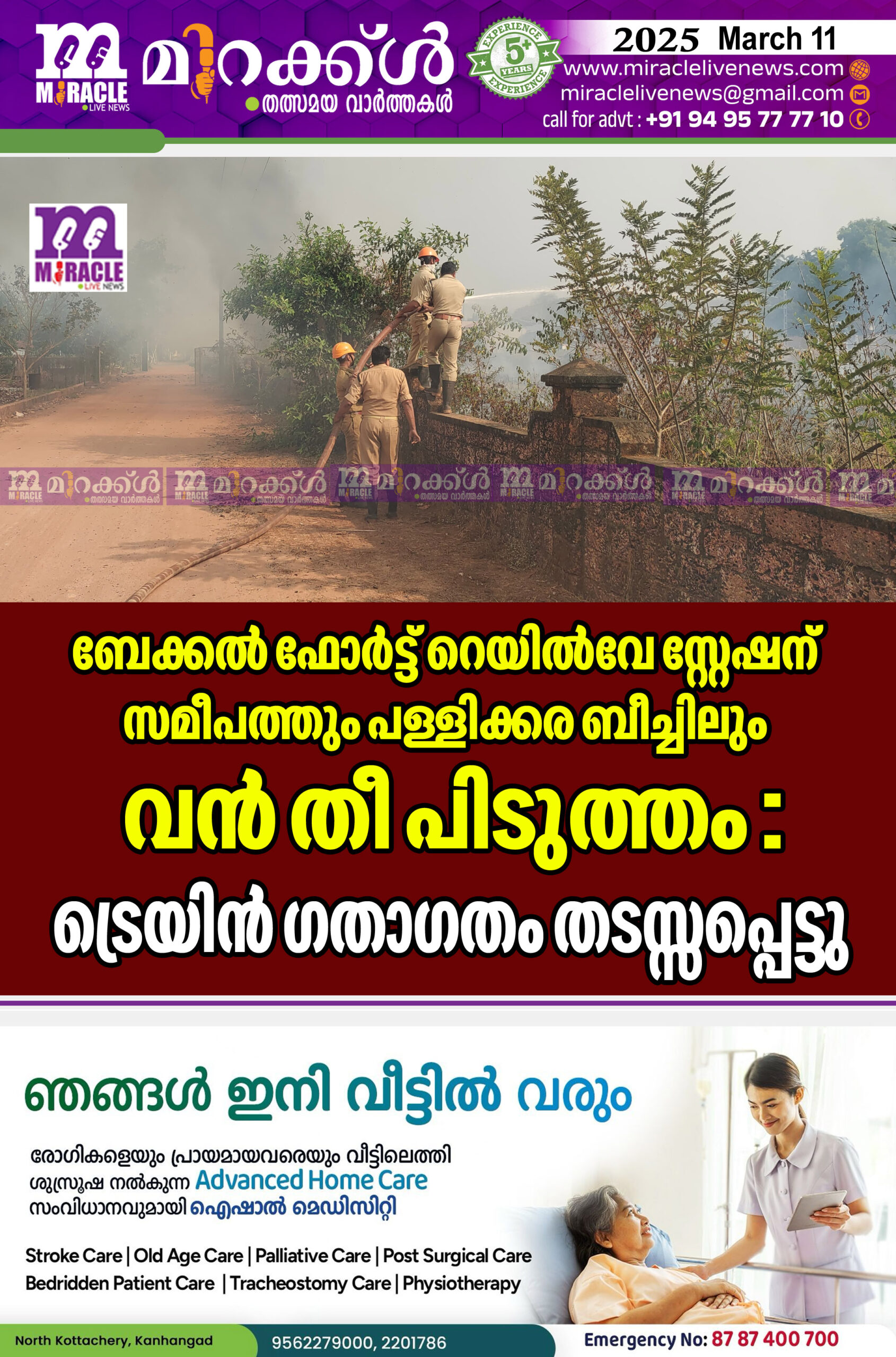 ബേക്കല് :ബേക്കല് ഫോര്ട്ട് റെയില്വേ സ്റ്റേഷന് സമീപത്തും പള്ളിക്കര ബീച്ചിലും വന് തീ പിടുത്തം . തിങ്കളാഴ്ച രാവിലെ എട്ടു മണിയോടെ ആരംഭിച്ച തീ പിടുത്തം ഉച്ചക്ക് 12 മണിവരെ നീണ്ടു നിന്നു. പള്ളിക്കര ബീച്ചില് കൂട്ടിയിട്ടിരുന്ന പ്ലാസ്റ്റിക് മാലിന്യങ്ങള്ക്കടക്കം ആരോ തീയിടുകയായിരുന്നു . തീ ആളിപ്പടര്ന്ന് ബേക്കല് ഫോര്ട്ട് റെയില്വേ സ്റ്റേഷന് സമീപം വരെ എത്തി. റെയില്വേ ജോലിയുടെ ഭാഗമായി മുറിച്ചിട്ട അക്കെഷ്യ കാറ്റാടി മര ഉരുപ്പടികള് അടക്കം കത്തി നശിച്ചു. പുക ഉയര്ന്നതിനെ തുടര്ന്ന് കാഴ്ച മറഞ്ഞതോടെ മണിക്കൂറുകളോളമാണ് ഗതാഗതം തടസപ്പെട്ടത്. കാഞ്ഞങ്ങാട് നിന്ന് ഫയര് ഫോഴ്സ് എത്തി ഏറെ നേരത്തെ പരിശ്രമത്തിനൊടുവിലാണ് തീ അണച്ചത്.