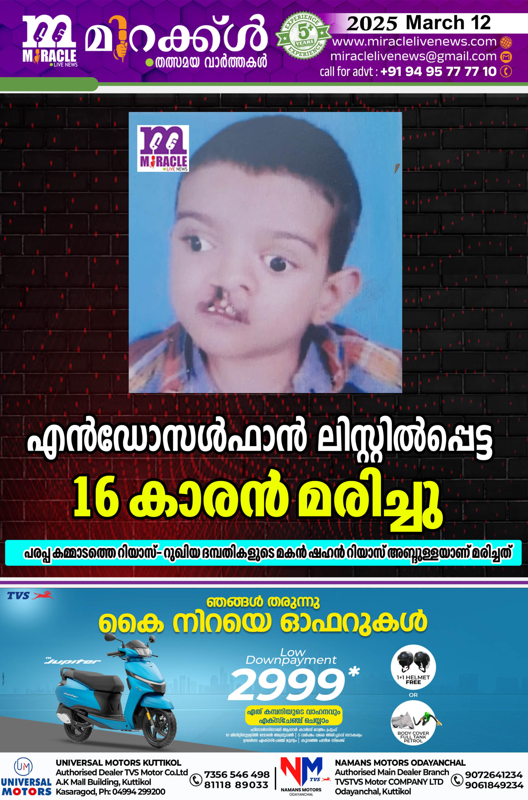 എന്‍ഡോസള്‍ഫാന്‍ ലിസ്റ്റില്‍പ്പെട്ട 16 കാരന്‍ മരിച്ചു; പരപ്പ കമ്മാടത്തെ റിയാസ്- റുഖിയ ദമ്പതികളുടെ മകന്‍ ഷഹന്‍ റിയാസ് അബ്ദുള്ളയാണ് മരിച്ചത്