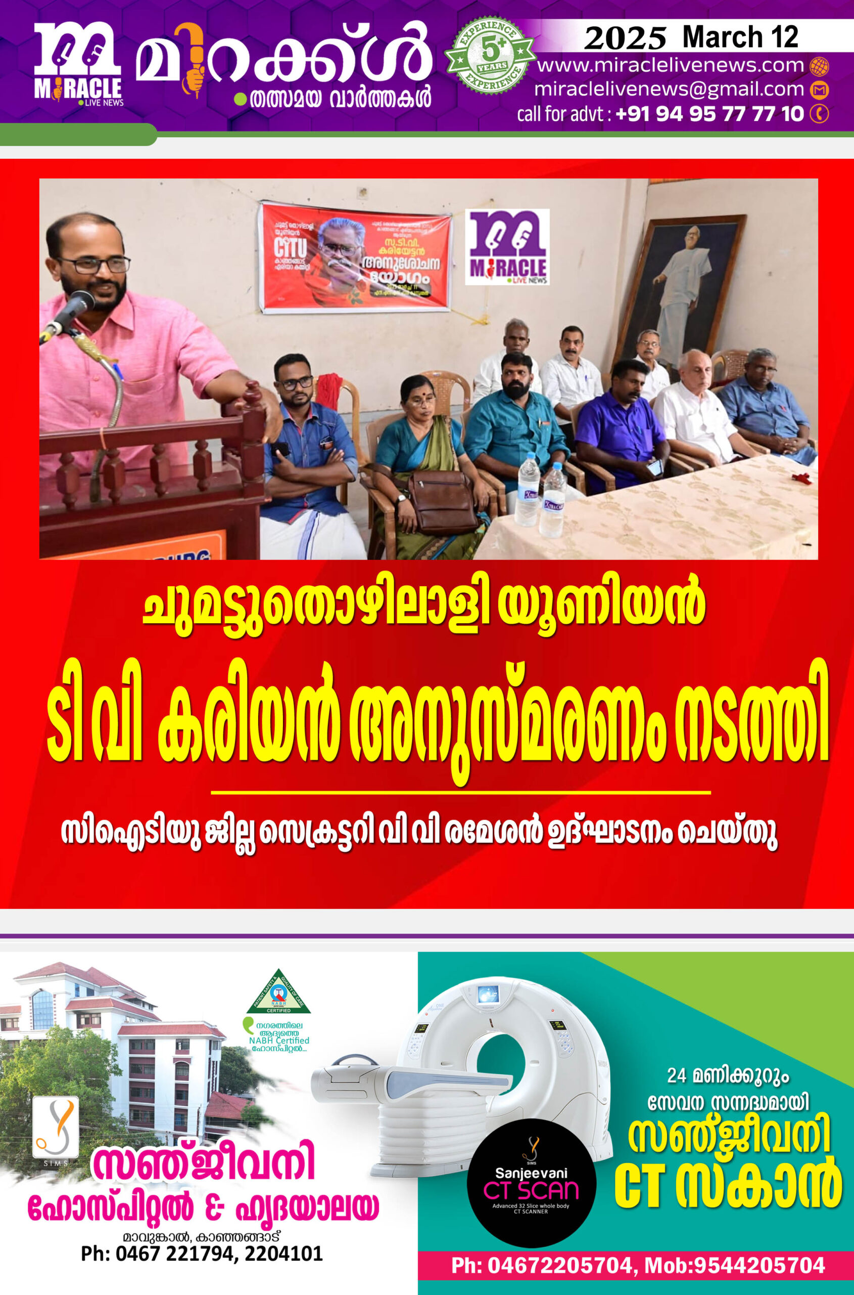 കാഞ്ഞങ്ങാട്:ചുമട്ടുതൊഴിലാളി യൂണിയന് ഏരിയ പ്രസിഡന്റ് പദവിയില് ഇരിക്കെ ഹൃദയാഘാതത്തെ തുടര്ന്ന് അകാലത്തില് മരണമടഞ്ഞ ജനകീയനായ ടി വി കരിയന്റെ നിര്യാണത്തില് അദ്ദേഹം നേതൃത്വം കൊടുത്ത ചുമട്ടുതൊഴിലാളി യൂണിയന് (സിഐടിയു)അനുസ്മരണയോഗം നടത്തി. സിപിഎം കാഞ്ഞങ്ങാട് ഏരിയ കമ്മിറ്റി അംഗം ,പുല്ലൂര് പെരിയാ പഞ്ചായത്ത് അംഗം എന്നീ നിലകളില് പ്രവര്ത്തിച്ചുകൊണ്ടിരിക്കുകയാണ് അക്കാലത്ത് ടി വി കരിയന് മരണമടഞ്ഞത്.കുന്നുമ്മല് എന്എസ്എസ് ഹാളില് നടന്ന അനുസ്മരണയോഗം സിഐടിയു ജില്ല സെക്രട്ടറി വി വി രമേശന് ഉദ്ഘാടനം ചെയ്തു.ഏരിയ ട്രഷറര് കെ ഗംഗാധരന് അധ്യക്ഷനായി.യൂണിയന് ,സിഐടിയു സംസ്ഥാന ജില്ലാ നേതാക്കന്മാരായ വി വി പ്രസന്നകുമാരി, പി അപ്പുക്കുട്ടന്,നാരായണന് തെരുവത്ത്,കോടാട്ട് കൃഷ്ണന്, കെ ചന്ദ്രന്,യൂണിയന് ജില്ലാ ജനറല് സെക്രട്ടറി കെ മോഹനന്,ജില്ലാ കമ്മിറ്റി അംഗങ്ങളായ പി കാര്യമ്പു,അനില് ഗാര്ഡര് വളപ്പ് എന്നിവര് സംസാരിച്ചു.യൂണിയന് ഏരിയ സെക്രട്ടറി കെ. ടി കുഞ്ഞിമുഹമ്മദ്സ്വാഗതംപറഞ്ഞു.