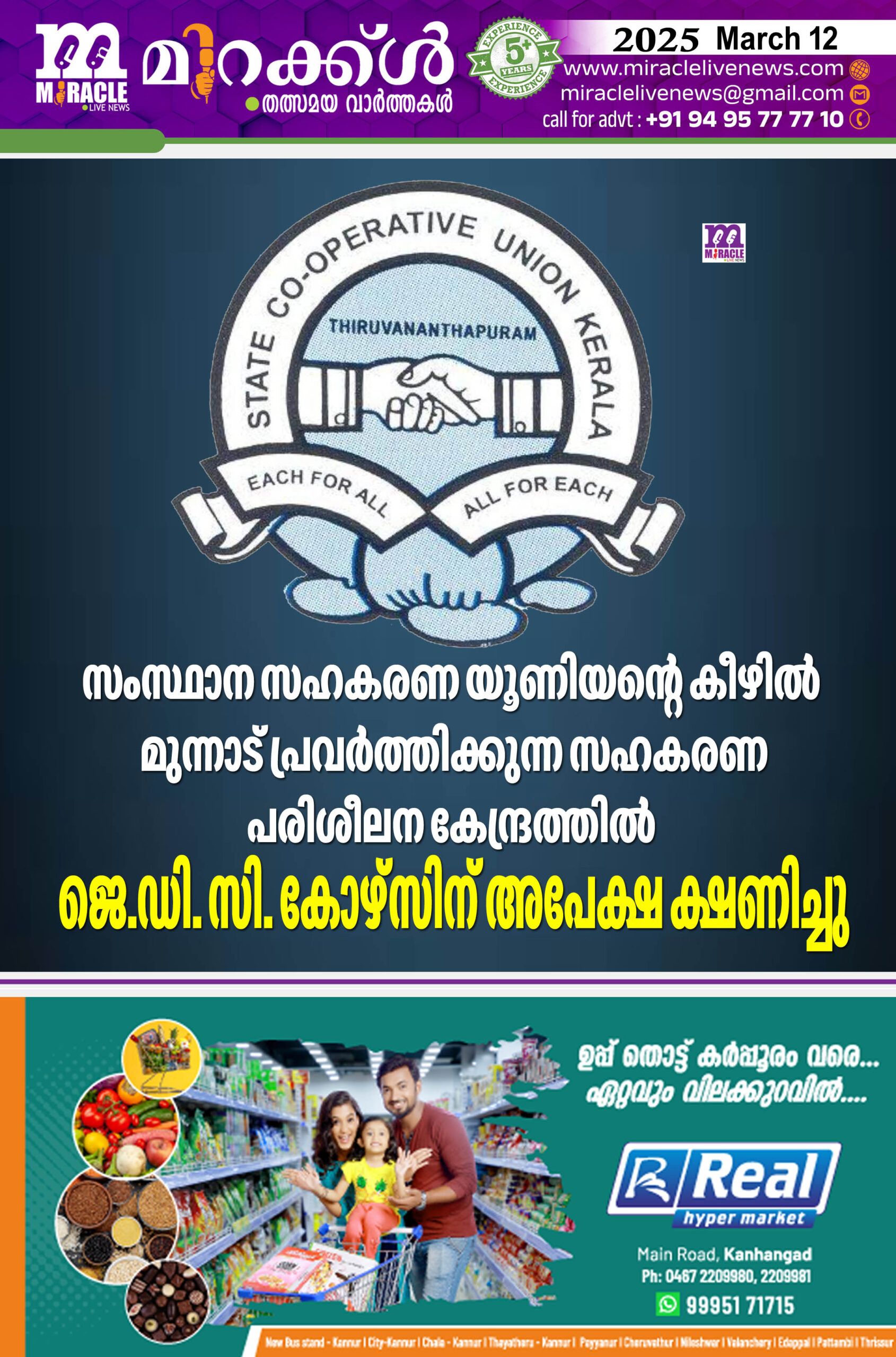 സംസ്ഥാന സഹകരണ യൂണിയന്റെ കീഴില്‍ മുന്നാട് പ്രവര്‍ത്തിക്കുന്ന സഹകരണ പരിശീലന കേന്ദ്രത്തില്‍ ജെ.ഡി. സി. കോഴ്‌സിന് അപേക്ഷ ക്ഷണിച്ചു