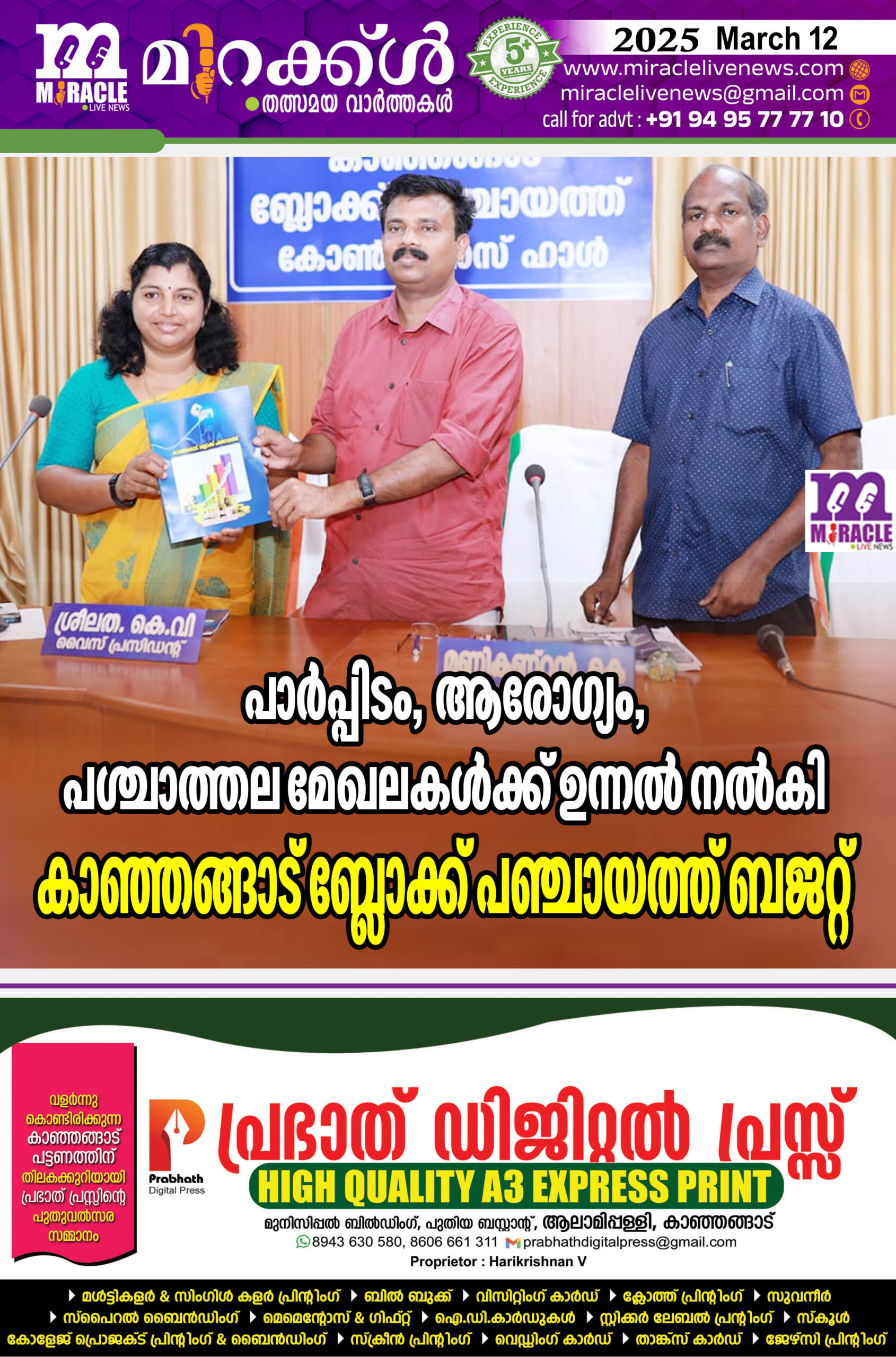 കാഞ്ഞങ്ങാട് : ബ്ലോക്ക് പഞ്ചായത്തിന്റെ 2025 -26ബജറ്റ് വൈസ് പ്രസിഡന്റ് കെ വി ശ്രീലത അവതരിപ്പിച്ചു. 2025-26 വര്ഷത്തെ ബജറ്റില് സംസ്ഥാന കേന്ദ്ര പദ്ധതി വിഹിതവും, ദേശിയ ഗ്രാമീണ തൊഴിലുറപ്പ് പദ്ധതി വിഹിതവും, ബ്ലോക്ക് പഞ്ചായത്ത് തനതു ഫണ്ടും ഉള്പ്പെടെ 59കോടി 76 ലക്ഷത്തി 78 ആയിരത്തി 544 രൂപ വരവും 59 കോടി 14 ലക്ഷത്തി ഇരുപതിനായിരം രൂപ ചെലവും 62 ലക്ഷത്തി ആയിരത്തി 544 രൂപ മിച്ചവും പ്രതീക്ഷികുന്നു. എല്ലാ മേഖലയ്ക്കും തുല്യ പ്രാധാന്യം നല്കി സന്തുലിത വികസന ലക്ഷ്യം ഫലപ്രാപ്തിയില് എത്തിക്കുന്നതിന് പദ്ധതികള് ആവിഷ്ക്കരി കുക്കയും തുക ‘ നീക്കി വയ്ക്കുകയും ഭക്ഷണം ബജറ്റാണ് അവതരിപ്പിച്ചത്.