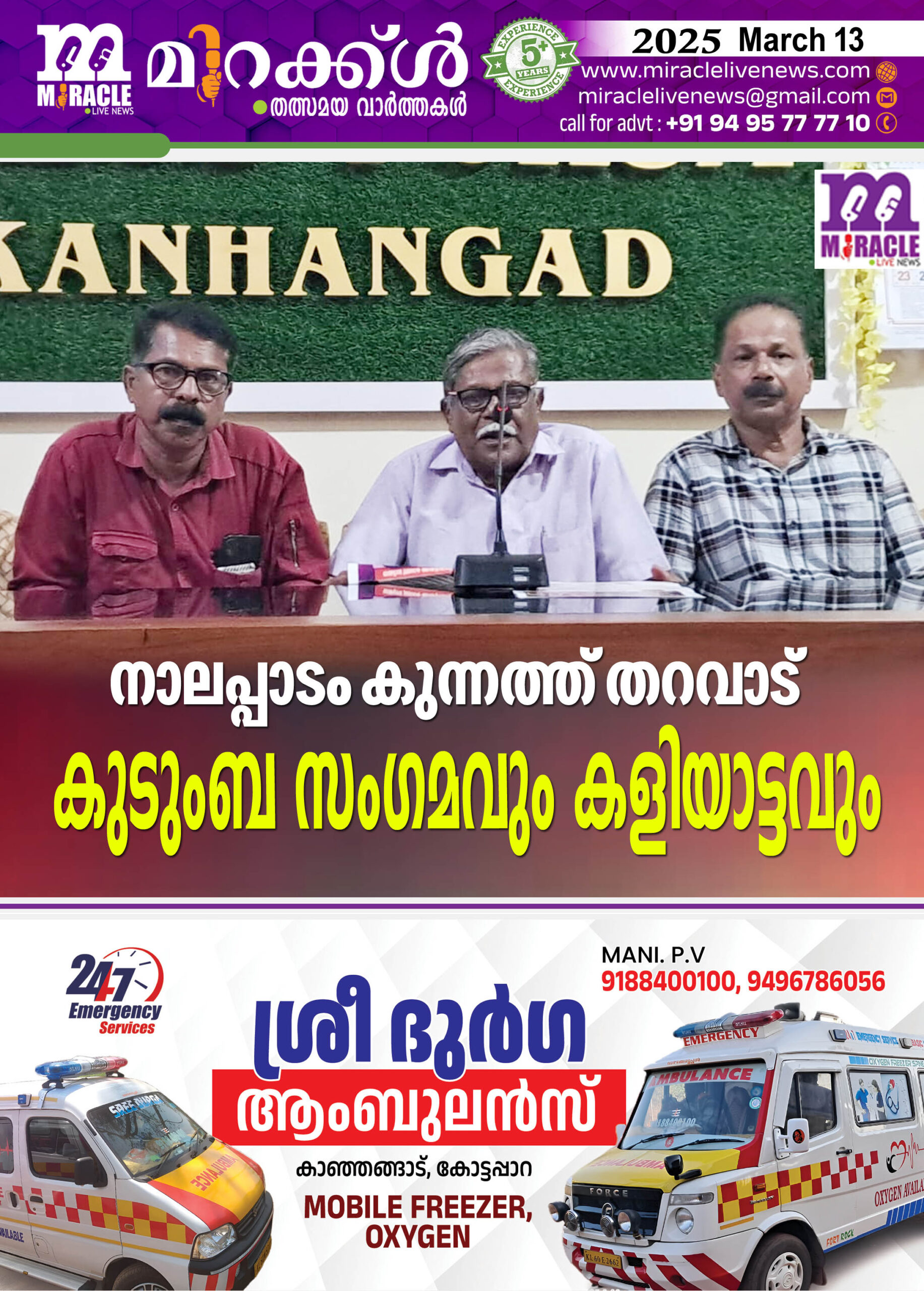 കാഞ്ഞങ്ങാട് : കിഴക്കുംകര നാലപ്പാലം കുന്നത്ത് തറവാട് കളിയാട്ട മഹോത്സവവും കുടുംബ സംഗമവും മാര്ച്ച് 14,15, 16 തീയ്യതികളില് നടക്കുമെന്ന് ആഘോഷ കമ്മിറ്റി ഭാരവാഹികള് വാര്ത്ത സമ്മേളനത്തില് അറിയിച്ചു. 14 ന് വൈകിട്ട് നടക്കുന്ന കുടുംബ സംഗമം അജാനൂര് ഗ്രാമപഞ്ചായത്ത്