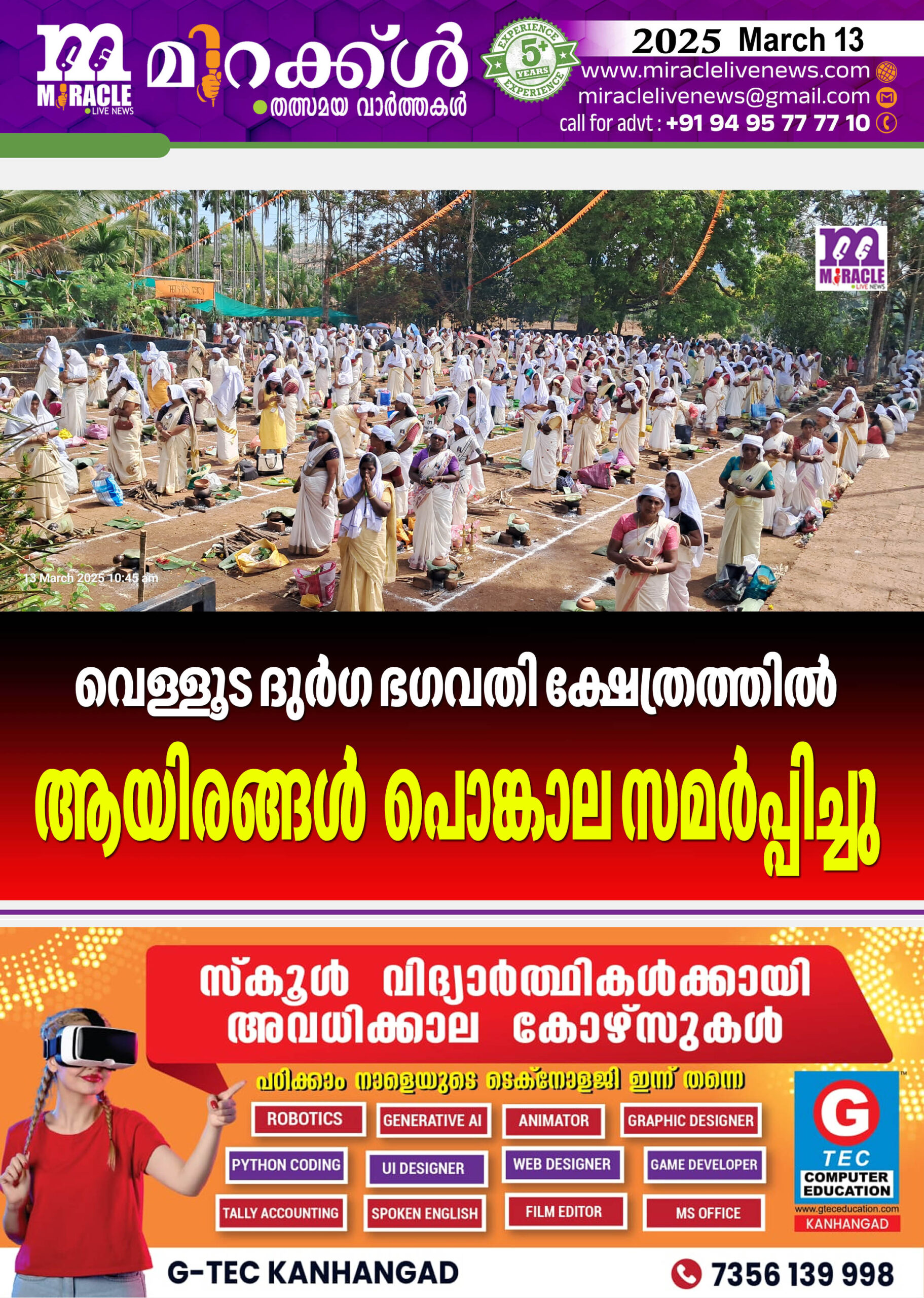 കോട്ടപ്പാറ: സകല ദുരിത നിവാരണത്തിനും, സര്വ്വൈശ്വര്യങ്ങള്ക്കുമായി ഭക്തസഹസ്രങ്ങളുടെ സമര്പ്പണമായി മാറി വെള്ളൂട ദുര്ഗ ഭഗവതി ക്ഷേത്രത്തിലെ പൊങ്കാല മഹോല്സവം. രാവിലെ 9.30 ന് ബ്രഹ്മശ്രീ മേക്കാട്ട് പത്മനാഭ ഭട്ടേരി പൊങ്കാല അടുപ്പില് ദീപം പകര്ന്നു. മനസ്സും ശരീരവും ശുദ്ധിയായി സൂക്ഷിച്ച് ചൂട്ടുപൊള്ളുന്ന വെയിലിലും ആയിരത്തിലധികം സ്ത്രീ ജനങ്ങളാണ് ദേവിക്ക് പൊങ്കാല സമര്പ്പിച്ചത്. ആഘോഷ കമ്മറ്റി ചെയര്മാന് പി ദാമോധര പണിക്കര്, കണ്വീനര് പ്രഭാകരന് തോന്നിക്കല്ല് , ട്രഷറര് സതീശന് ഗതിക്കുണ്ട്, , ക്ഷേത്രം പ്രസിഡന്റ് രാജന് കാരാക്കോട്, സെക്രട്ടറി കുഞ്ഞിക്കണ്ണന് കാനത്തില് , ട്രഷറര് വേണു കാനത്തില്, രക്ഷാധികാരിമാരായ ടി വി ഭാസ്കരന് , കുഞ്ഞിരാമന് കാനത്തില് എന്നിവര് നേതൃത്വം നല്കി.