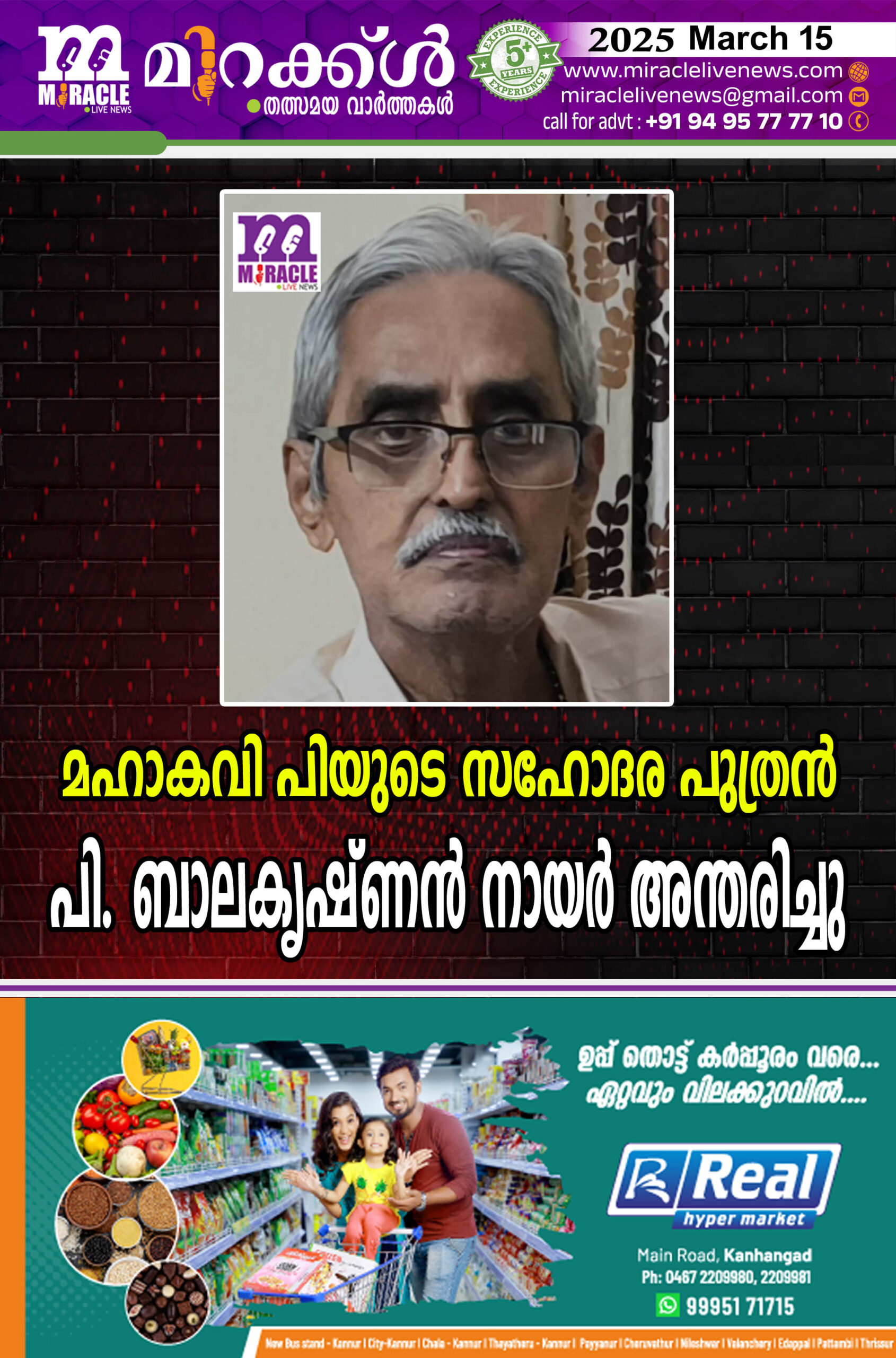 മഹാകവി പി യുടെ സഹോദര പുത്രന് പി. ബാലകൃഷ്ണന് നായര് അന്തരിച്ചു