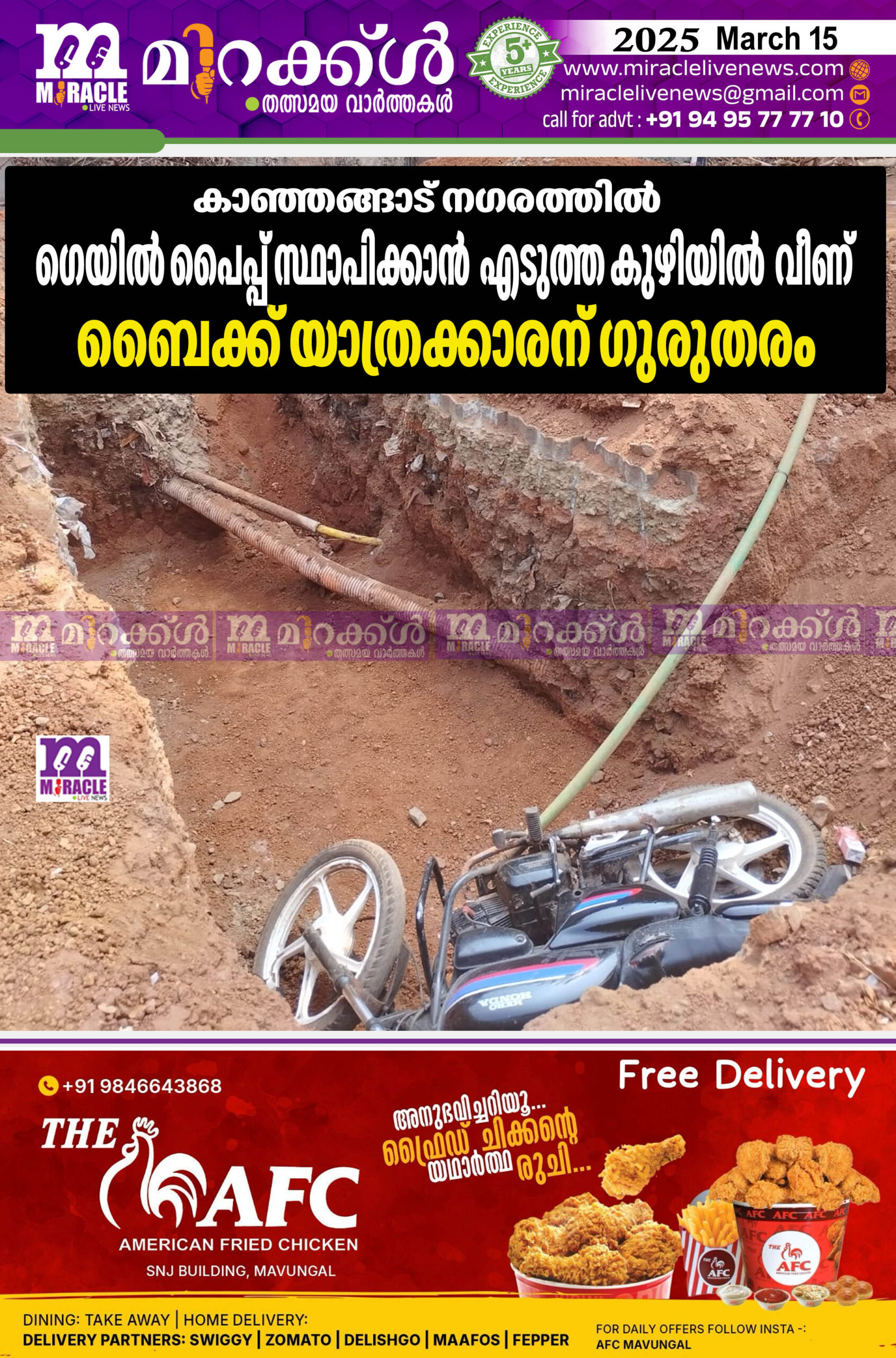 കാഞ്ഞങ്ങാട് നഗരത്തില്‍ ഗെയില്‍ പൈപ്പ് സ്ഥാപിക്കാന്‍ എടുത്ത കുഴിയില്‍ വീണ് ബൈക്ക് യാത്രക്കാരന് ഗുരുതരം