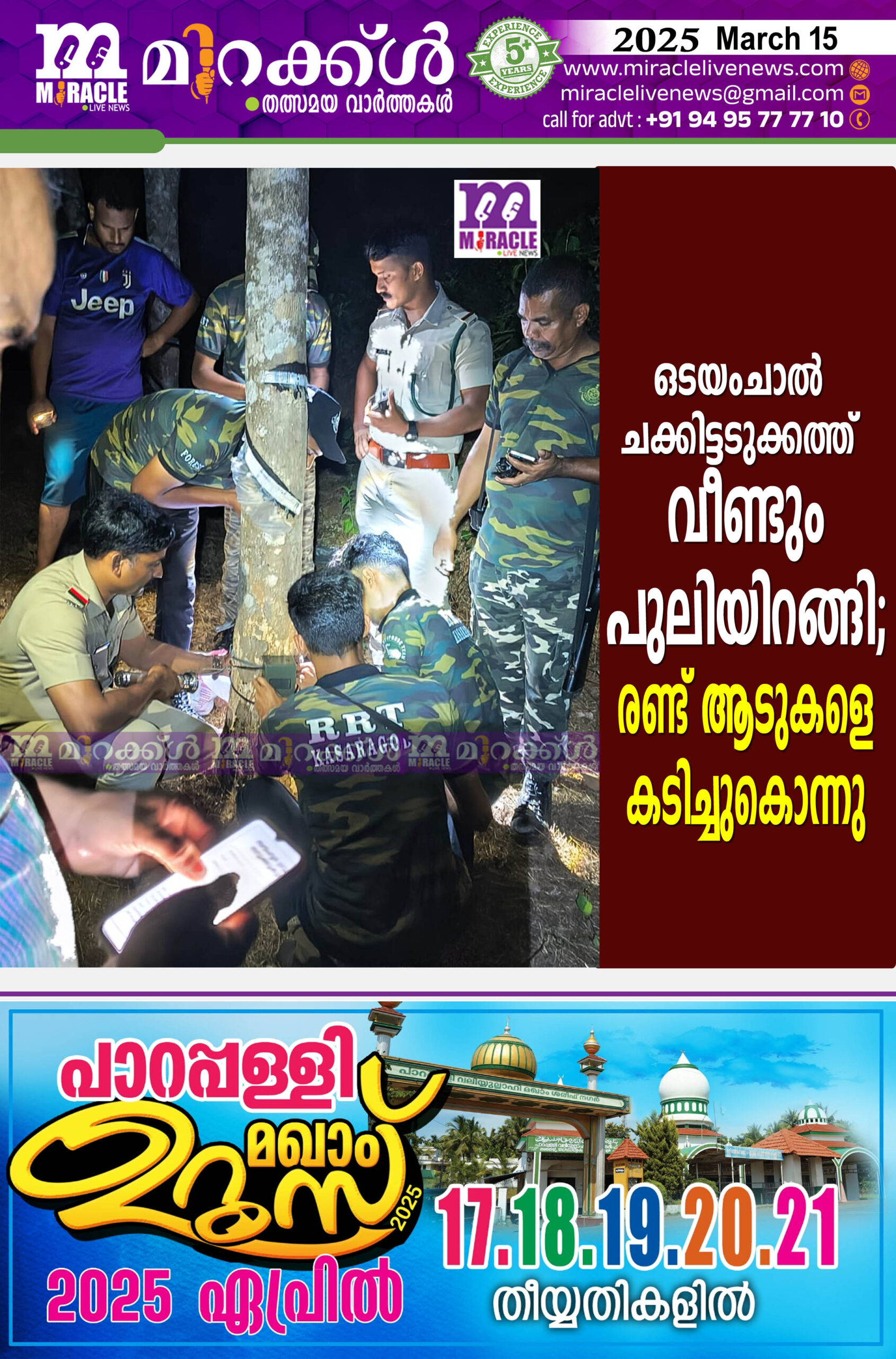 രാജപുരം: ഒടയംചാല് ചക്കിട്ടടുക്കത്ത് വീണ്ടും പുലിയിറങ്ങി. പറമ്പില് കെട്ടിയിരുന്ന രണ്ട് ആടുകളെ കടിച്ചുകൊന്നു. ചക്കിട്ടടുക്കം വിജയന്റെ ആടുകളെയാണ് കടിച്ചു കൊന്നത്. വീടിന് 200 മീറ്റര് അകലെയുള്ള പറമ്പില് ആടുകളെ തീറ്റ തേടാനായി കെട്ടിയിട്ടതായിരുന്നു. വിവരമറിഞ്ഞ് നാട്ടുകാര് വനംവകുപ്പ് അധികൃതരെ വിവരമറിയിച്ചു.