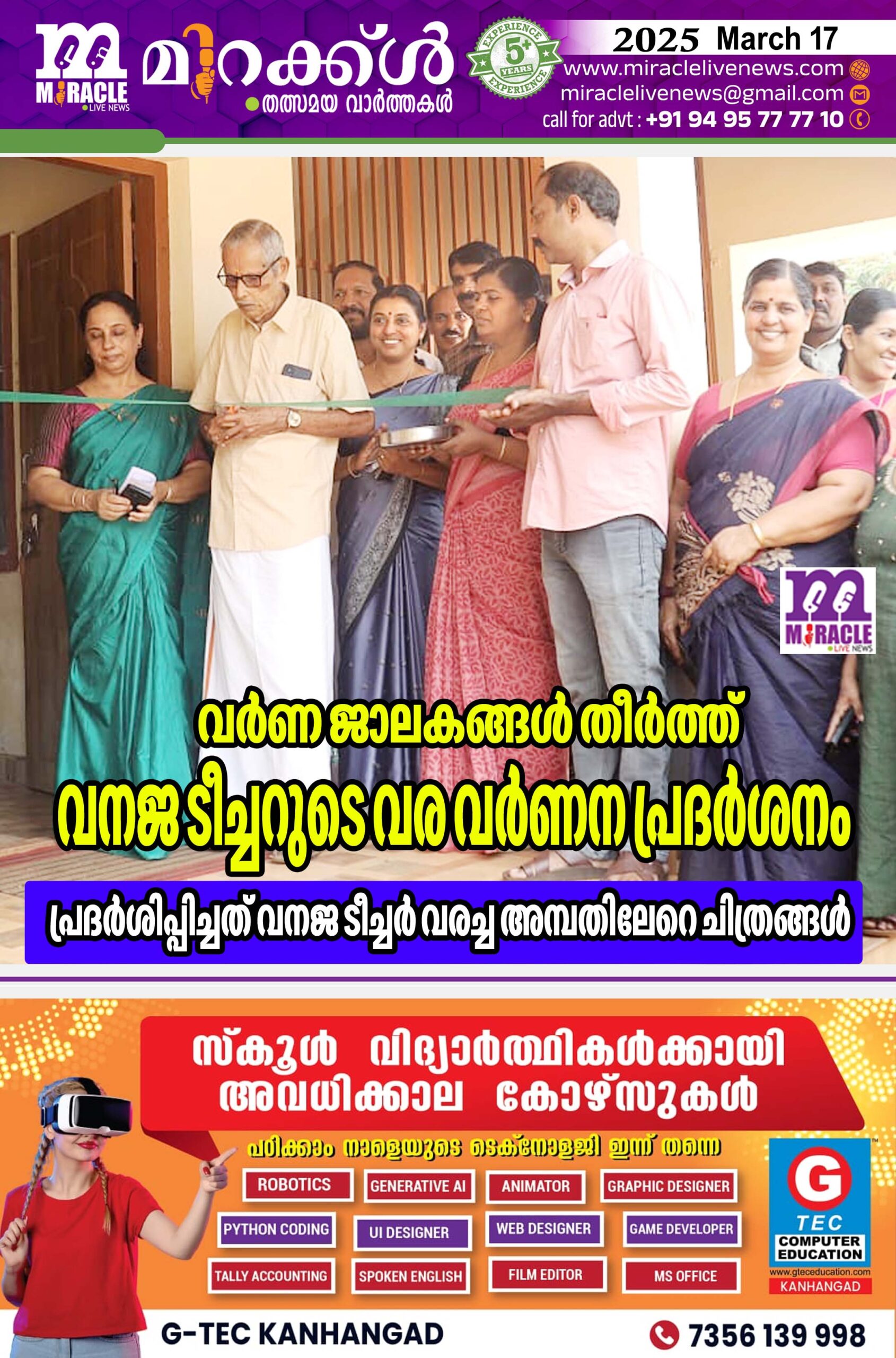 കുറ്റിക്കോല് : വരയുടെ വിസ്മയങ്ങള് തീര്ത്ത് വനജ ടീച്ചറുടെ ചിത്രജാലകങ്ങള്. കുറ്റിക്കോല് എ.യു.പി സ്കൂള് സീനീയര് അനിസ്റ്റന്റ് കെ..വനജ കുമാരിയുടെ ചിത്രങ്ങളാണ് ശ്രദ്ധേയമായത്. വര്ണ ചിത്രങ്ങളും വരകളുമായി അമ്പതിലേറെ ചിത്രങ്ങള് വിവിധ തലങ്ങളെ സ്പര്ശിക്കുന്നു. തന്റെ ജോലിക്ക് ശേഷം കിട്ടുന്ന സമയം വരക്കായി മാറ്റിവെക്കുകയാണ് ടീച്ചര്. വരച്ച ചിത്രങ്ങളെ ഫ്രെയിമിലാക്കി മനോഹര മാക്കുന്നു.