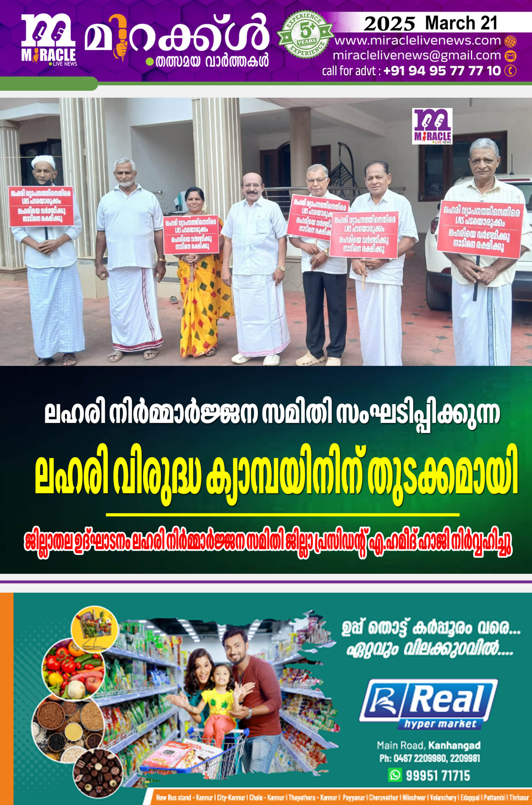 കാഞ്ഞങ്ങാട്:ലഹരി നിര്മ്മാര്ജ്ജന സമിതി സംസ്ഥാന കമ്മിറ്റിയുടെ ആഹ്വാന പ്രകാരം നടത്തുന്ന ലഹരി വിരുദ്ധ ക്യാമ്പായിനിന്റെ കാസര്ഗോഡ് ജില്ല തല ഉദ്ഘാടനം കാഞ്ഞങ്ങാട്ട് നടന്നു. സമിതിയുടെ സംസ്ഥാന വൈസ് പ്രസിഡണ്ടും ജില്ല അദ്ധ്യക്ഷനുമായ എ.ഹമീദ് ഹാജി ഉല്ഘാടനം നിര്വ്വഹിച്ചു. ലഹരി യുവ സമൂഹത്തെ നശിപ്പിക്കുന്ന വിപത്തായി മാറിയിരിക്കുകയാണെന്നും,ഇതിനെതിരെ സമൂഹത്തിന്റെ ജാഗ്രത ഉണ്ടാവണമെന്ന് എ.ഹമീദ് ഹാജി തന്റെ ഉല്ഘാടന പ്രസംഗത്തില് പറഞ്ഞു. മാര്ച്ച് 20 മുതല് ഏപ്രില് 20 വരെയാണ് ജില്ല വിവിധ ഭാഗങ്ങളിലായി ക്യാമ്പായിന് നടക്കുന്നത്