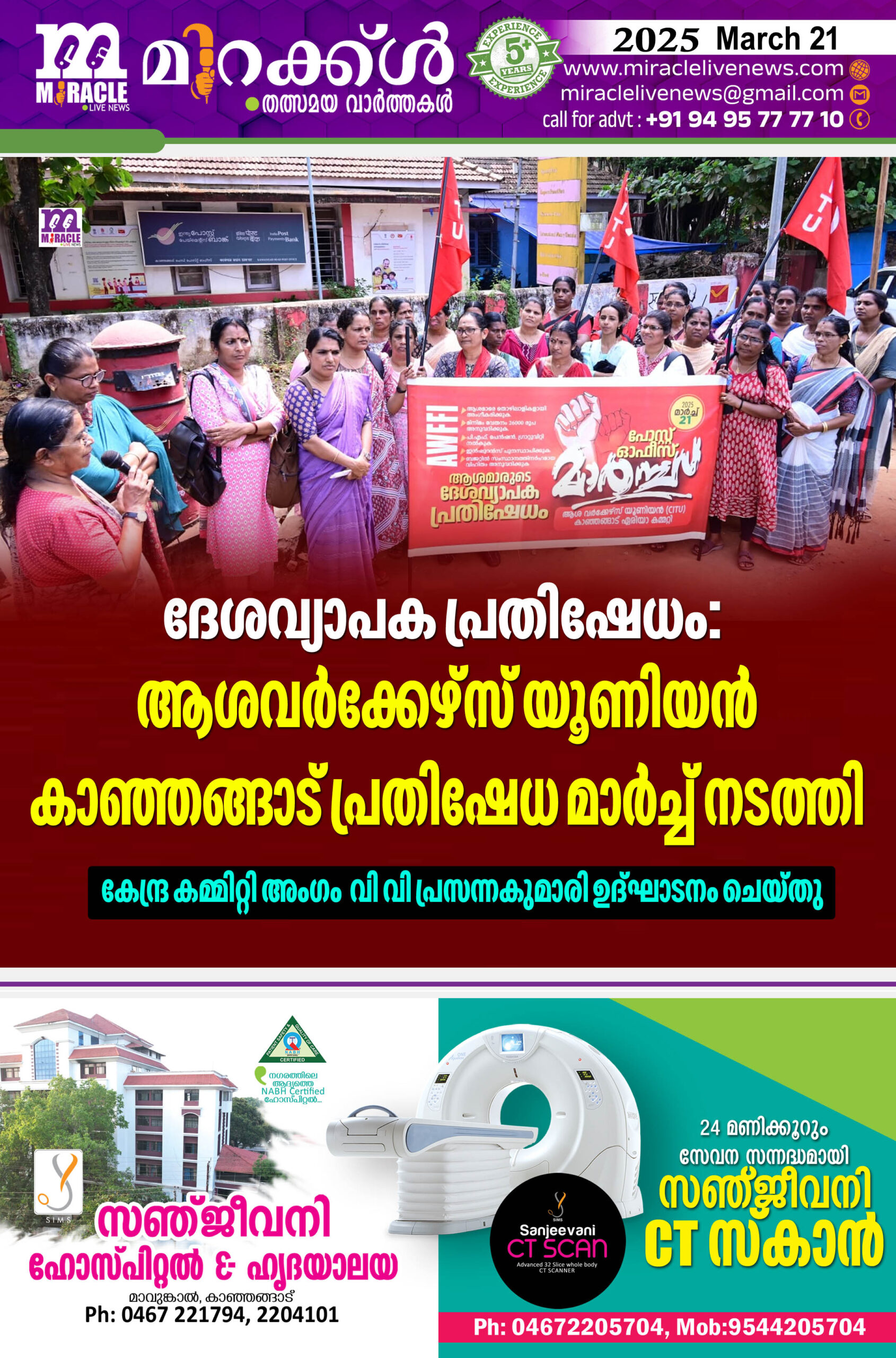കാഞ്ഞങ്ങാട്: ആശപ്രവര്‍ത്തകരെ തൊഴിലാളികളായി അംഗീകരിക്കുക,മിനിമം വേതനം 26000 രൂപ അനുവദിക്കുക,പി എഫ് പെന്‍ഷന്‍ ഗ്രാറ്റുവിറ്റി എന്നിവ അനുവദിക്കുക,ഇന്‍ഷുറന്‍സ് പുനസ്ഥാപിക്കുക,ബഡ്ജറ്റില്‍ സംസ്ഥാനത്തിന് അര്‍ഹമായ വിഹിതം അനുവദിക്കുക തുടങ്ങിയ ആവശ്യങ്ങള്‍ ഉന്നയിച്ച് ആശവര്‍ക്കര്‍സ് യൂണിയന്‍(സിഐടിയു)ദേശീയ പ്രക്ഷോഭത്തിന്റെ ഭാഗമായി കാഞ്ഞങ്ങാട് പ്രതിഷേധ പ്രതിഷേധ മാര്‍ച്ചും ധര്‍ണ്ണയും നടത്തി. കാഞ്ഞങ്ങാട് ഏരിയ കമ്മിറ്റിയുടെ നേതൃത്വത്തില്‍ നിരവധി അംഗങ്ങള്‍ പങ്കെടുത്ത് കാഞ്ഞങ്ങാട് പട്ടണത്തില്‍ നിന്നും പ്രതിഷേധ മാര്‍ച്ച് ആരംഭിച്ചു.തുടര്‍ന്ന് മുഖ്യ തപ്പാല്‍ ഓഫീസിനു മുന്നില്‍ നടത്തിയ ധര്‍ണ്ണ യൂണിയന്‍ കേന്ദ്ര കമ്മിറ്റി അംഗം വി വി പ്രസന്നകുമാരി ഉദ്ഘാടനം ചെയ്തു.
