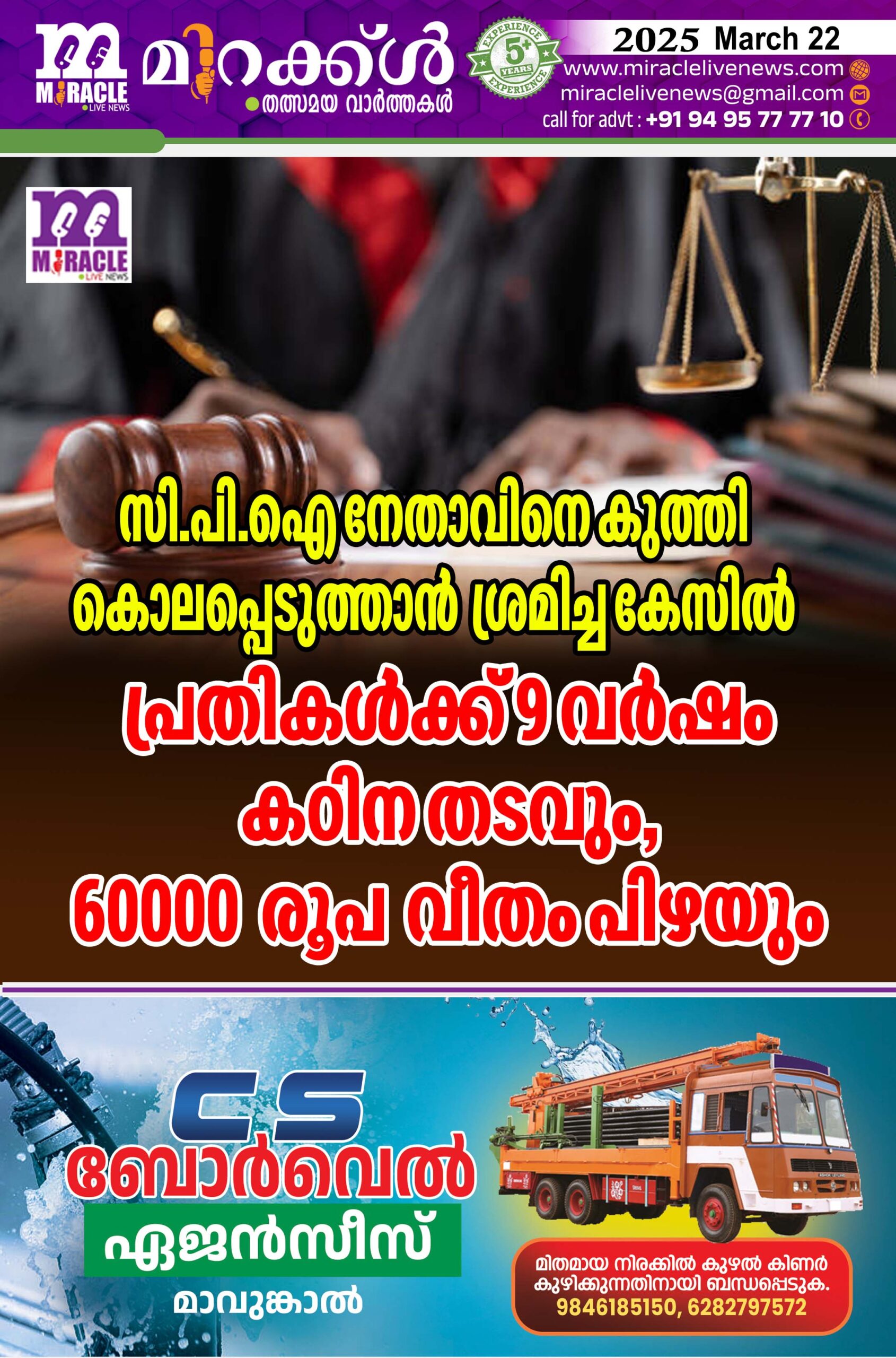 സി.പി.ഐ നേതാവിനെ കുത്തി കൊലപ്പെടുത്താന്‍ ശ്രമിച്ച കേസില്‍ പ്രതികള്‍ക്ക് 9 വര്‍ഷം കഠിന തടവും, 60000 രൂപ വീതം പിഴയും