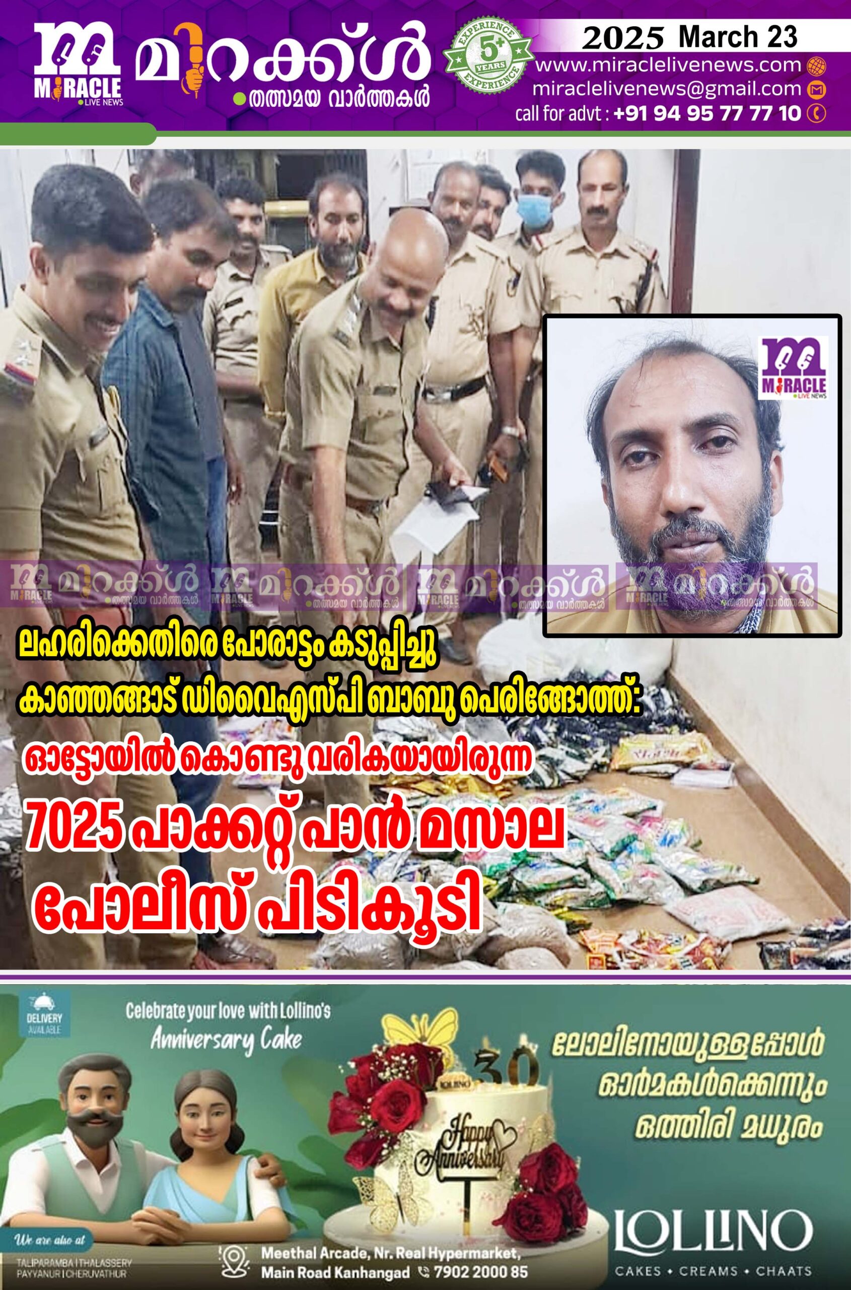 ലഹരിക്കെതിരെ പോരാട്ടം കടുപ്പിച്ചു കാഞ്ഞങ്ങാട് ഡിവൈഎസ്പി ബാബു പെരിങ്ങോത്ത്; ഓട്ടോയില്‍ കൊണ്ടു വരികയായിരുന്നു 7025 പാക്കറ്റ് പാന്‍ മസാല പോലീസ് പിടികൂടി