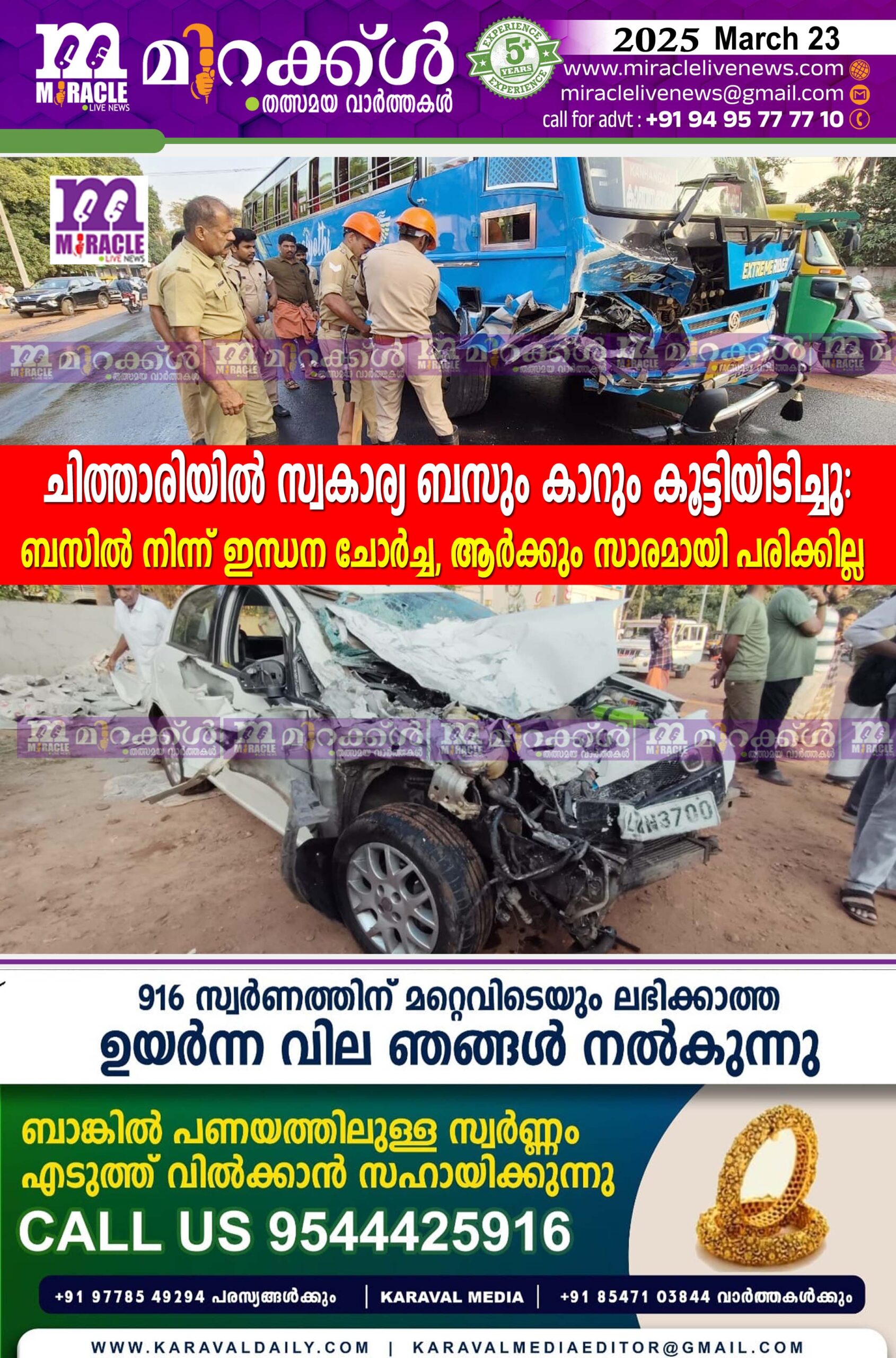 ചിത്താരിയില്‍ സ്വകാര്യ ബസും കാറും കൂട്ടിയിടിച്ചു : ബസില്‍ നിന്ന് ഇന്ധന ചോര്‍ച്ച; ആര്‍ക്കും സാരമായി പരിക്കില്ല