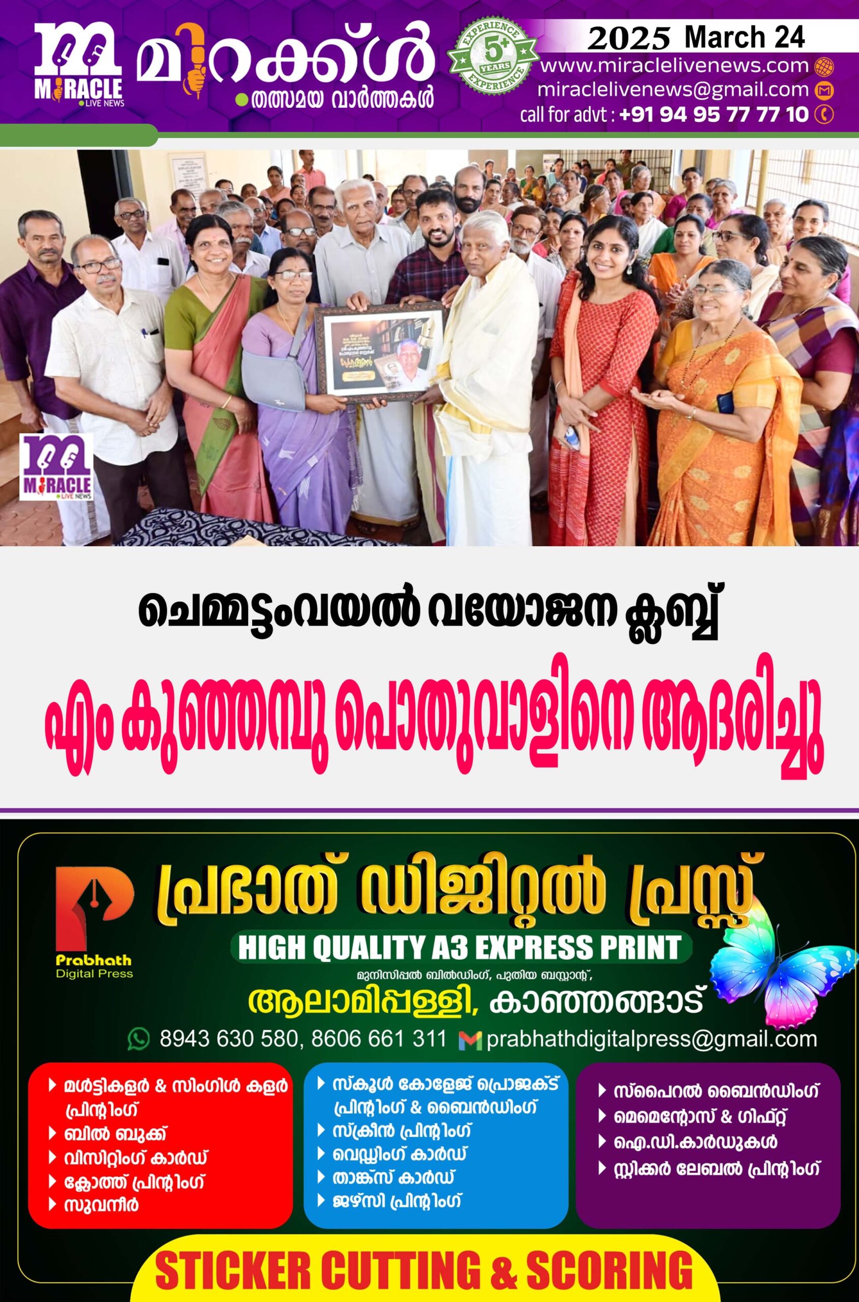 കാഞ്ഞങ്ങാട്:- ‘വായനാ വസന്തം,പൂത്തുലഞ്ഞ ചെമ്മട്ടംവയല് സ്നേഹതീരം വയോജന ക്ലബ്ബ്മുന് പ്രധാനഅധ്യാപകനും,എഴുത്തുകാരനു ക്ലബ്ബിന്റെ മുന് പ്രസിഡണ്ടുമായ എം കുഞ്ഞമ്പു പൊതുവാളിനെ ആദരിച്ചു.വിദ്വാന് കെ കെ നായര് വായനയുടെ വസന്തം എന്ന പുസ്തകവും, എസി കണ്ണന് നായരുടെ ജീവചരിത്രത്തെക്കുറിച്ച് പൂത്തുലഞ്ഞ പൂമരം എന്നീ പുസ്തകങ്ങള് രചിക്കുകയും,സ്കൂളുകള്,ലൈബ്രറികള്,തുടങ്ങിയ നിരവധി സ്ഥാപനങ്ങളുടെയും വ്യക്തികളുടെയും സ്മരണിക,കഥകവിതാ സമാഹാരങ്ങള് എന്നിവ തയ്യാറാക്കുന്നതിനും വേണ്ടി പ്രവര്ത്തിച്ചതിന്റെ ഭാഗമായാണ്മുന് ദേശീയ അധ്യാപക അവാര്ഡ് ജേതാവ് കൂടിയായ എം കുഞ്ഞമ്പു പൊതുവാളിന് ആദരിച്ചത്.സ്നേഹതീരം വയോജന ക്ലബ്ബില് വച്ച് നടന്ന ചടങ്ങ് കാഞ്ഞങ്ങാട് നഗരസഭ വികസനകാര്യ സ്വരം സമിതി അധ്യക്ഷ കെ ലത ഉദ്ഘാടനം ചെയ്ത് ഉപഹാരം നല്കി.അശ്വിനി ഐ ങ്ങോത്ത് പുസ്തകങ്ങളെ പരിചയപ്പെടുത്തി.വയോജന ക്ലബ്ബ് പ്രസിഡണ്ട് ടി വസന്ത അധ്യക്ഷത വഹിച്ചു.കൗണ്സിലര് ടി വി സുജിത്ത് കുമാര്, എസ് ഗോപാലകൃഷ്ണന്, കെ വിജയം നായര്,രാമകൃഷ്ണന് മോനാച്ച, കെ ബാലകൃഷ്ണന്, കെ പി ശ്യാമള, എം രേണുക, സി എച്ച് ലീല എന്നിവര് സംസാരിച്ചു.ക്ലബ്ബ് സെക്രട്ടറി ടി വി ഭാസ്കരന് സ്വാഗതവും കെ കുഞ്ഞിരാമന് നന്ദിയുംപറഞ്ഞു.