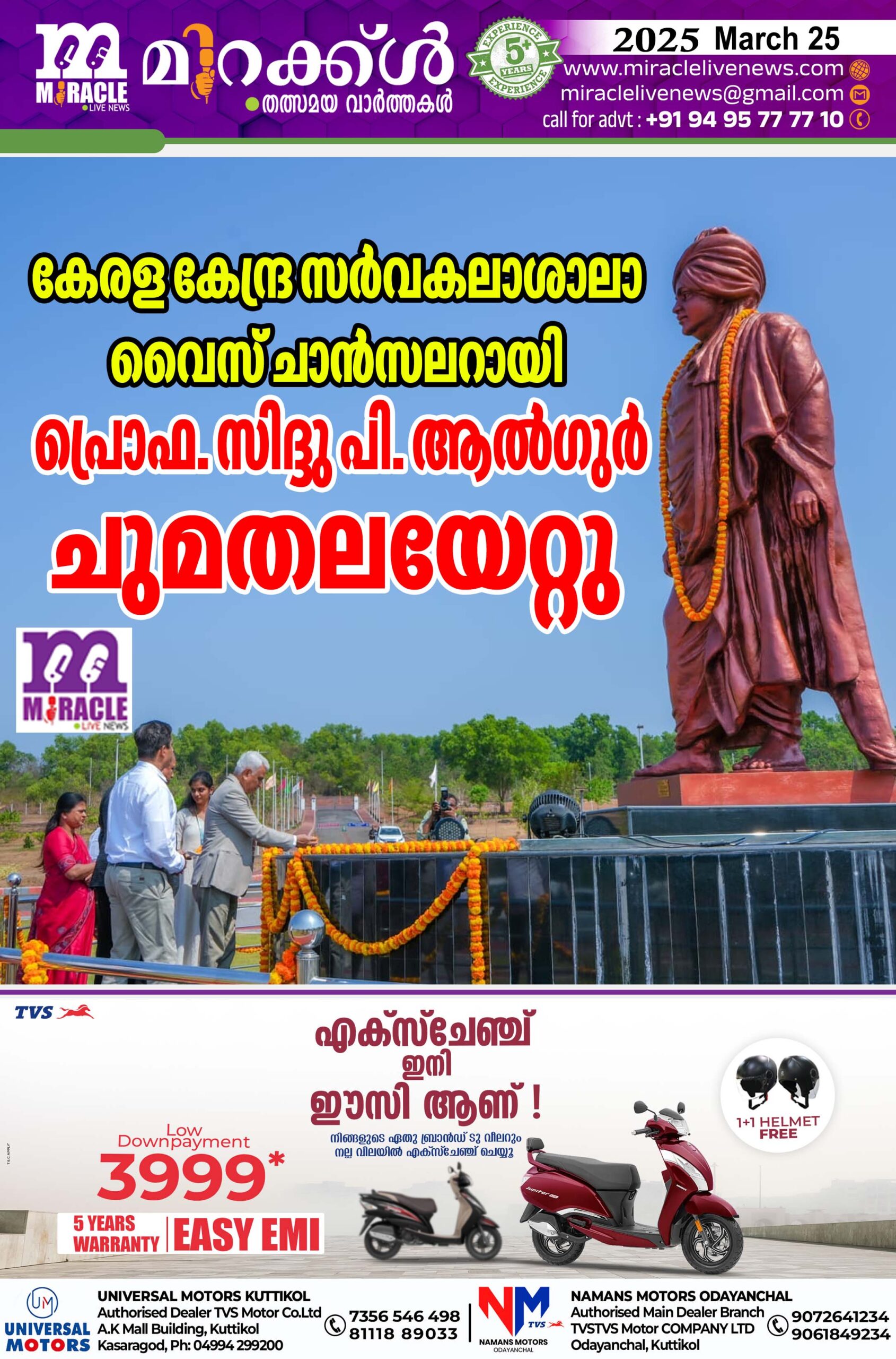 കാസര്കോട്: കേരള കേന്ദ്ര സര്വകലാശാലയുടെ നാലാമത് വൈസ് ചാന്സലറായി പ്രൊഫ. സിദ്ദു പി. ആല്ഗുര് ചുമതലയേറ്റു. ഇന്നലെ രാവിലെ ഭരണകാര്യാലയമായ ഡോ. ബി.ആര്. അംബേദ്കര് ഭവനിലെത്തിയ അദ്ദേഹത്തെ വെസ് ചാന്സലറുടെ താത്കാലിക ചുമതല വഹിച്ചിരുന്ന പ്രൊഫ. വിന്സന്റ് മാത്യു, രജിസ്ട്രാര് ഡോ. എം. മുരളീധരന് നമ്പ്യാര്, കണ്ട്രോളര് ഓഫ് എക്സാമിനേഷന്സ് ഡോ. ആര്. ജയപ്രകാശ്, ഡീനുമാര്, ജീവനക്കാര് തുടങ്ങിയവര് ചേര്ന്ന് സ്വീകരിച്ചു. സര്വകലാശാലയുടെ സെക്യൂരിറ്റി വിഭാഗം, സെക്യൂരിറ്റി ഓഫീസര് ഇന് ചാര്ജജ് സുമേഷ് പി.പി, സെക്യൂരിറ്റി ഇന്സ്പെക്ടര് ടി. വിനയകൃഷ്ണന് എന്നിവരുടെ നേതൃത്വത്തില് ഗാര്ഡ് ഓഫ് ഓണര് നല്കി. തുടര്ന്ന് വൈസ് ചാന്സലറുടെ ഓഫീസിലെത്തി പ്രൊഫ. വിന്സെന്റ് മാത്യുവില്നിന്ന് ചുമതല ഏറ്റെടുത്തു. ക്യാമ്പസിലെ സ്വാമി വിവേകാനന്ദ പ്രതിമയില് അദ്ദേഹം പുഷ്പാര്ച്ചന നടത്തി.