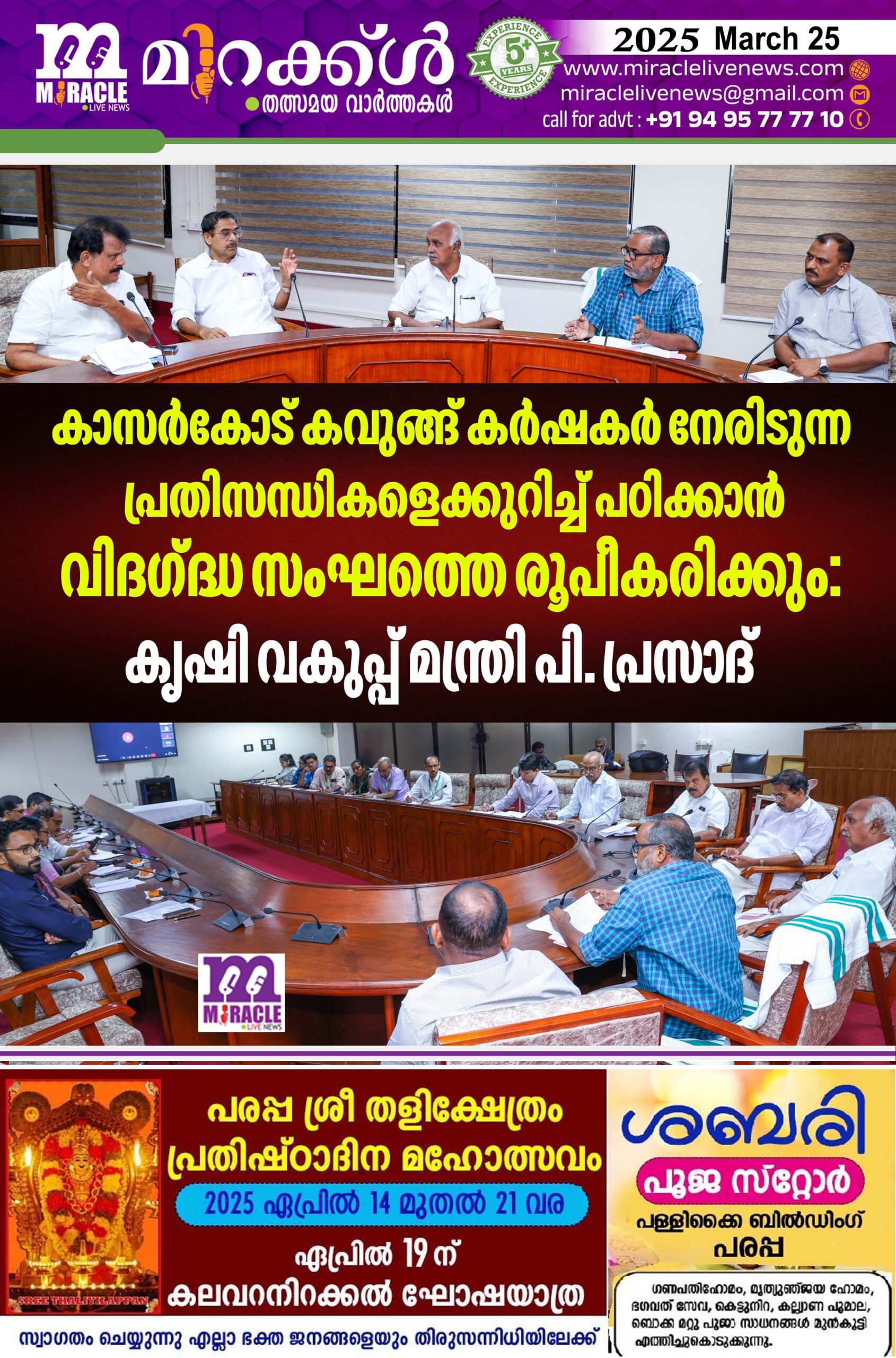 നിയമസഭാ കോണ്ഫെറന്സ് ഹാളില് ചേര്ന്ന യോഗത്തില് എം.എല്.എ.മാരായ ഇ. ചന്ദ്രശേഖരന്, എന്.എ. നെല്ലിക്കുന്ന്, സി.ഹെച്ച്. കുഞ്ഞമ്പു, എ.കെ.എം. അഷറഫ്, കാര്ഷിക വികസന കര്ഷക ക്ഷേമ വകുപ്പ് ഡയറക്ടര് ശ്രീറാം വിങ്കിട്ടരാമന് ഐ.എ.എസ്, കാഞ്ഞങ്ങാട് സബ് കളക്ടര് പ്രതീക് ജൈന് ഐ.എ.എസ്., കേന്ദ്ര തോട്ടവിള ഗവേഷണ കേന്ദ്രം പ്ലാന്റ് പ്രൊട്ടക്ഷന് മേധാവി ഡോ. വിനായക ഹെഗ്ഡെ, കേരള കാര്ഷിക സര്വകലാശാല ഡയറക്ടര് ഓഫ് എക്സ്റ്റന്ഷന് ഡോ. ജേക്കബ് ജോണ് തുടങ്ങിയവര്പങ്കെടുത്തു.