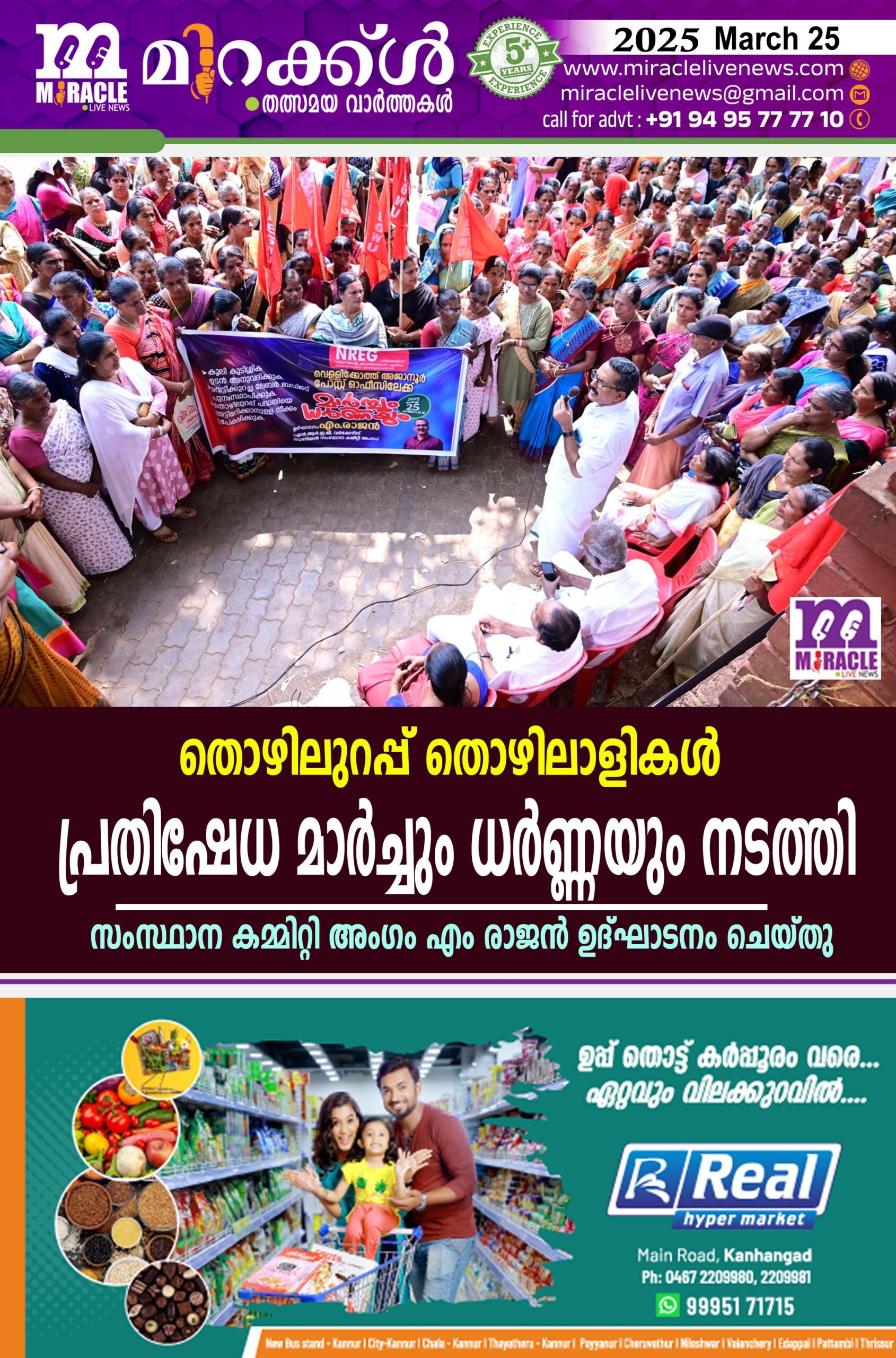 കാഞ്ഞങ്ങാട്:-കൂലി കുടിശ്ശിക ഉടന് അനുവദിക്കുക,വെട്ടിക്കുറച്ച ലേബര് ബഡ്ജറ്റ് പുനസ്ഥാപിക്കുക,തൊഴിലുറപ്പ് പദ്ധതിയെ അട്ടിമറിക്കാനുള്ള നീക്കം ഉപേക്ഷിക്കുകതുടങ്ങിയ ആവശ്യങ്ങള് ഉന്നയിച്ച് തൊഴിലുറപ്പ് തൊഴിലാളികളുടെ കൂട്ടായ്മയിലുള്ള എന് ആര് ഇ ജീ വര്ക്കേഴ്സ് യൂണിയന് കാഞ്ഞങ്ങാട് ഏരിയ കമ്മിറ്റിയുടെ നേതൃത്വത്തില് അജാനൂര് പോസ്റ്റ് ഓഫീസിലേക്ക് മാര്ച്ചം ധര്ണയും നടത്തി.നൂറുകണക്കിന് തൊഴിലാളികള് പങ്കെടുത്ത് വെള്ളിക്കോത്ത് നിന്നും പ്രകടനം ആരംഭിച്ചു.തുടര്ന്ന് നടന്ന ധര്ണ്ണ യൂണിയന് സംസ്ഥാന കമ്മിറ്റി അംഗം എം രാജന് ഉദ്ഘാടനം ചെയ്തു. എ വി രാമചന്ദ്രന് അധ്യക്ഷനായി. പി കൃഷ്ണന്,ചെറാക്കോട്ട് കുഞ്ഞിക്കണ്ണന്,എം ജി പുഷ്പ, എം വി നാരായണന്, പി കെ കണ്ണന്എന്നിവര് സംസാരിച്ചു.ഏരിയ സെക്രട്ടറി കെ സീത സ്വാഗതം പറഞ്ഞു. എം സേതു, കെ സരസ്വതി,നാരായണി പെരിയ,സുനില് നോര്ത്ത്, സി ബാലകൃഷ്ണന് സി സാവിത്രി എന്നിവര്നേതൃത്വംനല്കി.