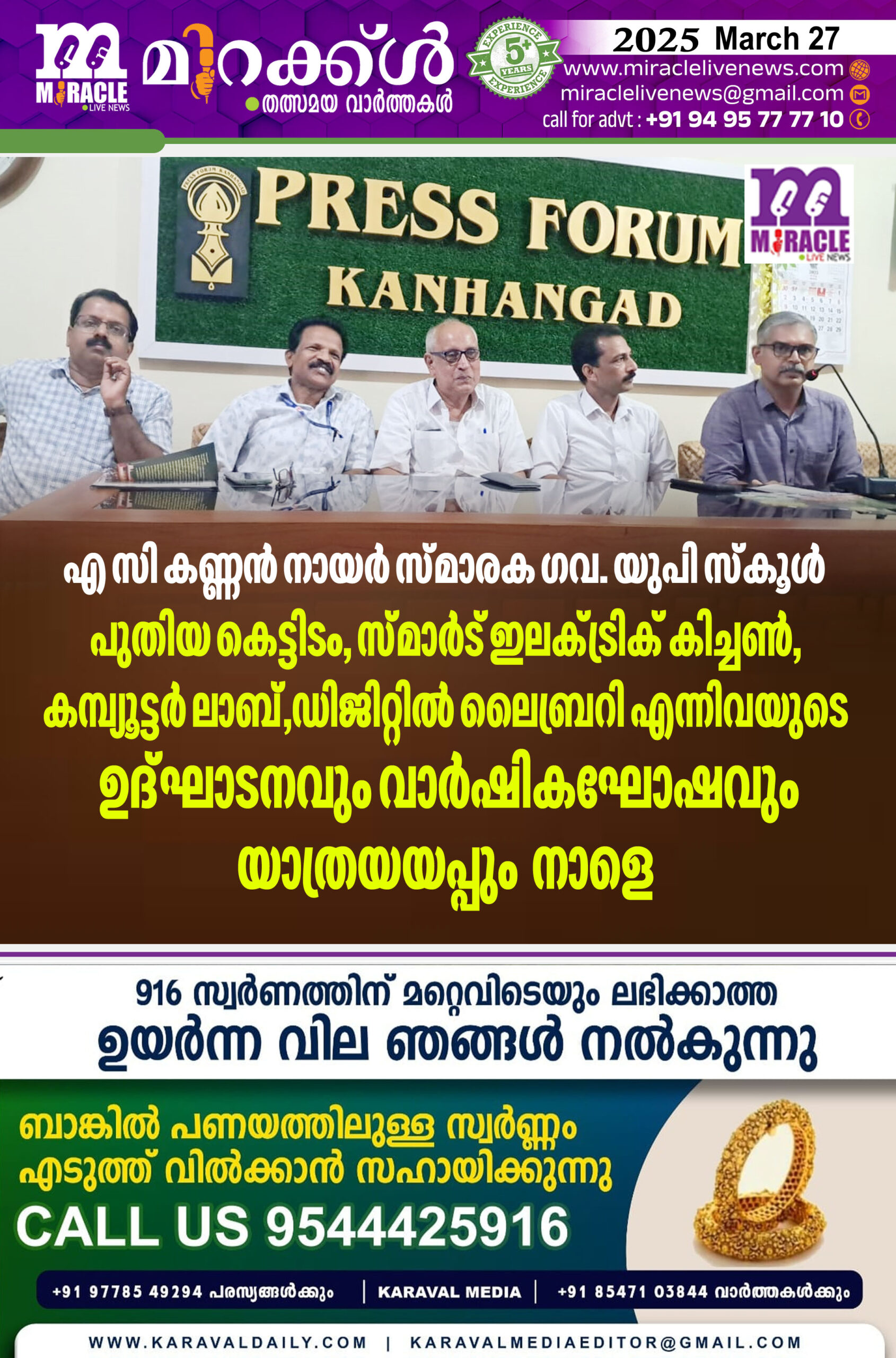 കാഞ്ഞങ്ങാട് :മേലാങ്കോട്ട് മുന്നോട്ട്എന്നമുദ്രാവാക്യത്തിലൂന്നി എസികണ്ണന് നായര് സ്മാരക ഗവ. യുപി വിദ്യായത്തില് നടപ്പിലാക്കിവരുന്ന നൂതനങ്ങളായ കര്മ്മ പരിപാടികളിലൂടെ അക്കാദമിക രംഗത്തും പാഠ്യേതര രംഗങ്ങളിലും ജില്ലയിലെതന്നെ മികച്ച നിലവാരത്തിലേക്ക് . പുതിയ കെട്ടിടം സ്മാര്ട് ഇലക്ട്രിക് കിച്ചണ്, കമ്പ്യൂട്ടര് ലാബ്,ഡിജിറ്റില് ലൈബ്രറി എന്നിവയുടെ ഉദ്ഘാടനവും വാര്ഷികഘോഷവും യാത്രയായപ്പും ശതാബ്ദിസ്മരണിക പ്രകാശനവും മാര്ച്ച് 28ന് വിവിധ പരിപാടകളോടെ നടക്കുമെന്ന്സംഘാടകസമതി ഭാരവാഹികളായ അഡ്വ. പി അപ്പുക്കുട്ടന്, അഡ്വ. പി എന് വിനോദ്കുമാര്, ജി ജയന്, കെ അനില്കുമാര് എന്നിവര് വാര്ത്താസമ്മേളനത്തില് അറിയിച്ചു. സോളാര് പാനല് ഇ ചന്ദ്രശേരനും സ്മാര്ട്ട് ഇലക്ട്രിക്കല് കിച്ചണ് നഗരസഭാ ചെയര്പേഴ്സണ് കെ വി സുജാതയും ഇലക്ട്രിക്കല് കിച്ചണ് എനര്ജിമാനേജ്മെന്റ് ഡയറക്ടര് ഡോ ആര് ഹരികുമാറും, ഡിജിറ്റല്ലൈബ്രറി ജില്ലാ വിദ്യാഭ്യാസ ഉപഡയറ്കടര് ടി വി മധുസൂദനനും, കമ്പ്യൂട്ടര് ലാബ് ഉപജില്ലാ വിദ്യാഭ്യാസ ഓഫീസര് മിനിജോസഫും, ഉദ്ഘാടനംചെയ്യും.