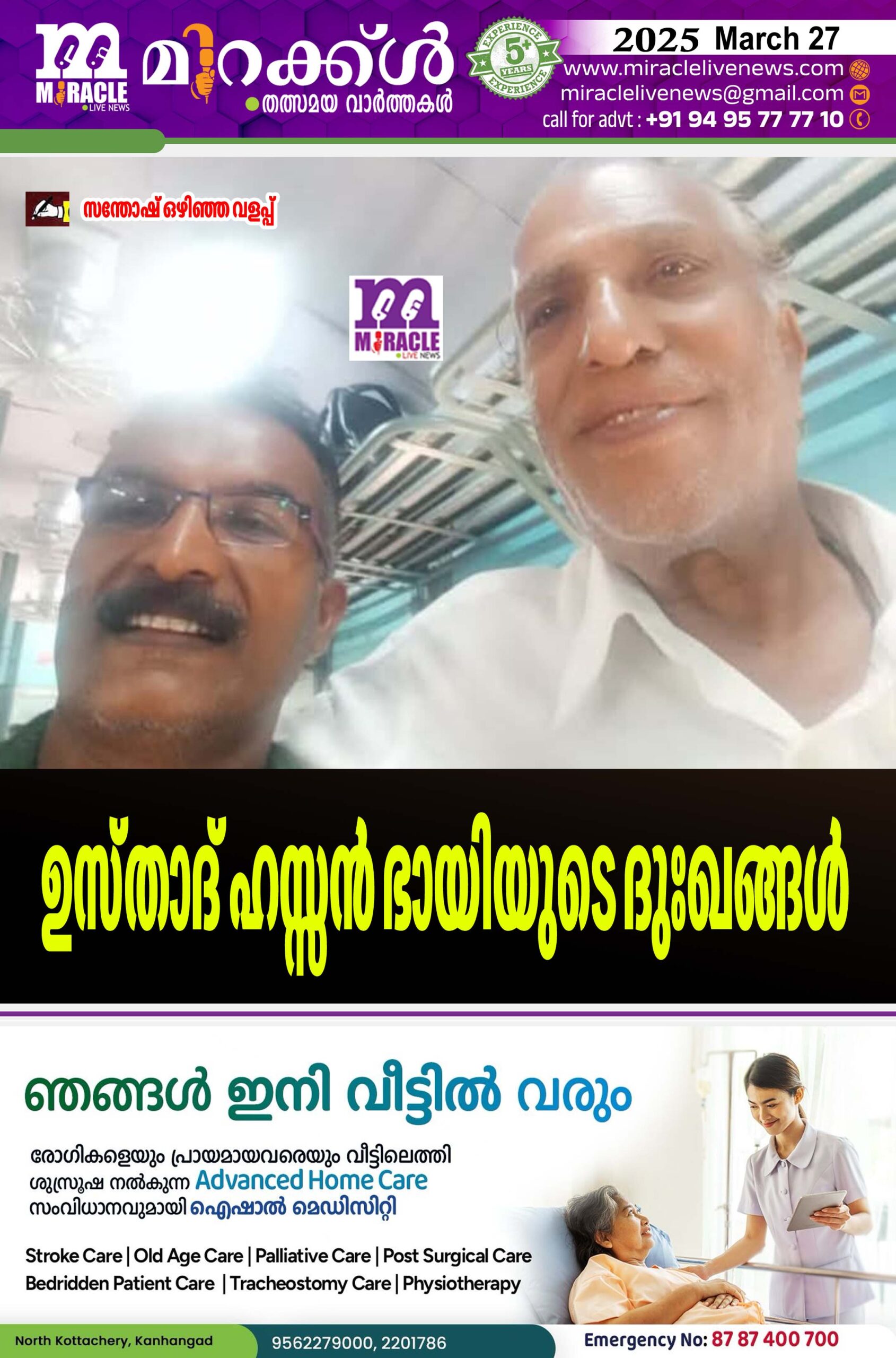 ലോക പ്രശസ്തനും കാസര്‍കോട്ട് കാരനുമായ ഷഹന്നായി വിദഗ്ദനും സംഗീതജ്ഞനുമാണ് പ്രിയപ്പെട്ട ഉസ്താദ് ‘ബംഗാള്‍, കര്‍ണ്ണാടക, തമിഴ്‌നാട്, സംസ്ഥാന ബഹുമതികള്‍ ഒപ്പം ദേശീയ തലത്തില്‍ പുരസ്‌കാരങ്ങള്‍ തുടങ്ങിയ നിരവധിയായ അംഗീകാരങ്ങള്‍ സ്വന്തമാക്കിയ അതുല്യ കലാകാരന് ഇവിടെ ഒരു ഫെല്ലോഷിപ്പിന് അപേക്ഷ നല്‍കി മൂന്ന് വര്‍ഷമായിട്ടും തീരുമാനമായില്ല മഹാനായ സംഗീത വിസ്മയം ഉസ്താദ് വിസ്മില്ലാ ഖാന്റെ ശിഷ്യനായി കലാ-സംഗീതരംഗത്ത് തുടക്കം കുറിച്ച ഈ സര്‍ഗ്ഗ പ്രതിഭയ്ക്ക് ഇന്നും സംഗീതരംഗത്ത് തിരക്കാണ് കലാ സാംസ്‌കാരികരംഗത്ത് ക്ഷേത്രങ്ങള്‍ ക്ലബ്ബുകള്‍ സാംസ്‌കാരിക കേന്ദ്രങ്ങള്‍ ഫോക്ലോര്‍ മേളകള്‍ ഗ്രാമീണ കലാമേളകള്‍, ഗ്രാമ ഫെസ്റ്റുകള്‍ എന്ന് വേണ്ട എവിടെയും സംഗീത വിരുന്നൊരുക്കാന്‍ ഹസ്സന്‍ ഭായി സദാസന്നദ്ധനാണ് പന്ത്രണ്ടാം വയസ്സില്‍ തുടങ്ങിയ ഈ സംഗീത സപര്യ 83ആം വയസ്സിലും തുടരുകയാണ്. വീടെന്ന തന്റെ സ്വപ്നങ്ങള്‍ക്ക് വേണ്ടി ഏറെക്കാലമായി ജീവിത പോരാട്ടത്തിലായിരുന്നു ഈ കലാകാരന്‍. അടുത്ത കാലത്ത് കാസര്‍കോട്ട് വന്നപ്പോള്‍ മുന്‍ പ്രതിപക്ഷ നേതാവ് രമേശ് ചെന്നിത്തല ഈ സംഗീത വിസ്മയത്തിന്റെ വിഷമം മനസ്സിലാക്കി വീട് നിര്‍മ്മാണത്തിന് അഞ്ചു ലക്ഷം രൂപയാണ് അനുവദിച്ചത് അക്കാര്യം പറയുമ്പോള്‍ ഉസ്താദിന്റെ കണ്ണുകള്‍ കൃത്ജ്ഞത കൊണ്ട് നിറയുന്നത് സംസാരത്തില്‍ കാണാന്‍ ഇടയായി. വാര്‍ദ്ധ്യകാലത്ത് തുണയാകേണ്ട രണ്ട് ആണ്‍മക്കള്‍ രോഗങ്ങളാല്‍ ഏറെ പ്രയാസം നേരിടുകയുമാണ്. ഒരു മകന്‍ വൃക്ക രോഗങ്ങള്‍ക്ക് ചികിത്സയിലാണ് കൂടാതെ മൂന്ന് പെണ്‍മക്കളും അടങ്ങിയതാണ് ഹസ്സന്‍ ഭായിയുടെ കുടുംബം പത്മശ്രീയും പത്മഭൂഷണുമൊക്കെ കിട്ടാന്‍ ഏറെ യോഗ്യതയുള്ള ഈ കലാകാരന്‍ അംഗീകാരത്തിന് വേണ്ടി ഒരിക്കലും ശ്രമിക്കാറുമില്ല അര്‍ഹതയുള്ളത് വന്നു ചേരുമെന്ന വിശ്വാസക്കാരനുമാണ്. രോഗാവസ്ഥയില്‍ കിടന്ന പ്രിയതമ രണ്ട് വര്‍ഷം മുമ്പ് ഈ ലോകത്തോട് യാത്ര പറഞ്ഞു. ജീവിതത്തിലെ ഏകാന്തതയും സാമ്പത്തിക പ്രയാസങ്ങളും ഈ കലാകാരന് ‘ജീവിതത്തിലെ സായന്തന കാലത്തും വേദനകളാണ് സമ്മാനിക്കുന്നത് ഭക്തിഗാനങ്ങള്‍ സിനിമാ ഗാനങ്ങള്‍, എന്ന് വേണ്ട ഷഹന്നായി , ഗസല്‍ സംഗീത സപര്യകളില്‍ ഈ പ്രതിഭയില്‍ എല്ലാ o ഭദ്രം. കാസര്‍കോട് കോളിയടുക്കത്താണ് വീട് ഇപ്പോള്‍ താമസം മകളുടെ കൂടെ എറണാകുളത്താണ് -അപ്രതീക്ഷിതമായി ഹസ്സന്‍ ഭായിയെ കണ്ട് ‘ സൗഹൃദം പുതുക്കിയപ്പോള്‍കുറിച്ചത്.
