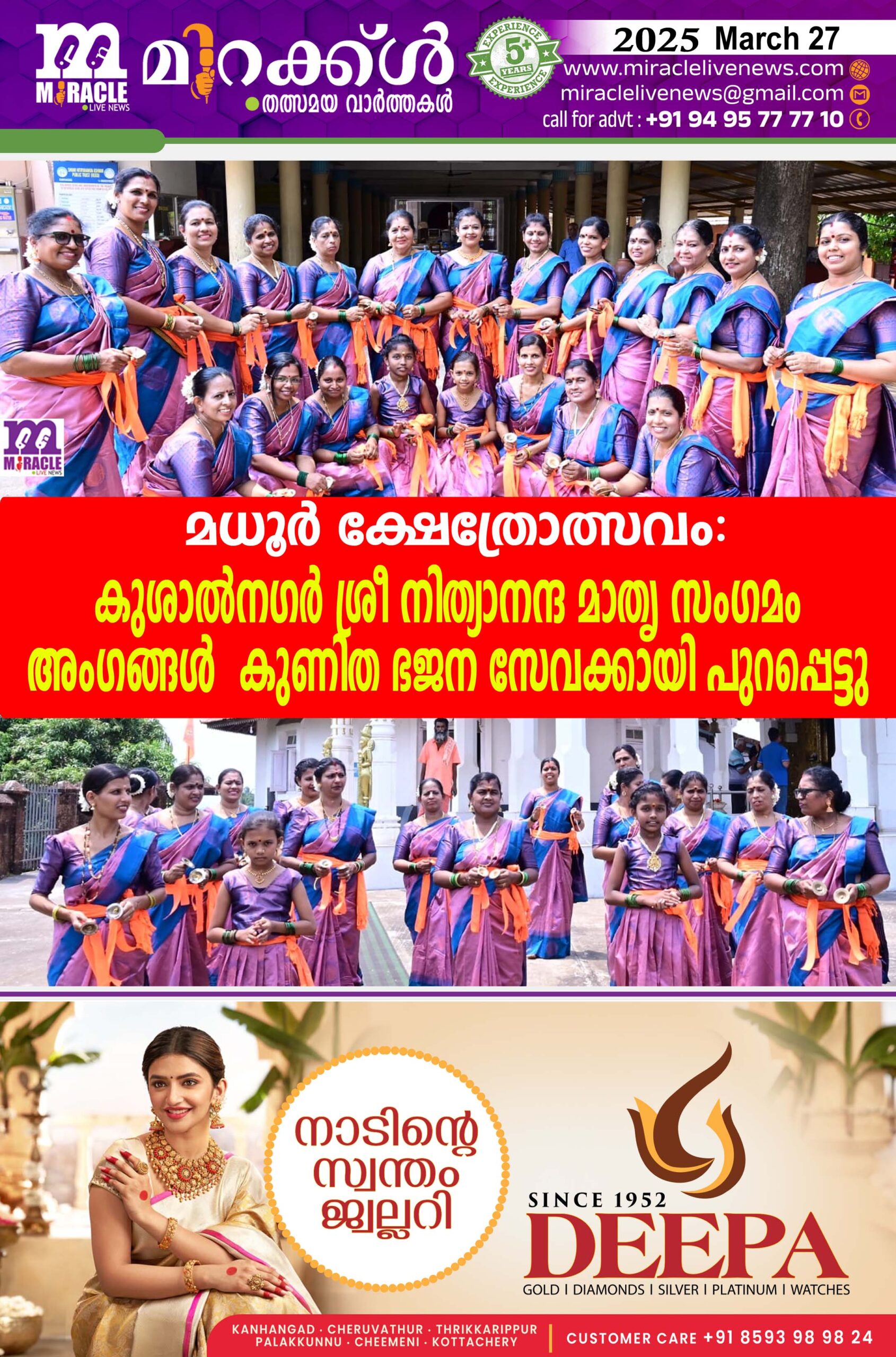 കാഞ്ഞങ്ങാട്:  ഏഷ്യയിലെ പ്രധാന ക്ഷേത്രങ്ങളില്‍ ഒന്നായ മധൂര്‍ മദനന്തേശ്വര സിദ്ധിവിനായക ക്ഷേത്രത്തില്‍ മൂന്ന് പതിറ്റാണ്ടുകള്‍ക്ക് ശേഷം മാര്‍ച്ച് 27 മുതല്‍ ഏപ്രില്‍ 7 വരെ നടക്കുന്ന അഷ്ടബന്ധ ബ്രഹ്‌മ കലശോത്സവത്തിന്റെയും, മൂഡപ്പസേവയുടെയും ഭാഗമായി നടക്കുന്ന കുണിത ഭജന സേവയുടെ ഭാഗമാകുന്നതിനായി കുശാല്‍നഗര്‍ ശ്രീ നിത്യാനന്ദ മാതൃസംഗമം മാതൃസമിതി അംഗങ്ങള്‍ പുറപ്പെട്ടു. 25 അംഗങ്ങള്‍ അടങ്ങുന്ന സംഘം നിത്യാനന്ദ ആശ്രമ പരിസരത്തു നിന്നുമാണ് പുറപ്പെട്ടത്.ഭജന പാടിയും,നൃത്തം ചവിട്ടിയും ഭൂരിഭാഗവും കാല്‍നടയായാണ് സംഘം യാത്ര നടത്തുന്നത്.ജില്ലയിലെ വിവിധ ഭാഗങ്ങളില്‍ നിന്നുള്ള രണ്ടായിരത്തോളം വരുന്ന മാതൃസമിതി അംഗങ്ങള്‍ നടത്തുന്ന മഹാകണിത ഭജന സേവയില്‍ ഈ സംഘവും കൂടിച്ചേരും.ഉത്സവത്തിന്റെ പ്രചരണത്തിന്റെയുംഅന്നദാനത്തിന്റെ വിഭവ സമാഹരണത്തിന്റെയും കുടുംബത്തിനും നാടിനും ഐശ്വര്യവും സമ്പല്‍ സമൃദ്ധിയും സ്നേഹവും ഉണ്ടാകുന്നതിനാണ് ഭജന സേവ നടത്തുന്നത്. നിത്യാനന്ദ ആശ്രമ പരിസരത്തു നിന്നും ആരംഭിച്ച യാത്രയ്ക്ക് എം സലീല, ടി കെ നളിനി, എന്‍ അര്‍ഷിത,സീന അനില്‍,ഹേമ സതീശന്‍,ശ്വേതാ സന്തോഷ് എന്നിവര്‍നേതൃത്വം നല്‍കി.