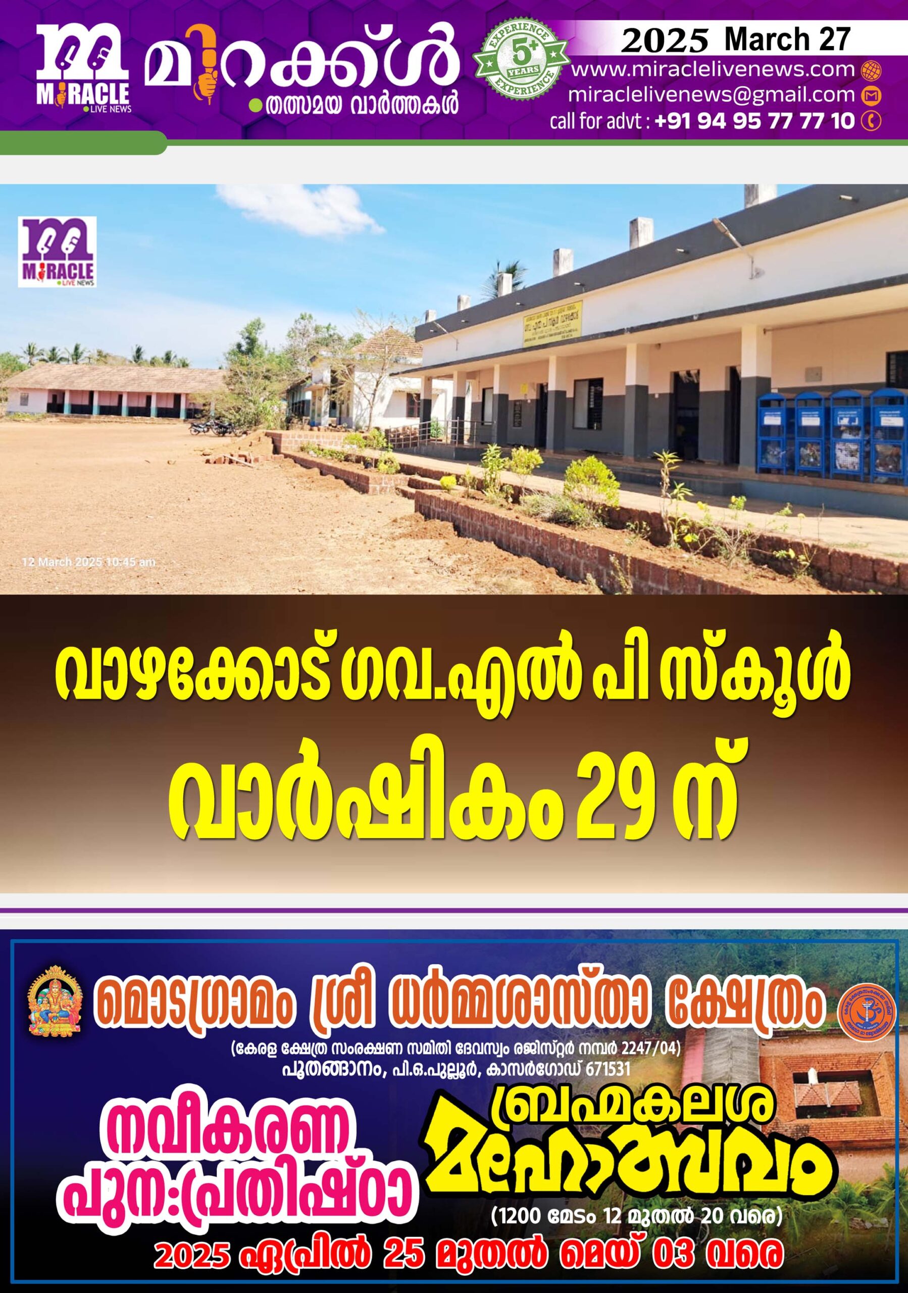 കോട്ടപ്പാറ :വാഴക്കോട് ഗവ.എല് പി സ്കൂള് 52 വാര്ഷികവും വിജോത്സവും മാര്ച്ച് 29ന് നടക്കും. വൈകിട്ട് ആറിന് വാര്ഡ് മെമ്പര് എ വേലായുധന് ഉദ്ഘാടനം ചെയ്തു. പിടിഎ പ്രസിഡന്റ് ബിജു തുമ്പയില് അധ്യക്ഷത വഹിക്കും. ഹോസ്ദുര്ഗ് എ ഇ ഒ മിനി ജോസഫ് ഉപഹാര സമര്പ്പണം നടത്തും. സെക്രട്ടറി ബി നിഷാന്ത് , മദര് പിടിഎ പ്രസിഡന്റ് പ്രവിത , സിഡിഎസ് അംഗം ബിജിബാബു തുടങ്ങിയവര് ആശംസകള് നേരും.പ്രധാന സ്കൂള് ഹെഡ്മാസ്റ്റര് പി കെ ബിജു സ്വാഗതവും സീനിയര് അസിസ്റ്റന്റ് കെ രോഹിണി നന്ദിയും പറയും. തുടര്ന്ന് കുട്ടികളുടെകലാസന്ധ്യ.
