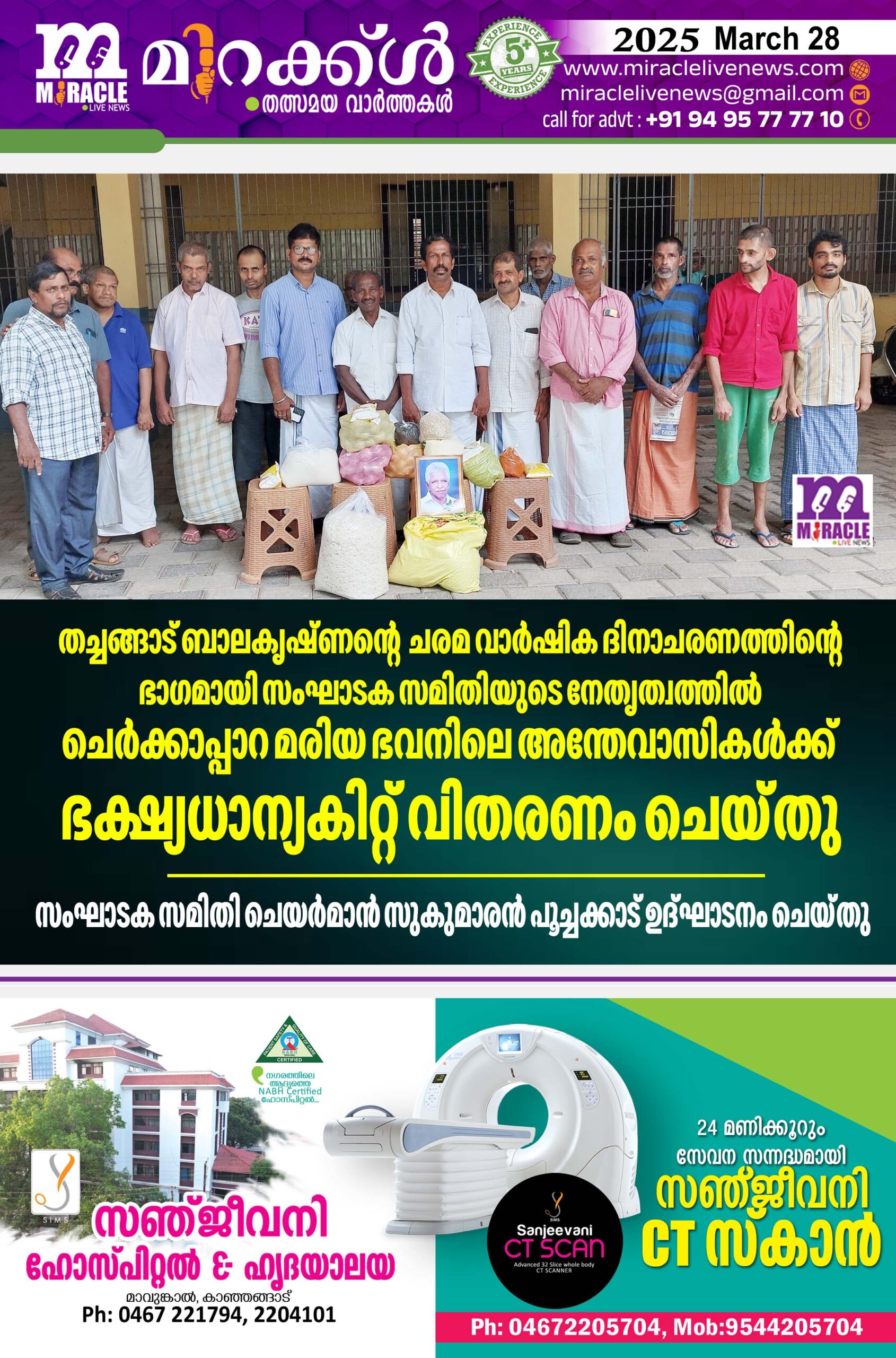 തച്ചങ്ങാട് ബാലകൃഷ്ണന്റെ ചരമ വാര്‍ഷിക ദിനാചരണത്തിന്റെ ഭാഗമായി സംഘാടക സമിതിയുടെ നേതൃത്വത്തില്‍ ചെര്‍ക്കാപ്പാറ മരിയ ഭവനിലെ അന്തേവാസികള്‍ക്ക് ഭക്ഷ്യധാന്യകിറ്റ് വിതരണം ചെയ്തു; സംഘാടക സമിതി ചെയര്‍മാന്‍ സുകുമാരന്‍ പൂച്ചക്കാട് ഉദ്ഘാടനം ചെയ്തു