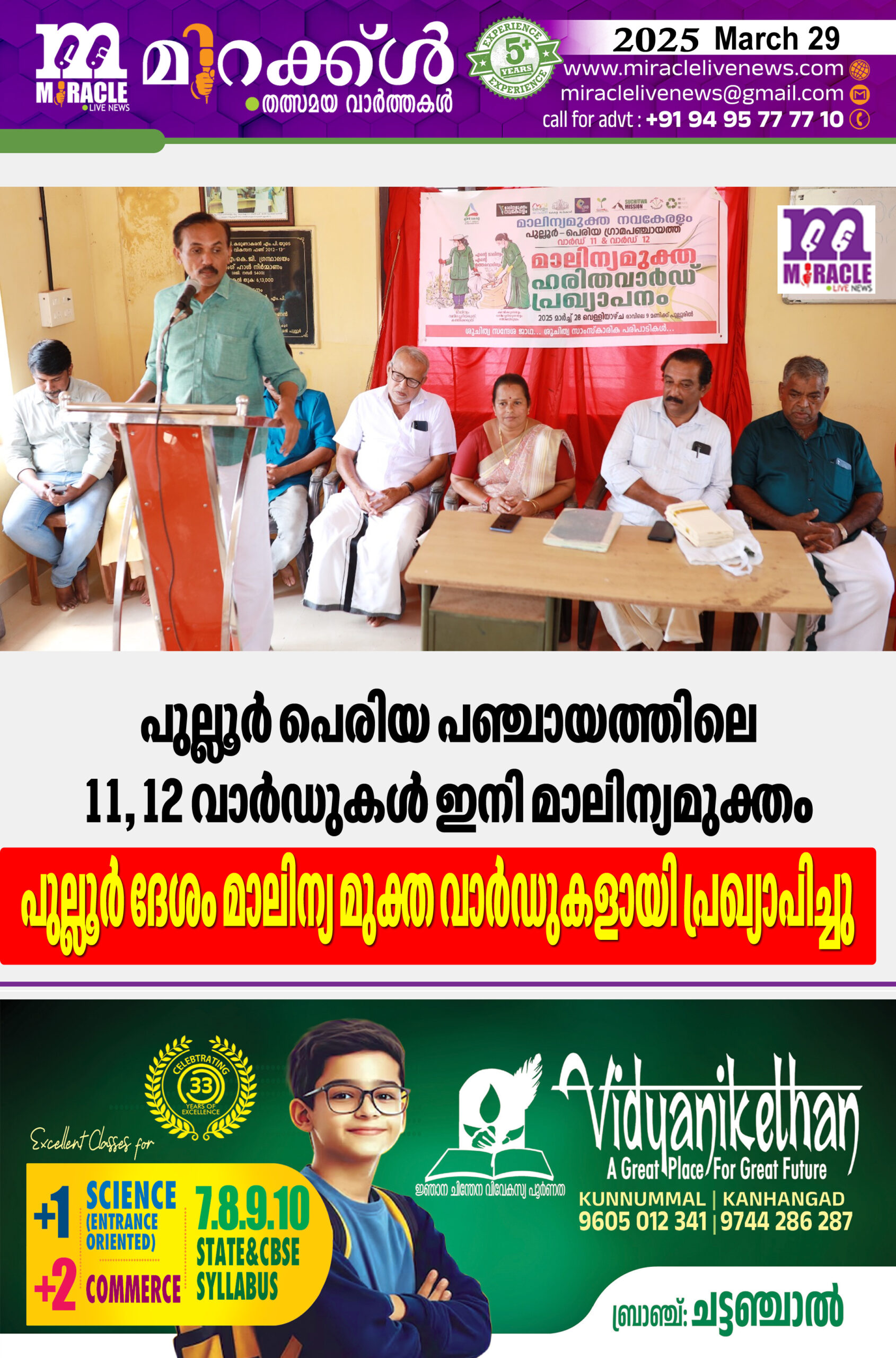 പുല്ലൂര്‍: 2025 ജനുവരി 26 മുതല്‍ നടത്തിവരുന്ന മാലിന്യമുക്തം നവകേരളം ക്യാമ്പയിന്റെ ഭാഗമായി പുല്ലൂര്‍ പെരിയ ഗ്രാമപഞ്ചായത്തിലെ 11, 12 വാര്‍ഡുകള്‍ അടങ്ങുന്ന പുല്ലൂര്‍ ദേശം മാലിന്യമുക്ത വാര്‍ഡുകളായി പ്രഖ്യാപിച്ചു. പ്രഖ്യാപനത്തിനായി ജനുവരി 26 മുതല്‍ വിവിധ പരിപാടികളാണ് നടത്തിവരുന്നത്. വാര്‍ഡിനുള്ളിലെ മുഴുവന്‍ സ്‌കൂളുകള്‍, അങ്കണവാടികള്‍, കലാലയങ്ങള്‍, സര്‍ക്കാര്‍, സര്‍ക്കാ റിതര സ്ഥാപനങ്ങള്‍, വായനശാലകള്‍, ക്ലബ്ബുകള്‍ മുതലായവ പരിശോധിച്ചു ഹരിത സ്ഥാപനമാണെന്ന് സാക്ഷ്യപത്രം നല്‍കിയിരുന്നു. മാലിന്യങ്ങള്‍ സ്ഥിരമായി നിക്ഷേപിക്കുന്ന പൊതു ഇടങ്ങള്‍, തോടുകള്‍ എന്നിവ വൃത്തിയാക്കി വാര്‍ഡുകളിലെ മുഴുവന്‍ വീടുകളും ഹരിത കര്‍മ്മസേനയുമായി സഹകരിക്കുന്നവയാണ്. 90 ശതമാനം ത്തിലധികം വീടുകളിലും ഉറവിട മാലിന്യ സംസ്‌കരണ ഉപാധികള്‍ ഉണ്ട്. വാര്‍ഡ് പരിധിയിലെ എല്ലാ അയല്‍ക്കൂട്ടങ്ങളും ഹരിത അയല്‍ക്കൂട്ടങ്ങളായി പ്രഖ്യാപിച്ചിട്ടുണ്ട്. പുല്ലൂര്‍ എകെജി ഗ്രന്ഥാലയത്തില്‍ വച്ച് നടന്ന ചടങ്ങില്‍ പുല്ലൂര്‍ പെരിയ ഗ്രാമപഞ്ചായത്ത് പ്രസിഡണ്ട് സി കെ അരവിന്ദാക്ഷന്‍ 11, 12 വാര്‍ഡുകളെ ഹരിത വാര്‍ഡുകളായി പ്രഖ്യാപിച്ചു കാഞ്ഞങ്ങാട് ബ്ലോക്ക് പഞ്ചായത്ത് ക്ഷേമകാര്യ സ്റ്റാന്‍ഡിങ് കമ്മിറ്റി ചെയര്‍പേഴ്‌സണ്‍ കെ. സീത അധ്യക്ഷത വഹിച്ചു. വില്ലേജ് എക്സ്റ്റന്‍ഷന്‍ ഓഫീസര്‍ വി. ജിജേഷ്, ശശീന്ദ്രന്‍, എച്ച്.ഐ കൃഷ്ണകുമാര്‍, എച്ച്.ഐ. ദീപ, വി നാരായണന്‍ മാസ്റ്റര്‍, എ. കൃഷ്ണന്‍ എന്നിവര്‍ സംസാരിച്ചു. രണ്ട് വാര്‍ഡുകളിലെയും ഹരിത കര്‍മ്മ സേന പ്രവര്‍ത്തകരെ ആദരിക്കുകയും തുടര്‍ന്ന് ശുചിത്വ പ്രതിജ്ഞ ചെല്ലുകയും ചെയ്തു. ചടങ്ങിന് ശേഷം ശുചിത്വ സന്ദേശ റാലി സംഘടിപ്പിക്കുകയുംചെയ്തു.