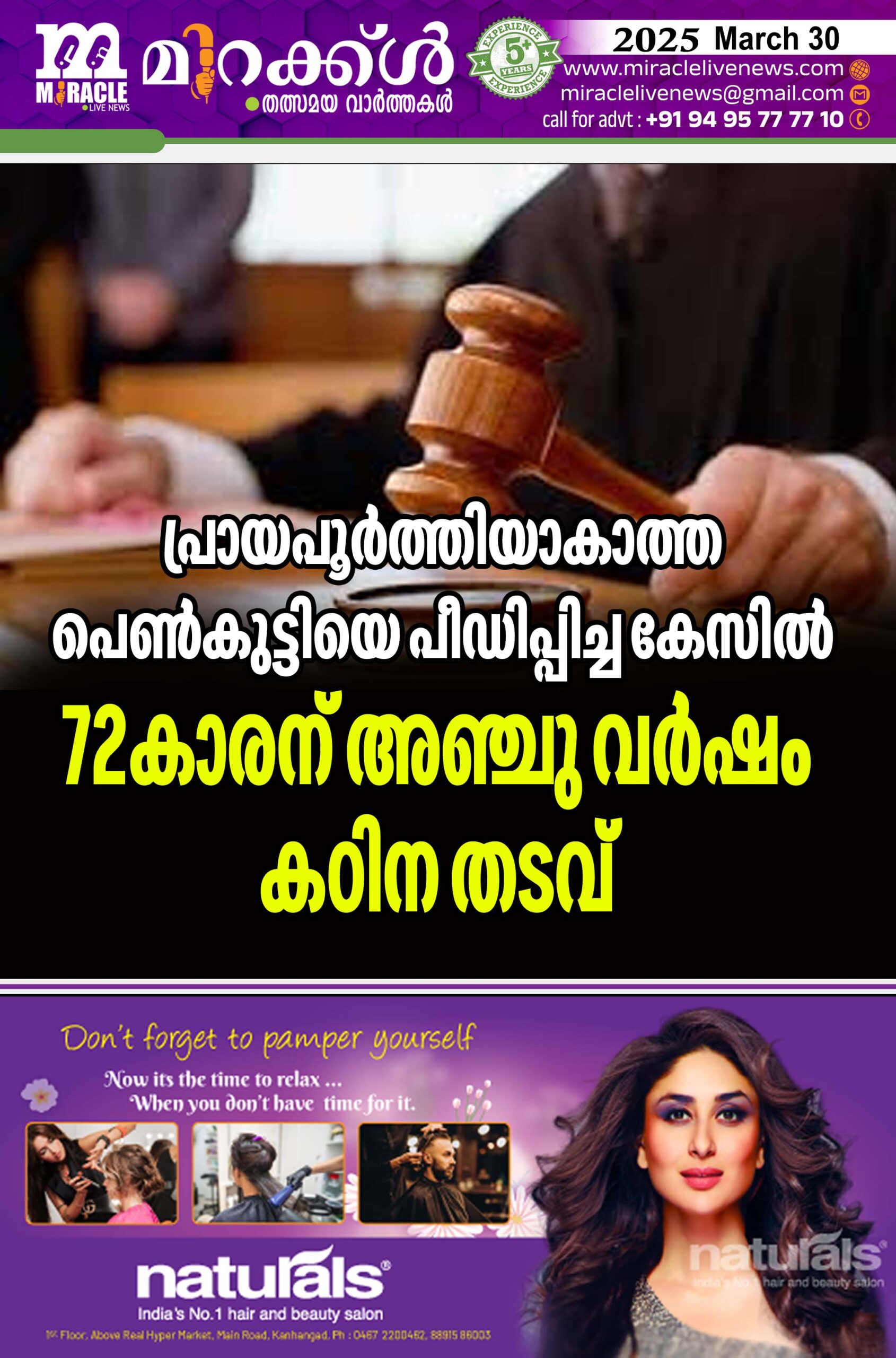കാഞ്ഞങ്ങാട് :പ്രായപൂര്ത്തിയാകാത്ത പെണ്കുട്ടിയെ പീഡിപ്പിച്ച കേസില് പ്രതിയായ 72കാരനെ കോടതി അഞ്ചു വര്ഷം കഠിന തടവിനും 50,000 രൂപ പിഴയടക്കാനും ശിക്ഷിച്ചു. തായന്നൂര് അയ്യങ്കാവ് പൊയ്യളത്തെ കുഞ്ഞിരാമനെ (72)യാണ് ഹോസ്ദുര്ഗ് ഫാസ്റ്റ് ട്രാക്ക് സ്പെഷ്യല് കോടതി ജഡ്ജി പി എം സുരേഷ് ശിക്ഷിച്ചത്.പിഴയടച്ചില്ലെങ്കില് ആറു മാസം തടവനുഭവിക്കണം.2023മെയ് 16ന് വൈകിട്ട് കുഞ്ഞിരാമന് വീട്ടില് അതിക്രമിച്ചു കടന്ന് പെണ്കുട്ടിയെ പീഡിപ്പിച്ചെന്നാണ് കേസ്. പെണ്കുട്ടിയുടെ പരാതിയില് പോക്സോ നിയമപ്രകാരം അമ്പലത്തറ പൊലീസാ ണ് കേസെടുത്തത്.അന്നത്തെ അമ്പലത്തറ ഇന്സ്പെക്ടര് ടി കെ മുകുന്ദനാണ് അന്വേഷണം പൂര്ത്തിയാക്കി കോടതിയില് കുറ്റപത്രം നല്കിയത്. പ്രോസിക്യുഷന് വേണ്ടി സ്പെഷ്യല് പബ്ലിക് പ്രോസിക്യുട്ടര് എ ഗംഗാധരന്ഹാജരായി.
