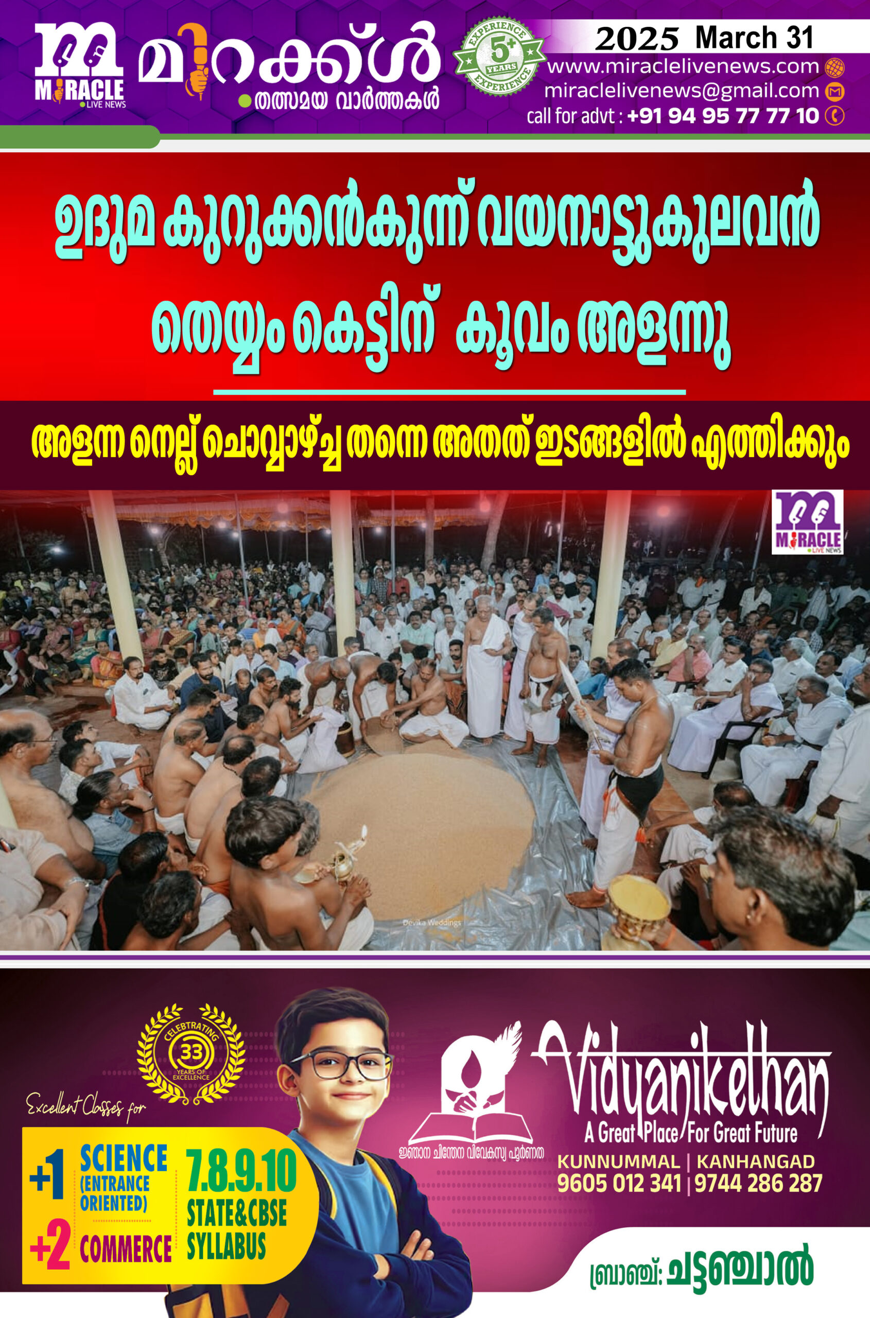 ഉദുമ കുറുക്കന്‍കുന്ന് വയനാട്ടുകുലവന്‍ തെയ്യം കെട്ടിന് കൂവം അളന്നു; അളന്ന നെല്ല് ചൊവ്വാഴ്ച്ച തന്നെ അതത് ഇടങ്ങളില്‍ എത്തിക്കും
