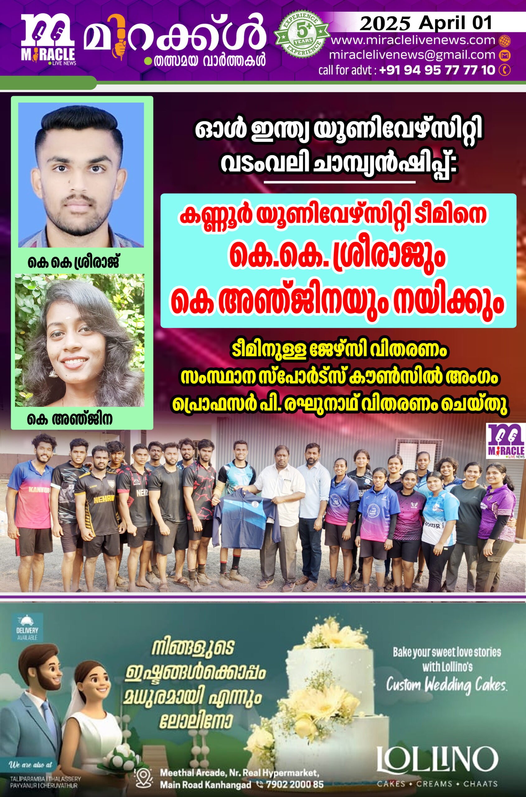 കാഞ്ഞങ്ങാട്: ഈ മാസം 5 മുതല് 9 വരെ പഞ്ചാബില് നടക്കുന്ന ഓള് ഇന്ത്യ യൂണിവേഴ്സിറ്റി വടംവലി ചാമ്പ്യന്ഷിപ്പില് കണ്ണൂര് യൂണിവേഴ്സിറ്റി ടീമിനെ പ്രഖ്യാപിച്ചു. വനിത ടീമിനെ കെ അജിനയും പുരുഷ ടീമിനെ കെ കെ ശ്രീരാജും നയിക്കും. ഇരുവരും കാഞ്ഞങ്ങാട് മൂന്നാട് പീപ്പിള്സ് കോളേജിലെ വിദ്യാര്ത്ഥികളാണ്. ടീമിനുള്ള ജേഴ്സി വിതരണം സംസ്ഥാന സ്പോര്ട്സ് കൗണ്സില് അംഗവും കണ്ണൂര് യൂണിവേഴ്സിറ്റി ഉന്നത വിദ്യാഭ്യാസ കൗണ്സില് അംഗവുമായ പ്രൊഫസര് പി. രഘുനാഥ് വിതരണം ചെയ്തു. ടീം മനേജരും കായിക അധ്യാപകനുമായ പ്രവീണ് മാത്യു സംബന്ധിച്ചു.