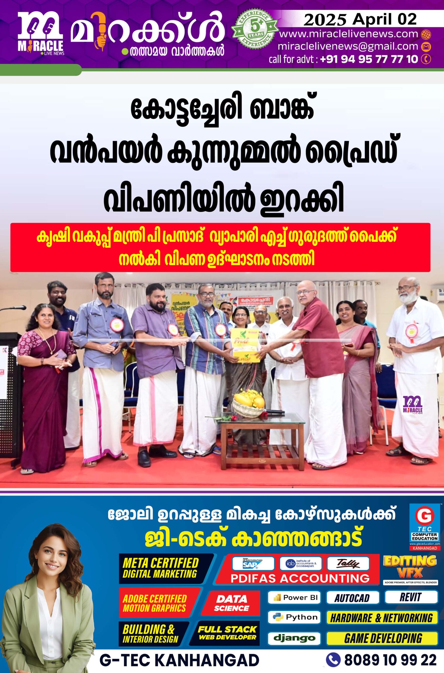 കാഞ്ഞങ്ങാട് : സംസ്ഥാന സര്‍ക്കാരിന്റെ സുഭിക്ഷ കേരളം പദ്ധതിയുടെയും,സഹകരണ വകുപ്പ് നേതൃത്വം നല്‍കുന്ന ഞങ്ങളും കൃഷിയിലേക്ക് എന്ന ദൗത്യത്തിന്റെയും ഭാഗമായി സഹകരണം മേഖലയോടൊപ്പം സാമൂഹ്യ സംസ്‌കാരിക മേഖലയിലും കൃത്യമായ ഇടപെടല്‍ നടത്തി ഏഴു പതിറ്റാണ്ടുകള്‍ പിന്നിട്ട കോട്ടച്ചേരി സര്‍വീസ് സഹകരണ ബാങ്ക് വേലശ്വരം വയലില്‍ ഒരുക്കിയ വന്‍പയര്‍ കൃഷിയുടെ വിളവെടുപ്പില്‍ നിന്നും ഉല്പാദിപ്പിച്ച കുന്നുമ്മല്‍ പ്രൈഡ് വിപണിയില്‍ ഇറക്കി. സംസ്ഥാന കൃഷി വകുപ്പ് മന്ത്രി പി പ്രസാദ് വിപണ ഉദ്ഘാടനം നടത്തി.വ്യാപാരി എച്ച് ഗുരുദത്ത് പൈ ഏറ്റുവാങ്ങി. ഇ ചന്ദ്രശേഖരന്‍ എംഎല്‍എ അംഗ സമാശ്വാസ നിധി,അപകട ഇന്‍ഷുറന്‍സ് വിതരണം എന്നിവ വിതരണം ചെയ്തു. ബാങ്ക് പ്രസിഡന്റ് എം രാഘവന്‍ അധ്യക്ഷനായി.നഗരസഭാ ചെയര്‍പേഴ്‌സണ്‍ കെ വി സുജാത,അജാനൂര്‍ പഞ്ചായത്ത് പ്രസിഡണ്ട് ടി ശോഭ,ജില്ലാ പ്രിന്‍സിപ്പല്‍കൃഷി ഓഫീസര്‍ രാഘവേന്ദ്ര, അസിസ്റ്റന്റ് രജിസ്റ്റര്‍ മാരായ വി ചന്ദ്രന്‍, പി ലോഹിതാക്ഷന്‍,വാര്‍ഡ് കൗണ്‍സിലര്‍ എം ശോഭന, അഡ്വ.പി അപ്പുക്കുട്ടന്‍, അഡ്വ.കെ രാജ്‌മോഹന്‍, എം പൊക്ലന്‍, കെ വി രാഘവന്‍, എം സേതു,മുഹമ്മദ് മുറിയനാവി, കെ വി വിശ്വനാഥന്‍എന്നിവര്‍ സംസാരിച്ചു.ബാങ്ക് വൈസ് പ്രസിഡന്റ് വി ഗിനീഷ് സ്വാഗതവും സെക്രട്ടറി വി വി ലേഖ നന്ദിയുംപറഞ്ഞു.