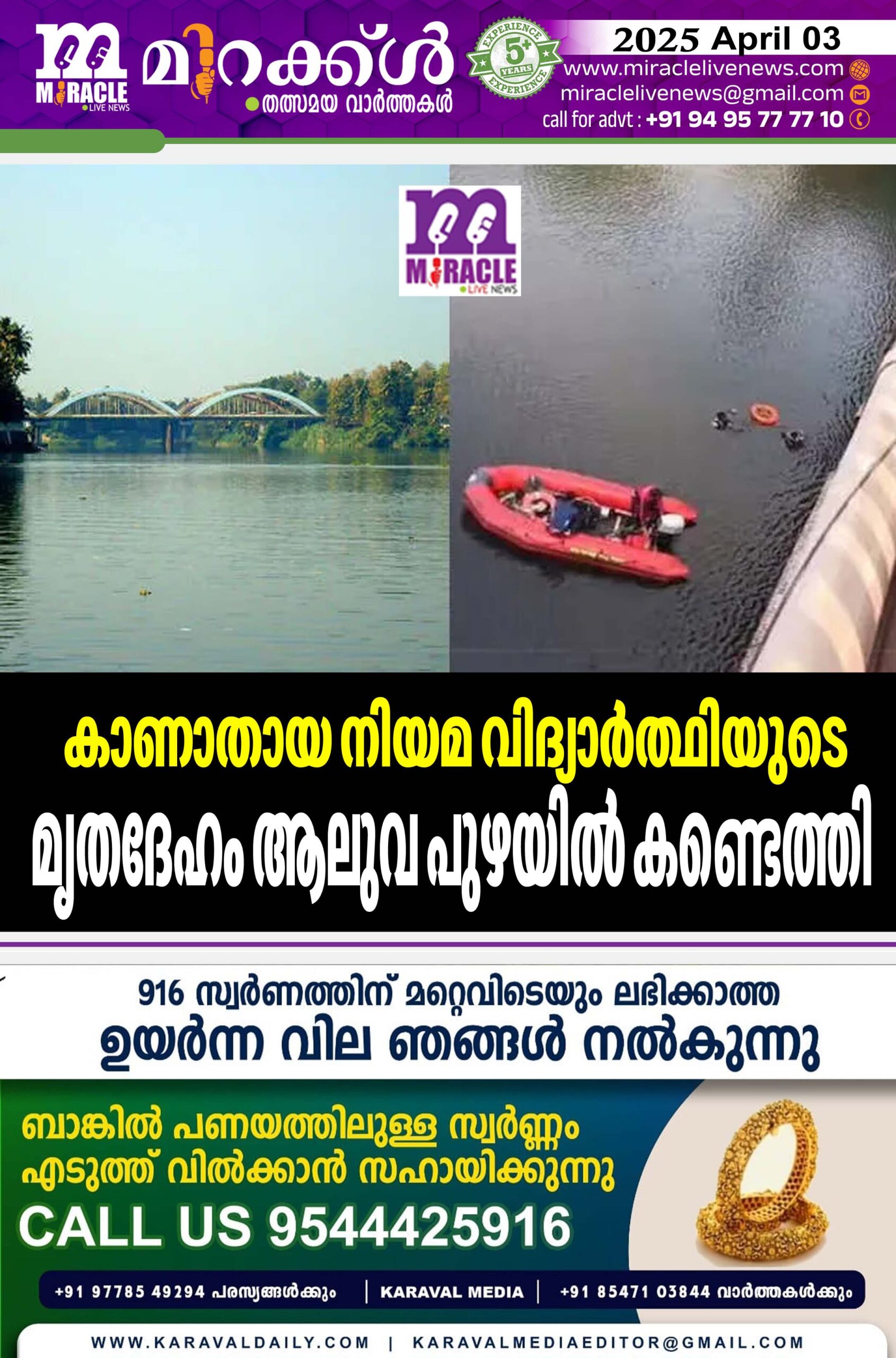 കാണാതായ നിയമ വിദ്യാര്ത്ഥിയുടെ മൃതദേഹം ആലുവ പുഴയില് കണ്ടെത്തി