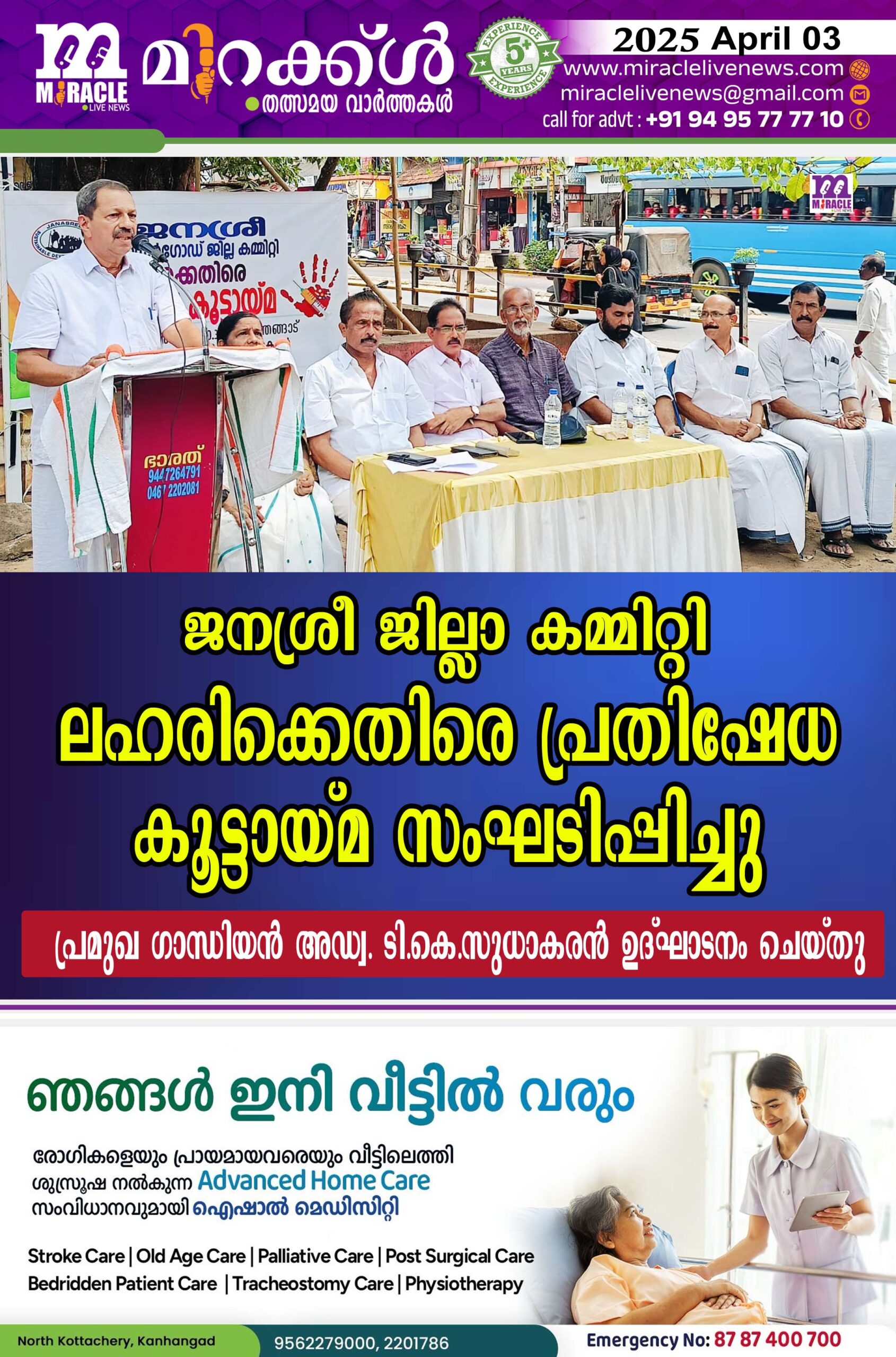 ജനശ്രീ ജില്ലാ കമ്മിറ്റി ലഹരിക്കെതിരെ പ്രതിഷേധ കൂട്ടായ്മ സംഘടിപ്പിച്ചു; പ്രമുഖ ഗാന്ധിയന് അഡ്വ. ടി.കെ. സുധാകരന് ഉദ്ഘാടനം ചെയ്തു.