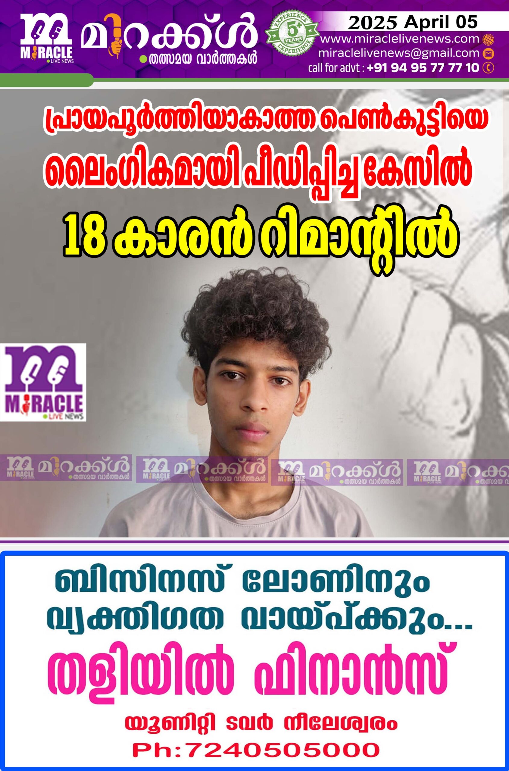 പ്രായപൂര്ത്തിയാകാത്ത പെണ്കുട്ടിയെ ലൈംഗികമായി പീഡിപ്പിച്ച കേസില് 18 കാരന് റിമാന്റില്