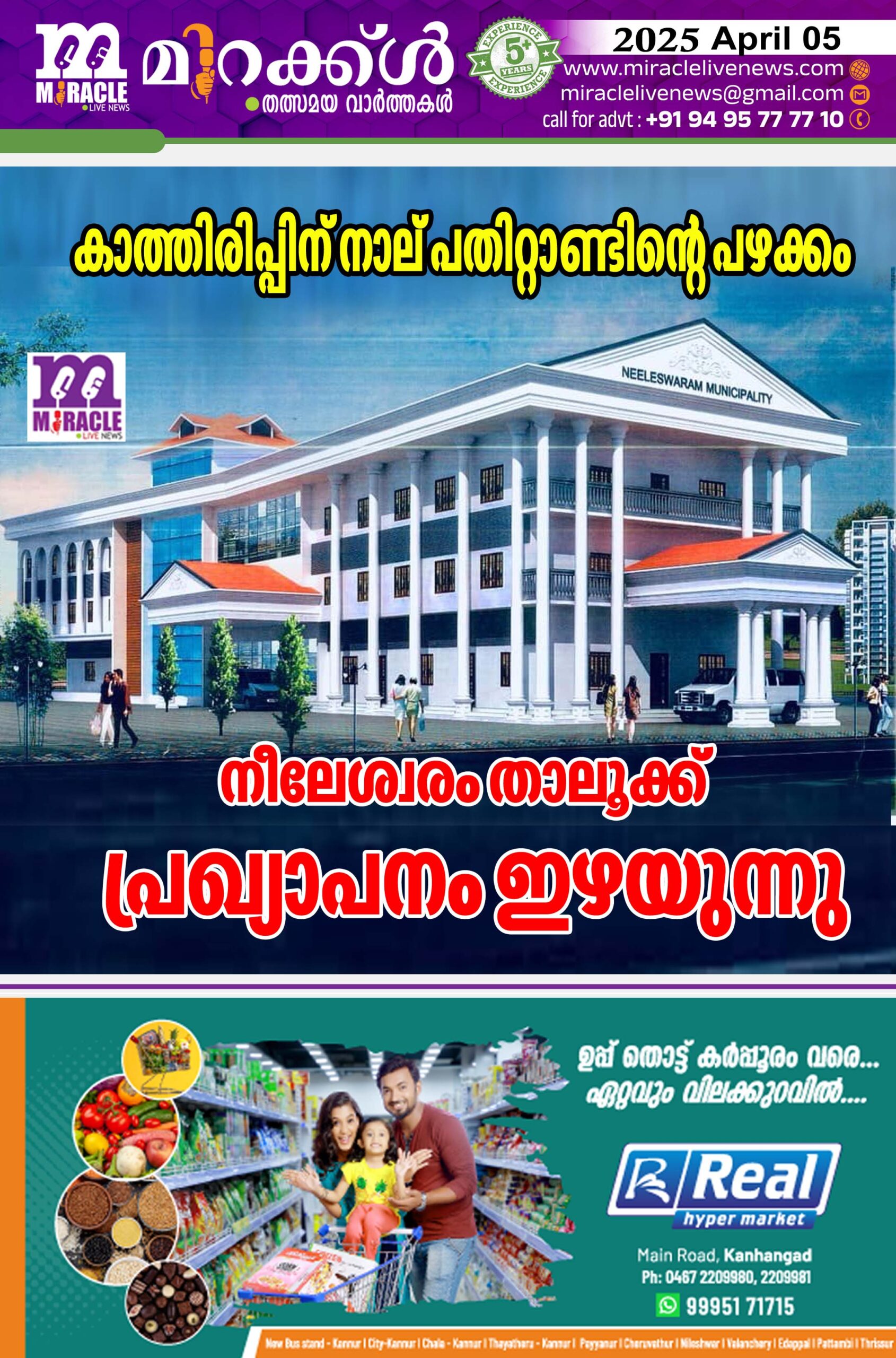 നീലേശ്വരം : നീലേശ്വരം താലൂക്ക് പ്രഖ്യാപനം ഇഴയുന്നു. നീലേശ്വരം ആസ്ഥാനമായി താലൂക്ക് രൂപീകരിക്കണമെന്ന നീണ്ടകാലത്തെ ആവശ്യത്തിന് പ്രതീക്ഷ നല്കി ജില്ലാ കളക്ടറുടെ നിര്ദേശപ്രകാരം ഹൊസ്ദുര്ഗ് താലൂക്ക് തഹസില്ദാര് ബന്ധപ്പെട്ട രാഷ്ട്രീയ പാര്ട്ടികളുടെ അഭിപ്രായം തേടുകയും ഐക്യകണ്ഠേന നീലേശ്വരം താലൂക്ക് യാഥാര്ത്ഥ്യമാക്കണമെന്ന് സര്ക്കാരിനോട് അഭ്യര്ത്ഥിക്കുകയും ചെയ്തിരുന്നു. നീലേശ്വരം താലൂക്ക് ഓഫീസിന് ആവശ്യമായ കെട്ടിടം ഉള്പ്പെടെ എല്ലാ സൗകര്യവും ചെയ്തു നല്കുവാന് തയ്യാറാണെന്ന് മുന്സിപ്പല് ചെയര്പേഴ്സണ് ടി വി ശാന്തയും കളക്ടര് ഉള്പ്പെടെയുള്ള ബന്ധപ്പെട്ടവരെ അറിയിച്ചിരുന്നു. പതിനഞ്ചോളം രാഷ്ട്രീയ പാര്ട്ടി പ്രതിനിധികള് പങ്കെടുത്ത യോഗം കഴിഞ്ഞു മാസം രണ്ട് കഴിഞ്ഞെങ്കിലും നീലേശ്വരം താലൂക്ക് പ്രഖ്യാപനം ഇഴയുകയാണ്.