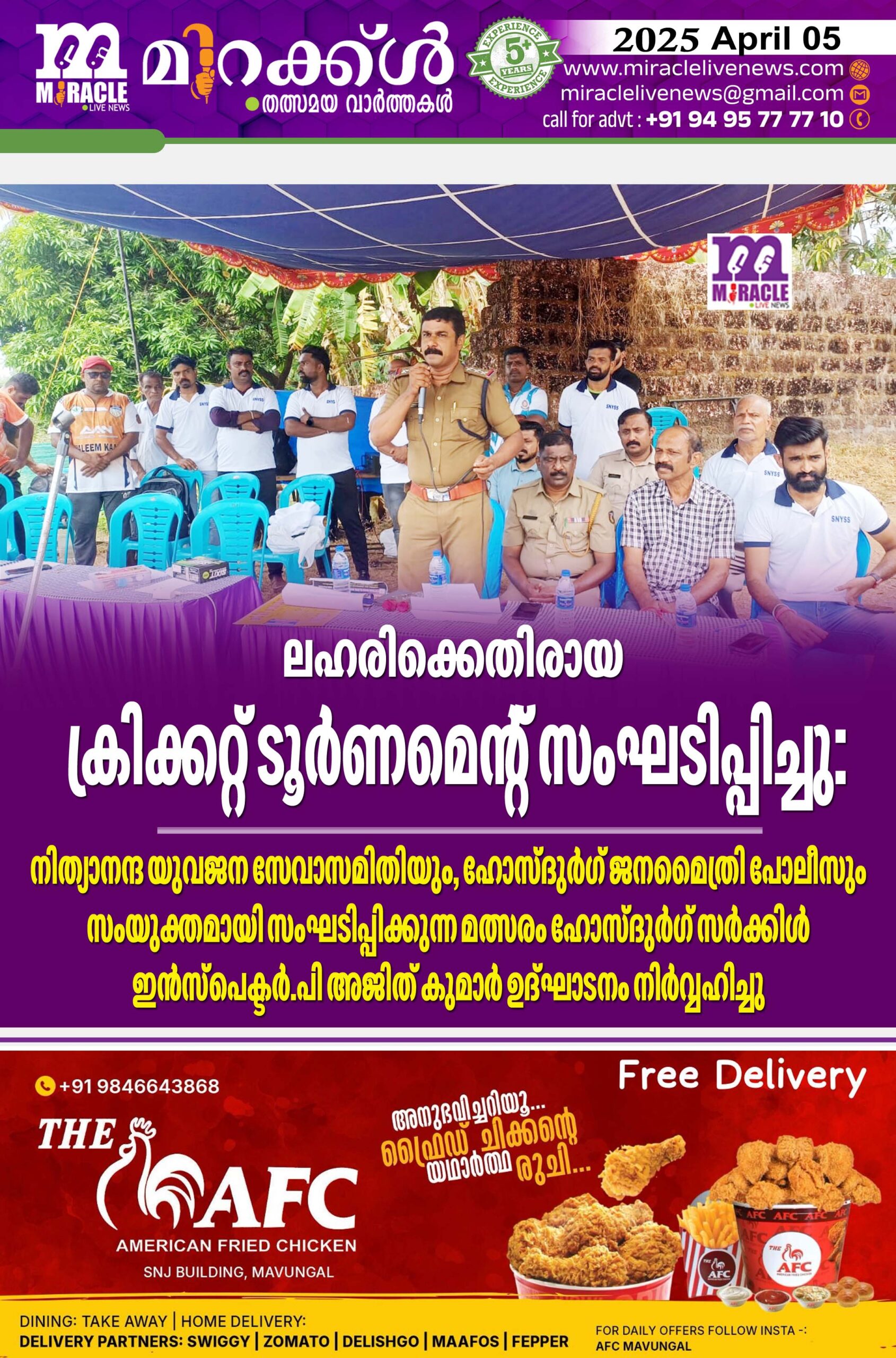 കാഞ്ഞങ്ങാട് :ശ്രീ നിത്യാനന്ദ യുവജന സേവാസമിതിയും, ഹോസ്ദുര്ഗ് ജനമൈത്രി പോലീസും സംയുക്തമായി സംഘടിപ്പിക്കുന്ന ലഹരിക്കെതിരായ ബോധവല്ക്കരണത്തിന്റെ ഭാഗമായുള്ളക്രിക്കറ്റ് ടൂര്ണമെന്റ് സംഘടിപ്പിച്ചു. ഹോസ്ദുര്ഗ് സര്ക്കിള് ഇന്സ്പെക്ടര്. പി അജിത് കുമാര് ഉദ്ഘാടനം നിര്വ്വഹിച്ചു . ലഹരിമുക്തമായ, ആരോഗ്യമുള്ള,കായികക്ഷമതയുള്ള യുവത്വത്തിന്റെ പ്രാധാന്യം പ്രസംഗത്തില് അദ്ദേഹം ചൂണ്ടിക്കാട്ടി. രക്ഷാധികാരി ജയദേവന് അധ്യക്ഷനായി.