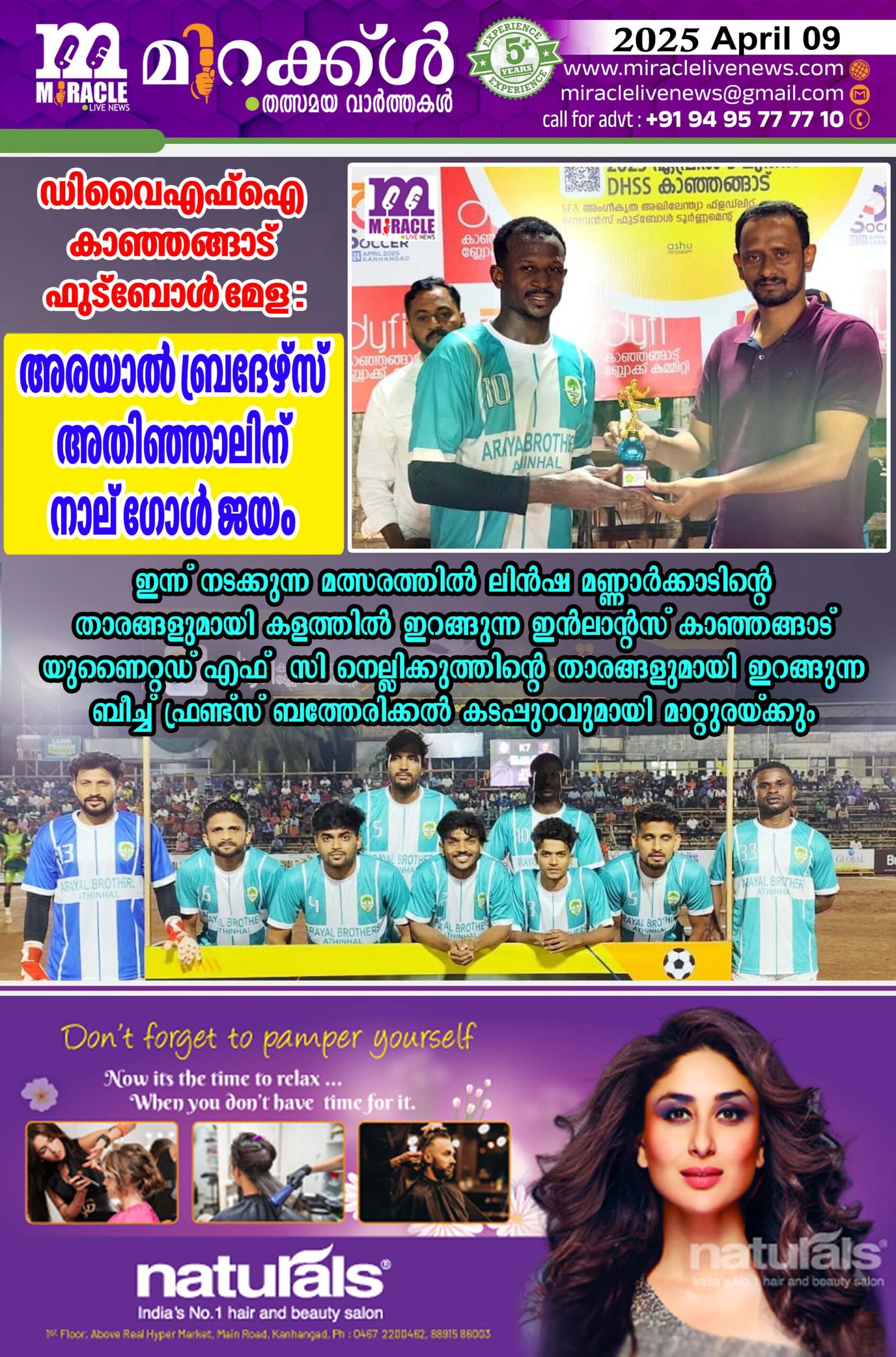 കളിയുടെ അഞ്ചാം ദിവസമായ 9- ാംതീയതി ബുധനാഴ്ച രാത്രി 8മണിക്ക് നടക്കുന്ന വാശിയേറിയ മത്സരത്തില് ലിന്ഷ മണ്ണാര്ക്കാടിന്റെ താരങ്ങളുമായി കളത്തില് ഇറങ്ങുന്ന ഇന്ലാന്റസ് കാഞ്ഞങ്ങാട് യുണൈറ്റഡ് എഫ് സി നെല്ലിക്കുത്തിന്റെ താരങ്ങളുമായി ഇറങ്ങുന്ന ബീച്ച് ഫ്രണ്ട്സ് ബത്തേരിക്കല് കടപ്പുറവുമായി മറ്റുരയ്ക്കും.