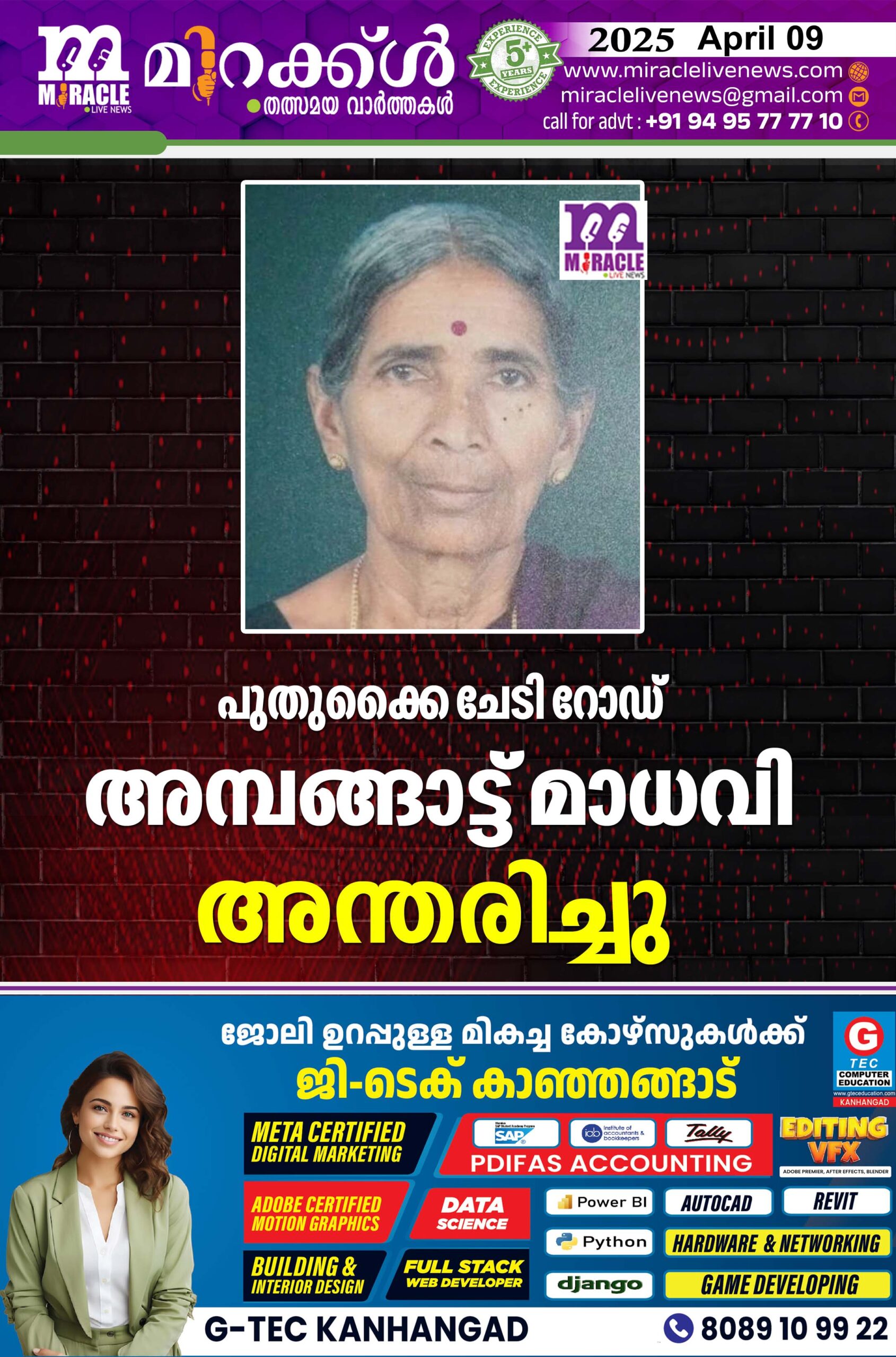 കാഞ്ഞങ്ങാട് : പുതുക്കൈ ചേടി റോഡ് അമ്പങ്ങാട്ട് മാധവി (74) അന്തരിച്ചു. ചൈനാക്ലേ റിട്ട. ജീവനക്കാരിയായിരുന്നു . ഭര്ത്താവ്: പരേതനായ അമ്പാടി. മക്കള്: സുനിത (കെസി സി പി ജീവനക്കാരി കരിന്തളം – തലയടുക്കം), അനിത, മുരളി .. (സിപിഐ (എം) ചൂട്ടം ബ്രാഞ്ചംഗം),അജിത . മരുമക്കള്: എ. നാരായണന് ( സി.പി.ഐ (എം) പാറക്കോല് ബ്രാഞ്ചംഗം), നാരായണന് (പെരിയ ) , രാജേന്ദ്രന് (ബാനം) ,പ്രീത (രാവണിശ്വരം). സഹോദരങ്ങള്: നാരായണന് , ബാലന്, കുഞ്ഞിരാമന്, പരേതരായ കൊട്ടന്,നാരായണി.