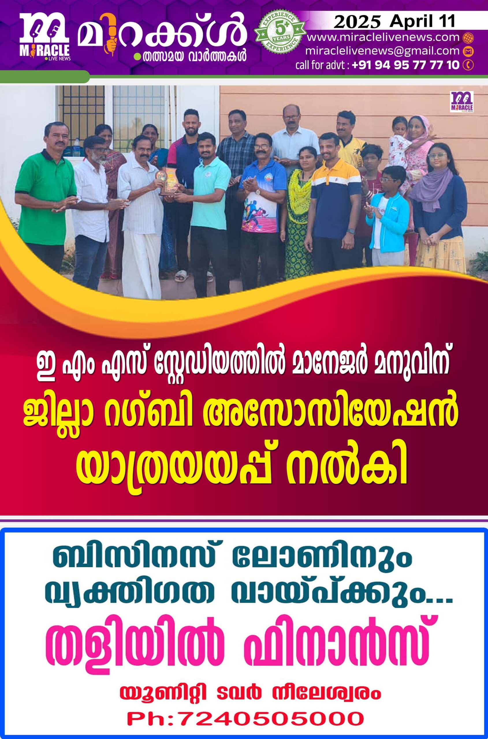 ഇ എം എസ് സ്റ്റേഡിയത്തില്‍ മാനേജര്‍ മനുവിന് ജില്ലാ റഗ്ബി അസോസിയേഷന്‍ യാത്രയയപ്പ് നല്‍കി