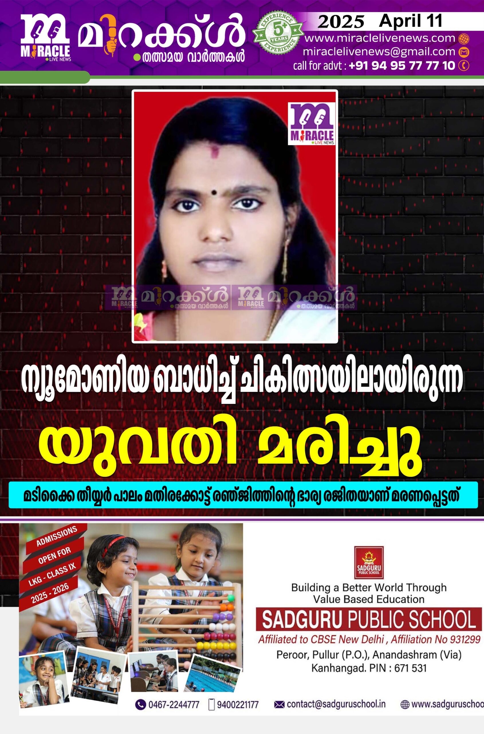 ന്യൂമോണിയ ബാധിച്ച് ചികിത്സയിലായിരുന്ന യുവതി മരിച്ചു; മടിക്കൈ തീയ്യര് പാലം മതിരക്കോട്ട് രഞ്ജിത്തിന്റെ ഭാര്യ രജിതയാണ് മരണപ്പെട്ടത്