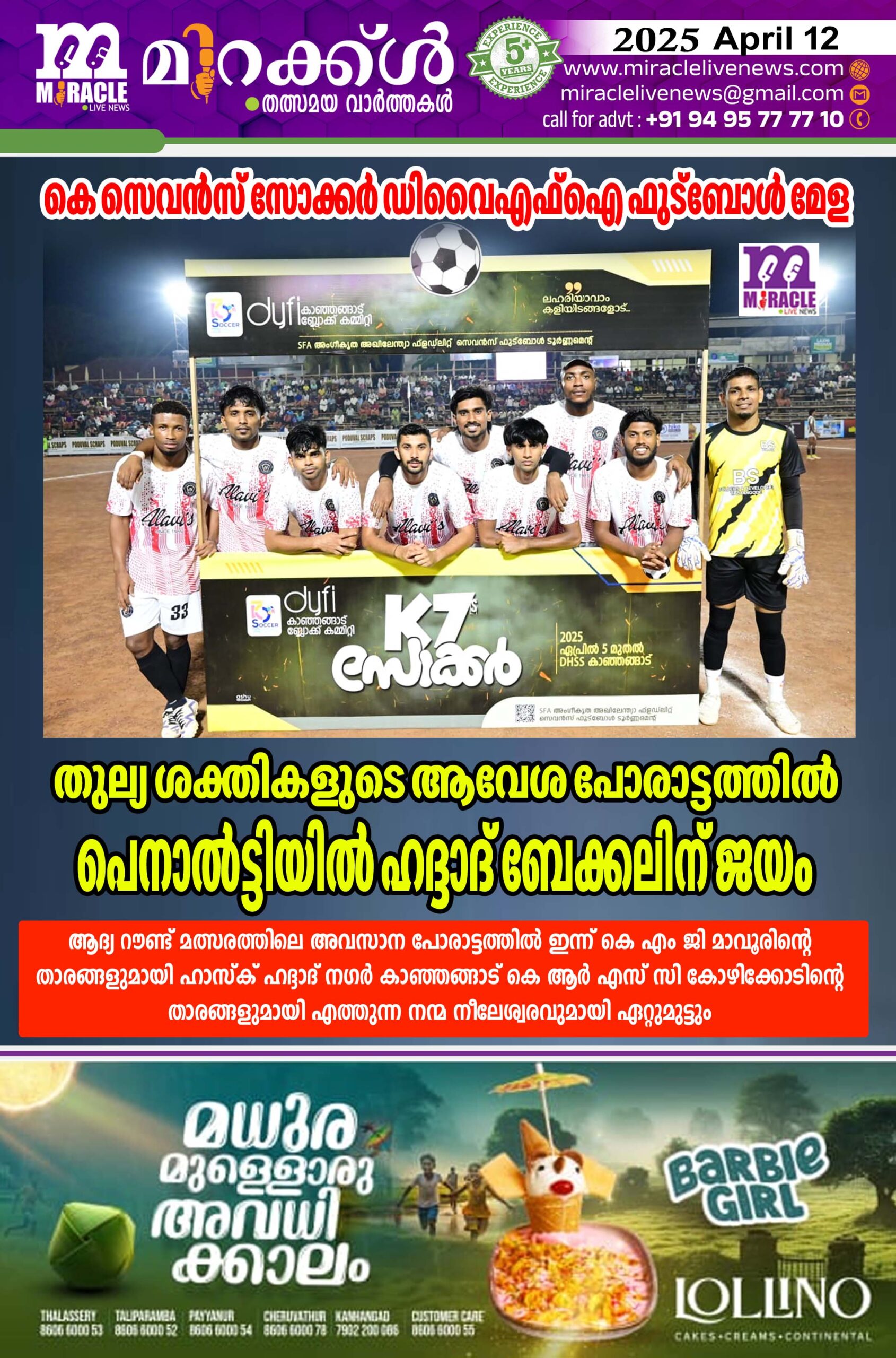 പെനാല്റ്റിയുടെ ആദ്യ അഞ്ച് അവസരങ്ങളും ഇരു ടീമുകളും തുല്യമായതിനെ തുടര്ന്ന് കളിയിലൂട നീളം മികച്ച സേവുകള് നടത്തിയ ഇരു ടീമുകളുടെയും ഗോളിമാര് തമ്മിലുള്ള അടിയില് ബ്രദേഴ്സ് കാഞ്ഞങ്ങാടിന്റെ കിക്ക് ഗോള് പോസ്റ്റിന് പുറത്തുപോയതിനെ തുടര്ന്ന് ഹദ്ദാദ് ബേക്കല് ജേതാക്കളായി.കളിയിലൂട നീളം മികച്ച സേവുകള് നടത്തിയ ബ്രദേഴ്സ് കാഞ്ഞങ്ങാടിന്റെ ഗോള്വല കാത്ത ലിയാഖത്ത് ആണ് ഇന്നലത്തെ കളിയിലെ മികച്ച താരമായി തിരഞ്ഞെടുക്കപ്പെട്ടത്.താരത്തിന് എസ് എഫ് എ ജില്ല സെക്രട്ടറി എം സേതു ഉപഹാരം നല്കി.മത്സരം തുടങ്ങുന്നതിന് മുന്നോടിയായി കാഞ്ഞങ്ങാട് ബ്ലോക്ക് പഞ്ചായത്ത് പ്രസിഡന്റ് കെ മണികണ്ഠന്,ദേവസ്വം ബോര്ഡ് മേഖലാ ചെയര്മാന് കെ. വി. സുരേന്ദ്രന് ഗ്രൗണ്ട് കമ്മിറ്റി വൈസ് ചെയര്മാന് കെ വി രതീഷ്,ഡിവൈഎഫ്ഐ ബ്ലോക്ക് കമ്മിറ്റി അംഗം രാജേഷ് കാറ്റാ ടി എന്നിവര് കളിക്കാരുമായി പരിചയപ്പെട്ടു.ഇന്ന് നടക്കുന്ന ആദ്യ റൗണ്ട് മത്സരത്തിലെ അവസാന പോരാട്ടത്തില് കെ എം ജി മാവൂരിന്റെ താരങ്ങളുമായി ഹാസ്ക് ഹദ്ദാദ് നഗര് കാഞ്ഞങ്ങാട് കെ ആര് എസ് സി കോഴിക്കോടിന്റെ താരങ്ങളുമായി എത്തുന്ന നന്മ നീലേശ്വരവുമായി ഏറ്റുമുട്ടും.വിദേശ താരങ്ങളും ദേശീയ താരങ്ങളും കളത്തില് ഇറങ്ങുന്ന ആവേശകരമായ മത്സരം എട്ടുമണിക്ക് ആരംഭിക്കും. മത്സരത്തിന് മുന്നോടിയായി നാദക്കോട്ട് ദേവസ്ഥാനത്തെ 45 വനിതകള് അണിനിരക്കുന്ന പൂരക്കളിഅരങ്ങേറും.