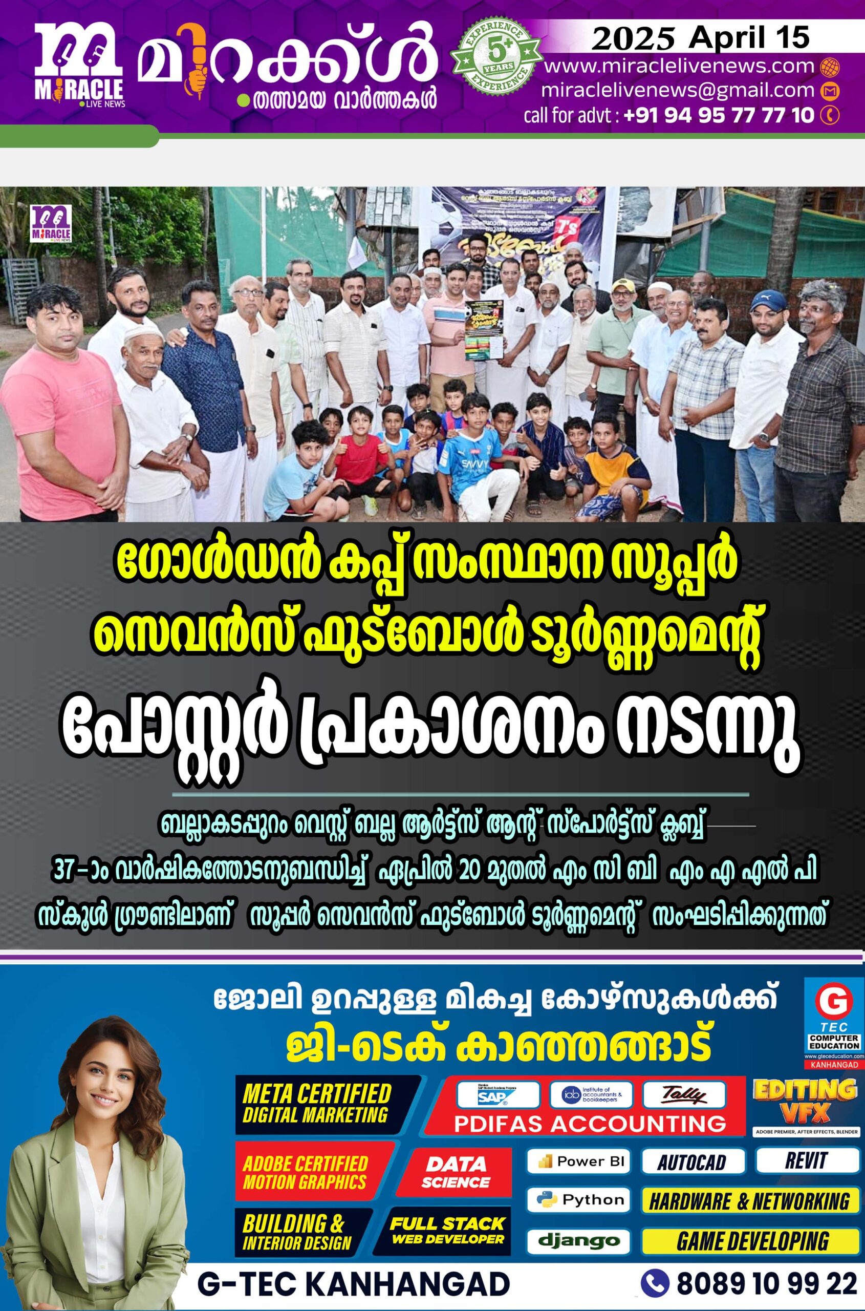 ഗോള്‍ഡന്‍ കപ്പ് സംസ്ഥാന സൂപ്പര്‍ സെവന്‍സ് ഫുട്‌ബോള്‍ ടൂര്‍ണ്ണമെന്റ് പോസ്റ്റര്‍ പ്രകാശനം നടന്നു ; ബല്ലാകടപ്പുറം വെസ്റ്റ് ബല്ല ആര്‍ട്ട്‌സ് ആന്റ് സ്‌പോര്‍ട്ട്‌സ് ക്ലബ്ബ് 37-ാം വാര്‍ഷികത്തോടനുബന്ധിച്ച് ഏപ്രില്‍ 20 മുതല്‍ എം സി ബി എം എ എല്‍ പി സ്‌കൂള്‍ ഗ്രൗണ്ടിലാണ് സൂപ്പര്‍ സെവന്‍സ് ഫുട്‌ബോള്‍ ടൂര്‍ണ്ണമെന്റ് സംഘടിപ്പിക്കുന്നത്