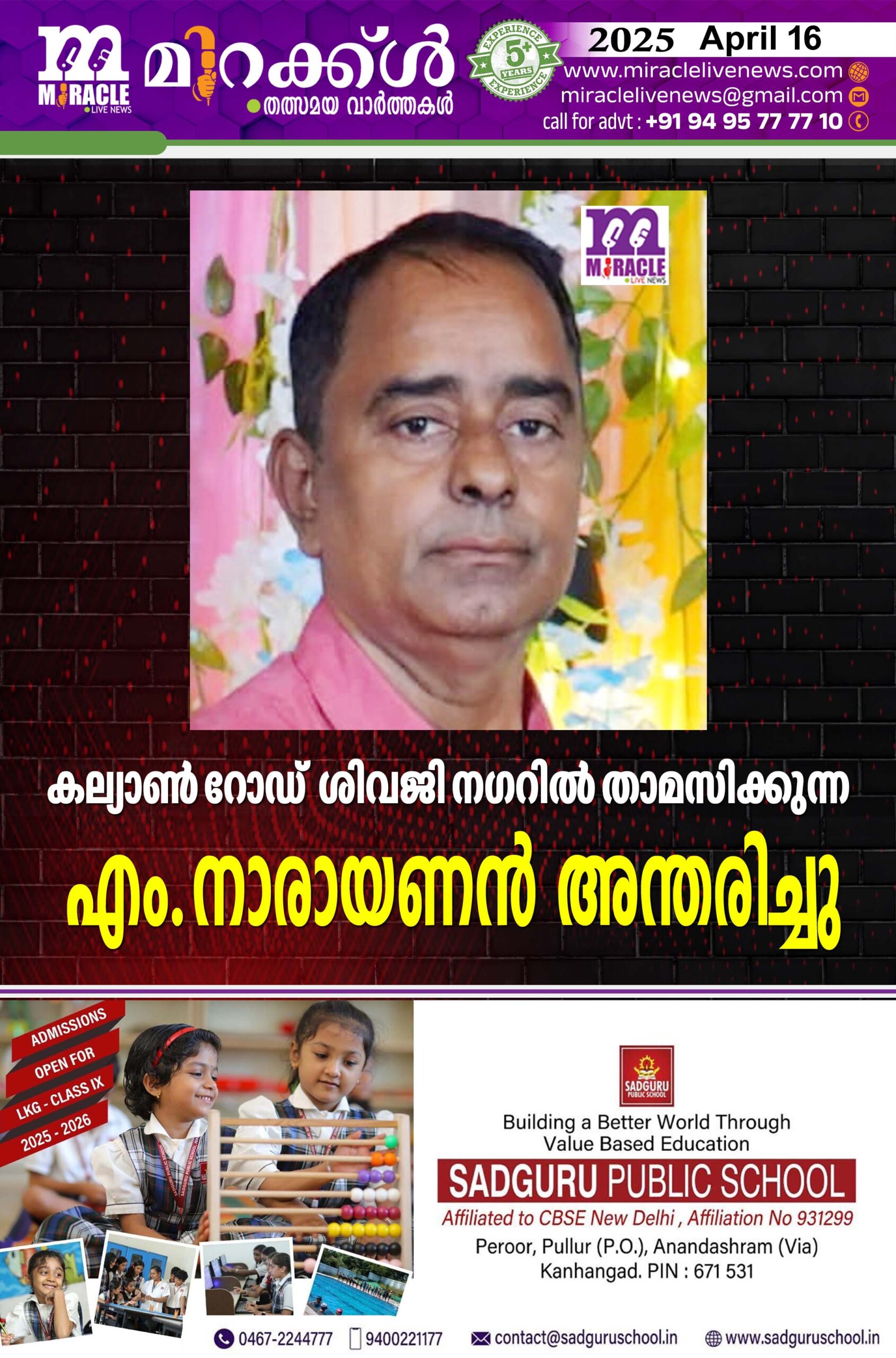 കല്യാണ്‍ റോഡ് ശിവജി നഗറില്‍ താമസിക്കുന്ന എം.നാരായണന്‍ അന്തരിച്ചു