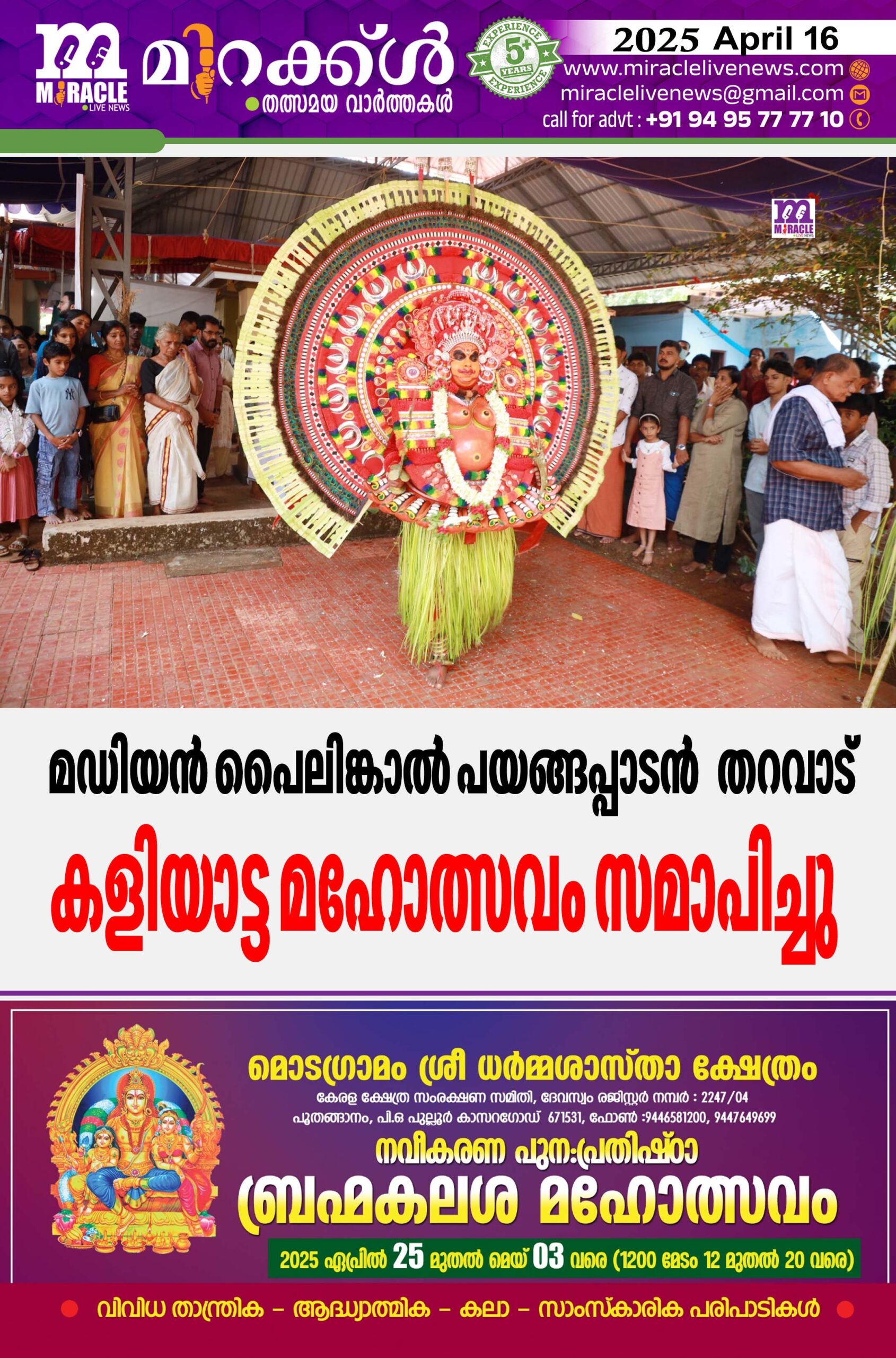 കാഞ്ഞങ്ങാട്: മഡിയന് ക്ഷേത്രപാലക ക്ഷേത്രത്തിന്റെ അധീനതയില് വരുന്ന മടിയന് പൈലിങ്കാല് പയങ്ങപ്പാടന് തറവാട് കളിയാട്ട മഹോത്സവത്തിന് ഭക്തിയുടെ നിറവില് സമാപനമായി. കളിയാട്ട മഹോത്സവത്തിന്റെ ഭാഗമായി കാര്ന്നോന് തെയ്യം, വിഷ്ണുമൂര്ത്തി, തറവാട്ട് അമ്മയായ പടിഞ്ഞാറ്റ ചാമുണ്ഡിയുടെ പുറപ്പാട്, ഗുളികന് തെയ്യത്തിന്റെ പുറപ്പാട് എന്നിവയും നടന്നു. കളിയാട്ട മഹോത്സവത്തിന് എത്തിച്ചേര്ന്ന മുഴുവന് ഭക്തജനങ്ങള്ക്കും ഭഗവത്പ്രസാദമായി അന്നദാനവുംനല്കി.