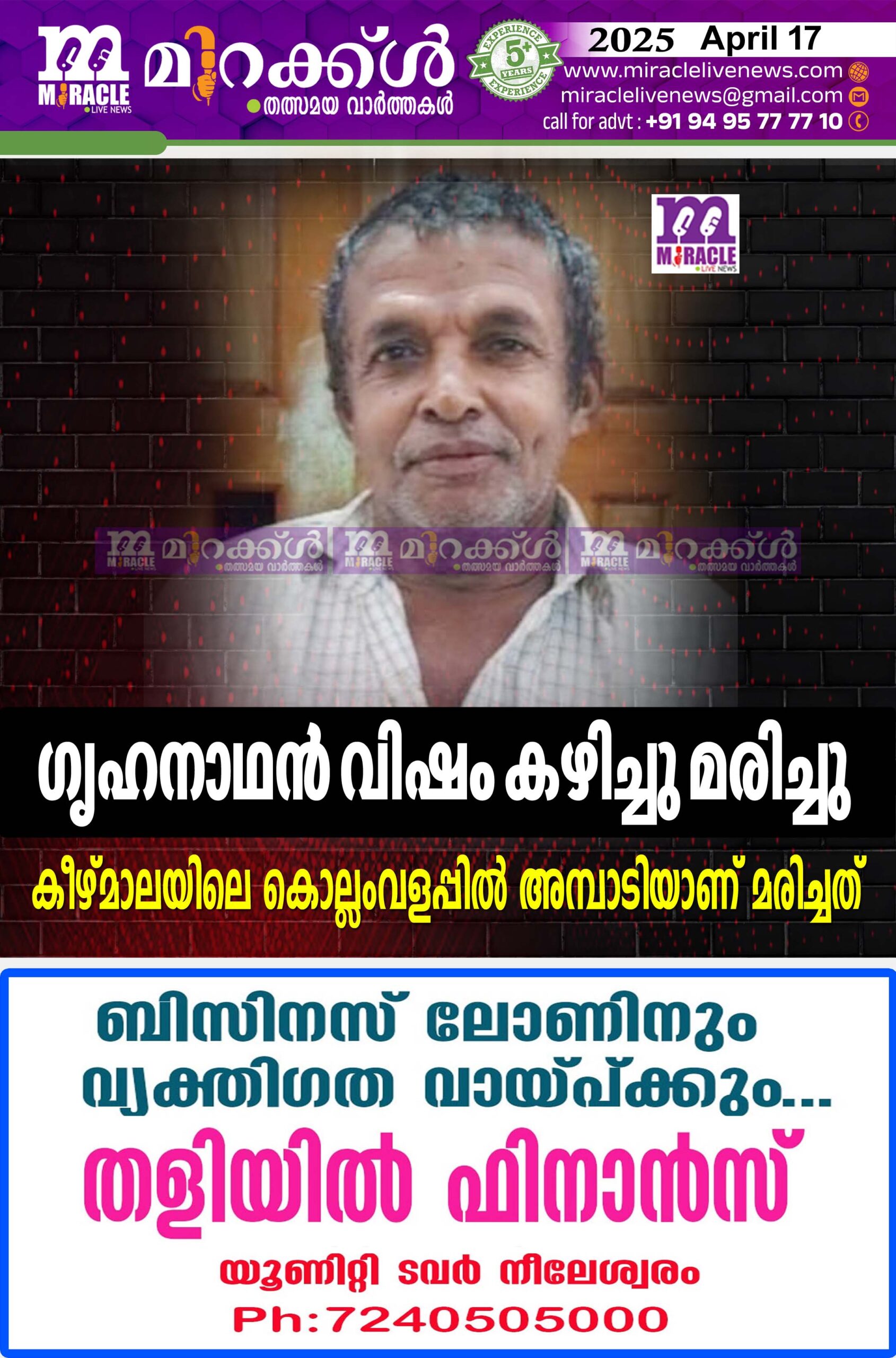ഗൃഹനാഥന്‍ വിഷം കഴിച്ചു മരിച്ചു; കീഴ്മാലയിലെ കൊല്ലംവളപ്പില്‍ അമ്പാടിയാണ് മരിച്ചത്
