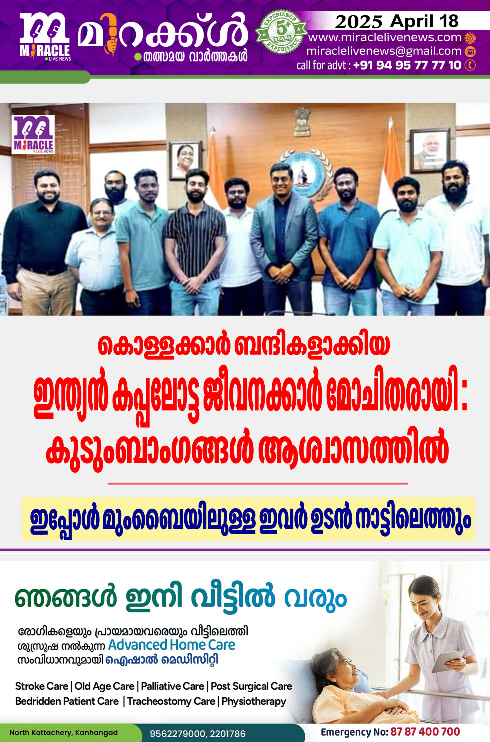 ബന്ദികളാക്കപ്പെട്ടവരില് കാസര്കോട് ജില്ലയില് ഒരാള് ഉണ്ടെന്ന തിനാല് ജില്ലയില് മാത്രം വിവരം ഒതുങ്ങി പ്പോവുകയായിരുന്നു. മാസം തികയാന് ഏതാനും ദിവസം ബാക്കിയിരിക്കെ കഴിഞ്ഞ ദിവസമാണ് സുരക്ഷിതമായി ഇവര് മോചിതാരയെന്ന വിവരം ആശങ്കയിലായിരുന്ന കുടുംബാംഗങ്ങള്ക്ക് ആശ്വാസമായെത്തിയത്. മോചിതരായ 10 പേരും ബന്ധപ്പെട്ടവരുടെ നിര്ദേശമനുസരിച്ച് കേന്ദ്ര ഷിപ്പിങ് മന്ത്രാലയത്തിന് കീഴിലുള്ള മുംബൈയിലെ ഡയരക്ടറേറ്റ് ജനറല് ഓഫ് ഷിപ്പിങ് (ഡി.ജി. ഷിപ്പിങ്) മുന്പാകെ ഹാജരായി. ബന്ദികളാക്കപ്പെട്ട 10 പേരില് 7 പേരും ഇന്ത്യക്കാര്. മൂന്ന് പേര് റുമാനിയക്കാര് ആയിരുന്നു.