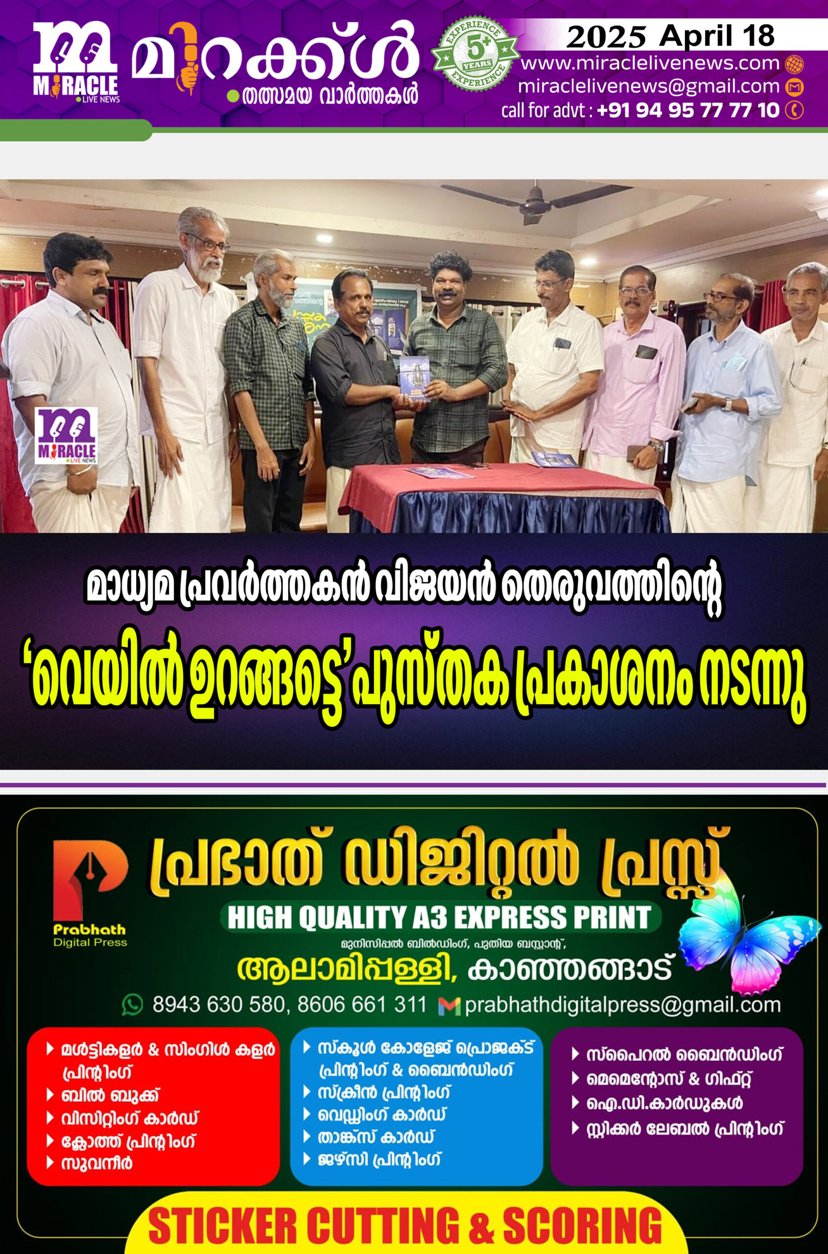 മാധ്യമപ്രവര്ത്തകന് വിജയന്തെരുവത്തിന്റെ ‘വെയില് ഉറങ്ങട്ടെ’ പുസ്തക പ്രകാശനം നടന്നു