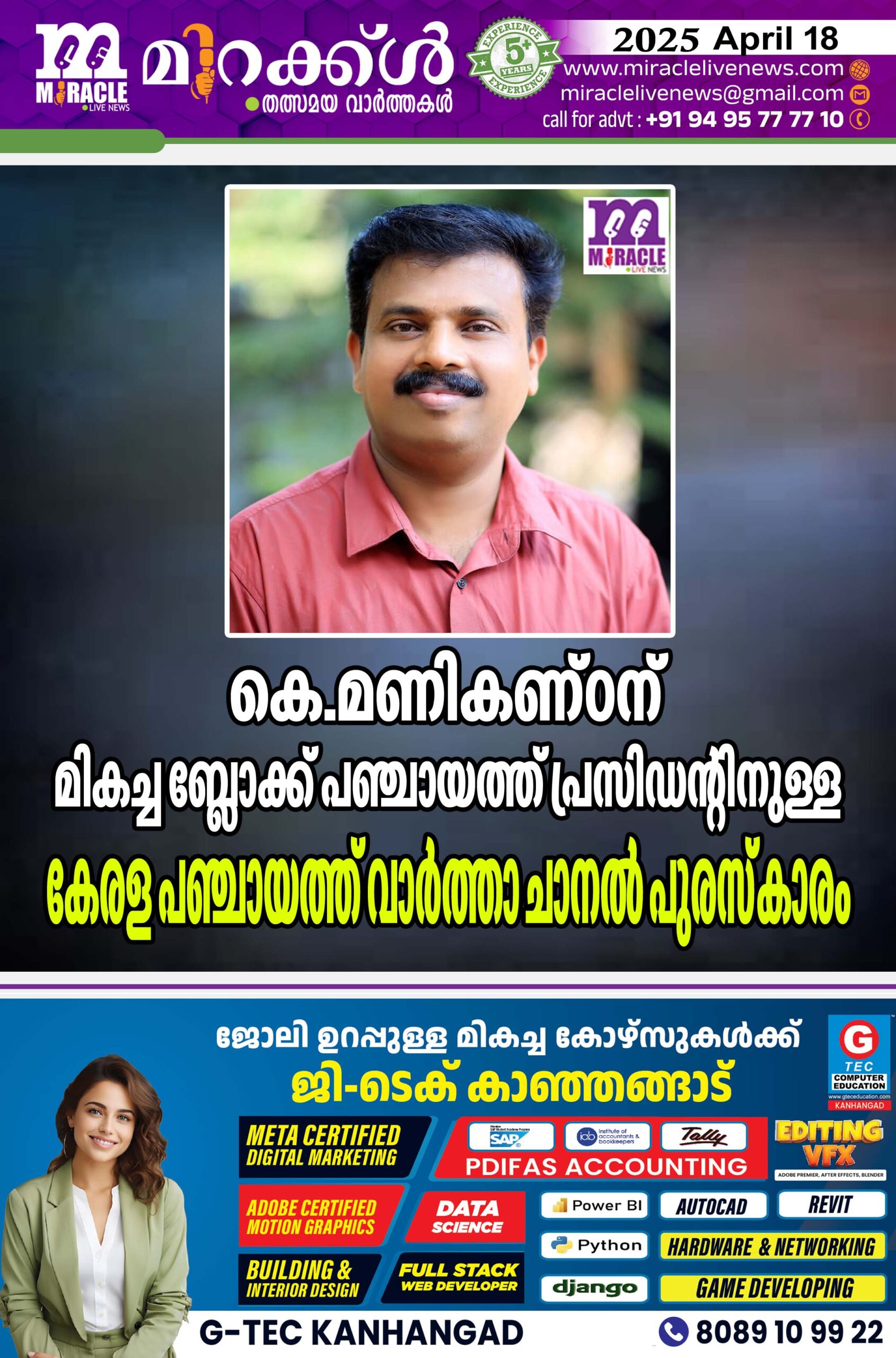 തൃശൂര്: കേരളത്തിലെ മികച്ച ബ്ലോക്ക് പഞ്ചായത്ത് പ്രസിഡണ്ടിനുള്ള കേരള പഞ്ചായത്ത് വാര്ത്താ ചാനല് പുരസ്കാരം കാഞ്ഞങ്ങാട് ബ്ലോക്ക് പഞ്ചായത്ത് പ്രസിഡണ്ട് കെ.മണികണ്ഠന്. തൃശൂര് ടൗണ് ഹാളില് വെച്ച് നടന്ന കേരള പഞ്ചായത്ത് വാര്ത്താ ചാനല് പുരസ്കാരോത്സവത്തില് അവാര്ഡ് പ്രഖ്യാപിച്ചു. 25,000 രൂപ ക്യാഷ് അവാര്ഡും ശില്പവും പ്രശസ്തിപത്രവും അടങ്ങുന്നതാണ് പുരസ്കാരം.