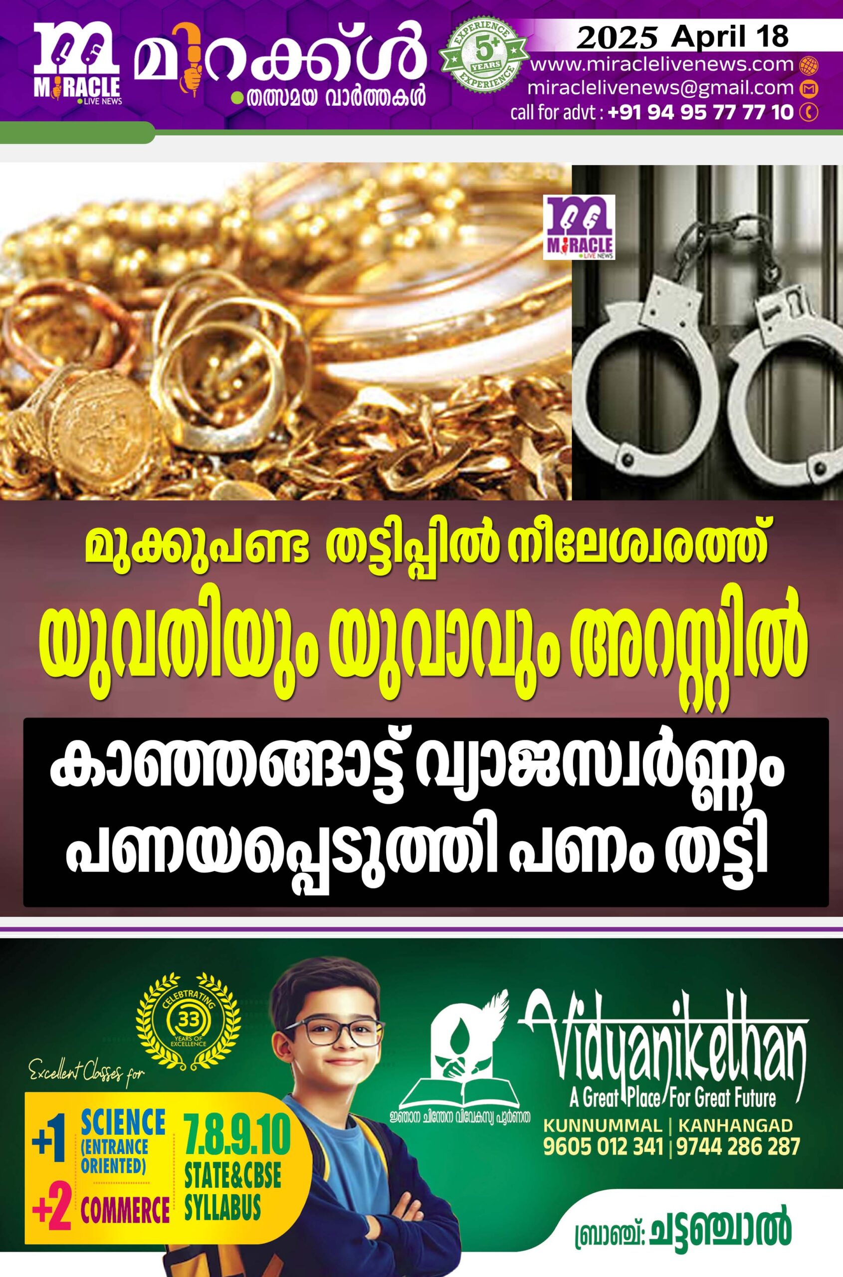 നീലേശ്വരം: ജില്ലയില് വീണ്ടും മുക്കുപണ്ട തട്ടിപ്പ്. കരിന്തളം സര്വീസ് സഹകരണ ബാങ്കില് മുക്കുപണ്ടം പണയപ്പെടുത്തി പണം തട്ടാന് ശ്രമിച്ച രണ്ട് പേരെ നീലേശ്വരം എസ് ഐ കെ വി രതീശനും സംഘവും അറസ്റ്റ് ചെയ്തു. കൊല്ലം പാറവാളൂരിലെ പ്രസാദിന്റെ ഭാര്യ എ വി രമ്യ, കണ്ണൂര് സ്വദേശിയും നീലേശ്വരത്ത് താമസക്കാരനുമായ ഷിജിത്ത് എന്നിവരാണ് അറസ്റ്റിലായത്. വ്യാഴാഴ്ചയാണ്